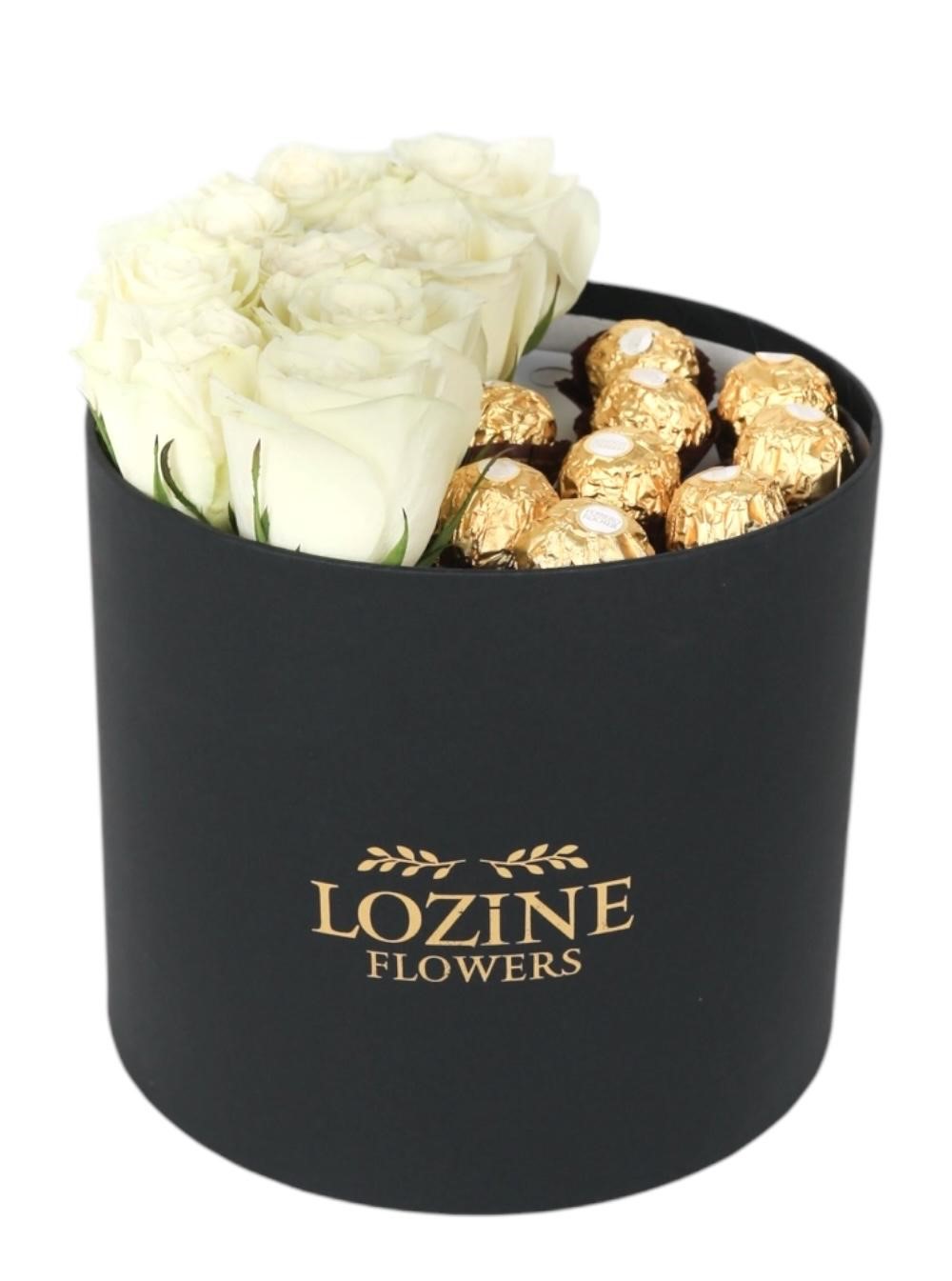 Kutuda 9 adet beyaz gül ve 9 adet ferrero rocher çikolata bulunmaktadır.