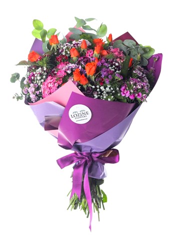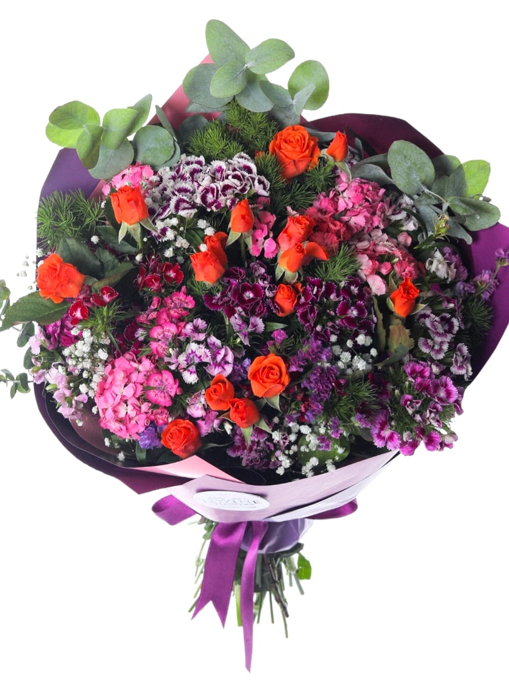 Bukette turuncu çardak gül ve hüsnüyusuflar bulunmaktadır.