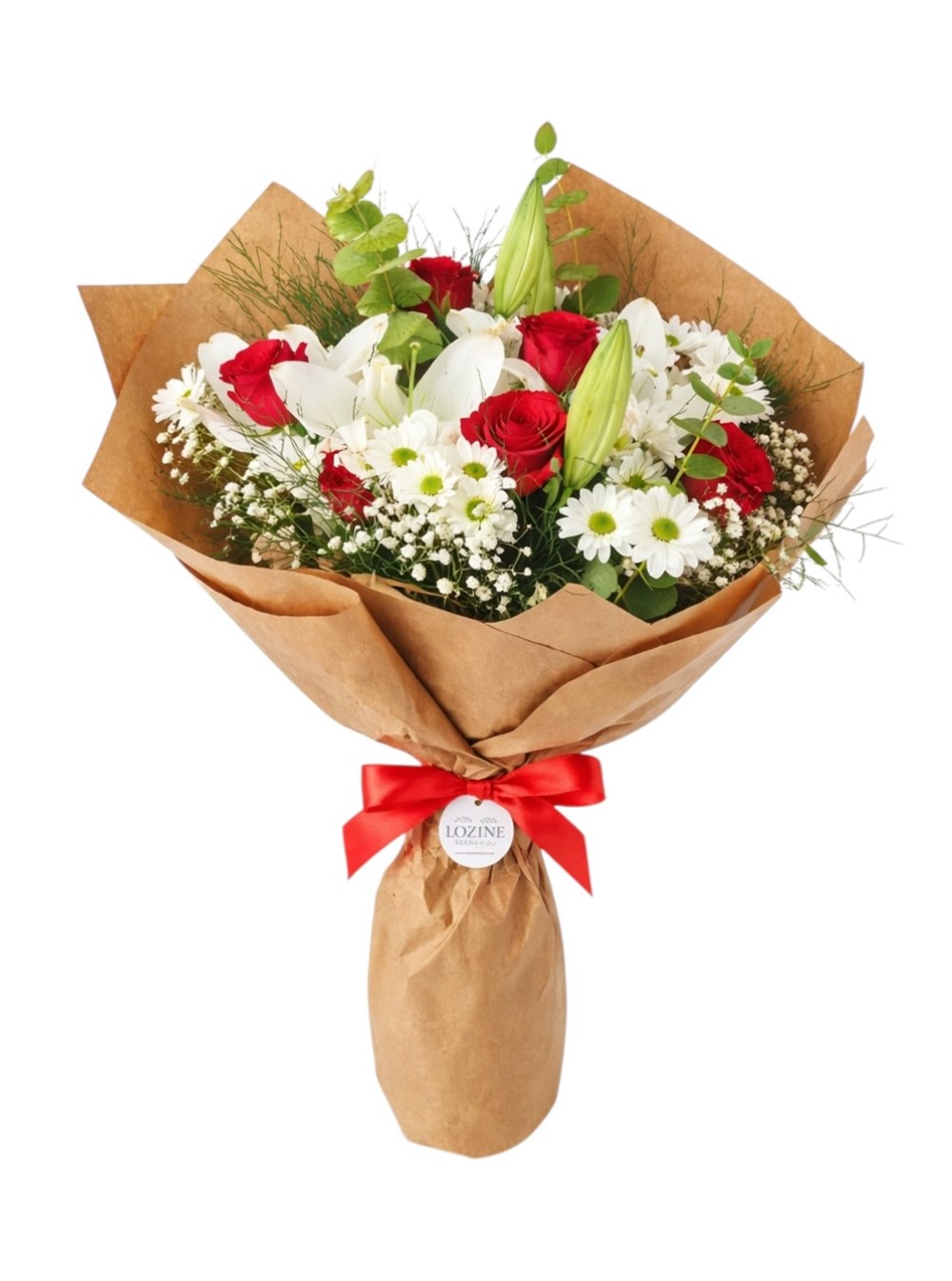 Bukette lilyum, gül ve papatya bulunmaktadır.