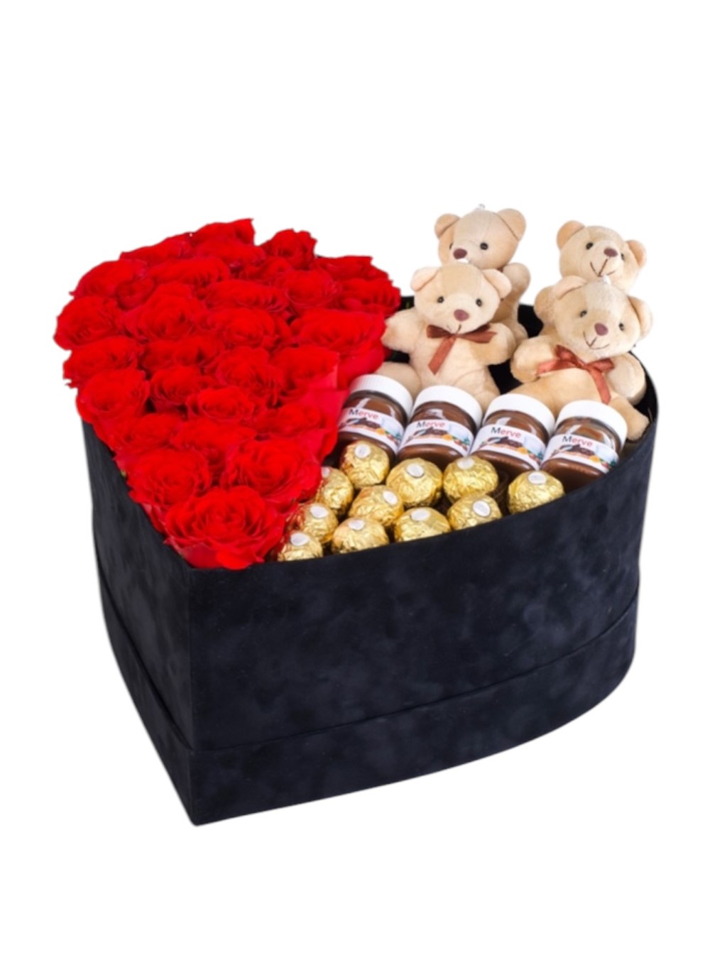 28 - 30 adet ithal kırmızı gül, 4 adet 10 cm ayıcık , 11 adet ferrero rocher çikolata ve 4 adet 25 gram mini nutella bulunmaktadır.