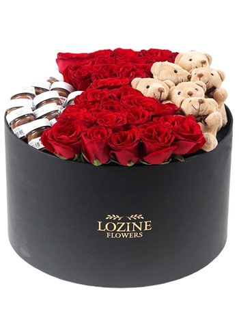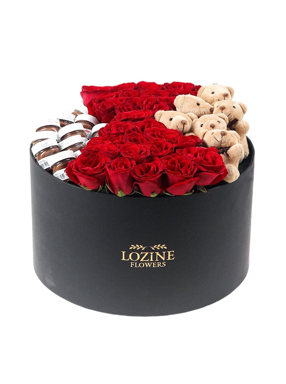 Kutuda 34-38 adet kırmızı gül 6 adet ayıcık ve 10 adet mini nutella bulunmaktadır.
