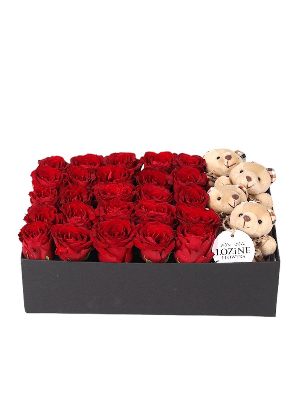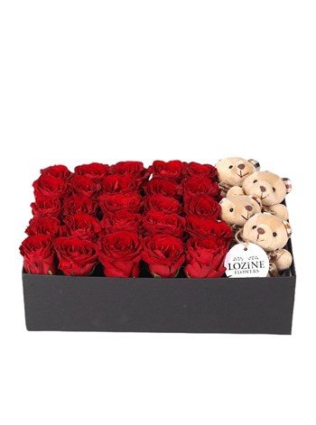 Kutuda 25 adet kırmızı gül ve 4 adet mini ayıcık bulunamktadır.