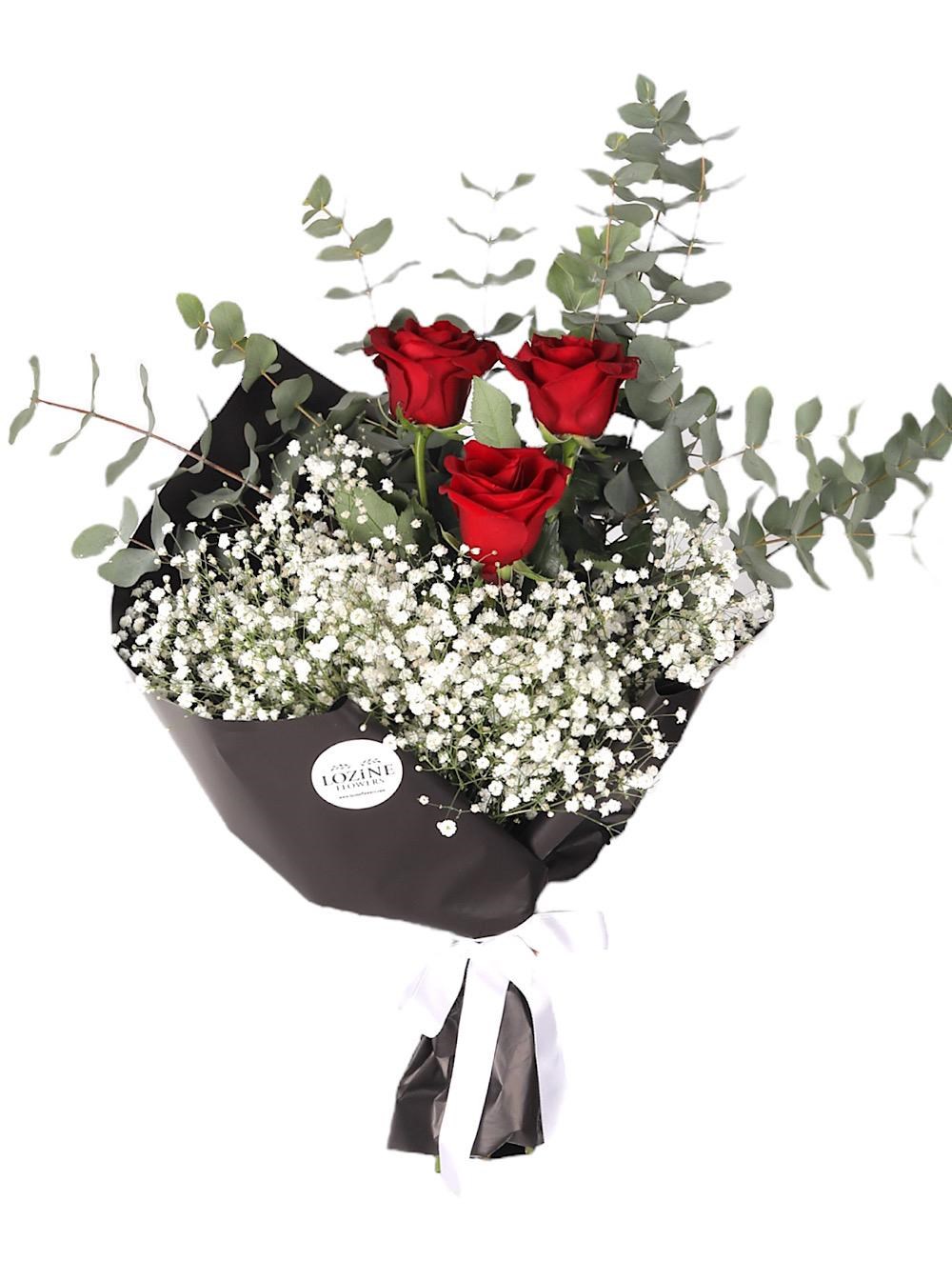 Bukette gypsophila, kırmızı gül ve çiçek süslemeleri bulunmaktadır.