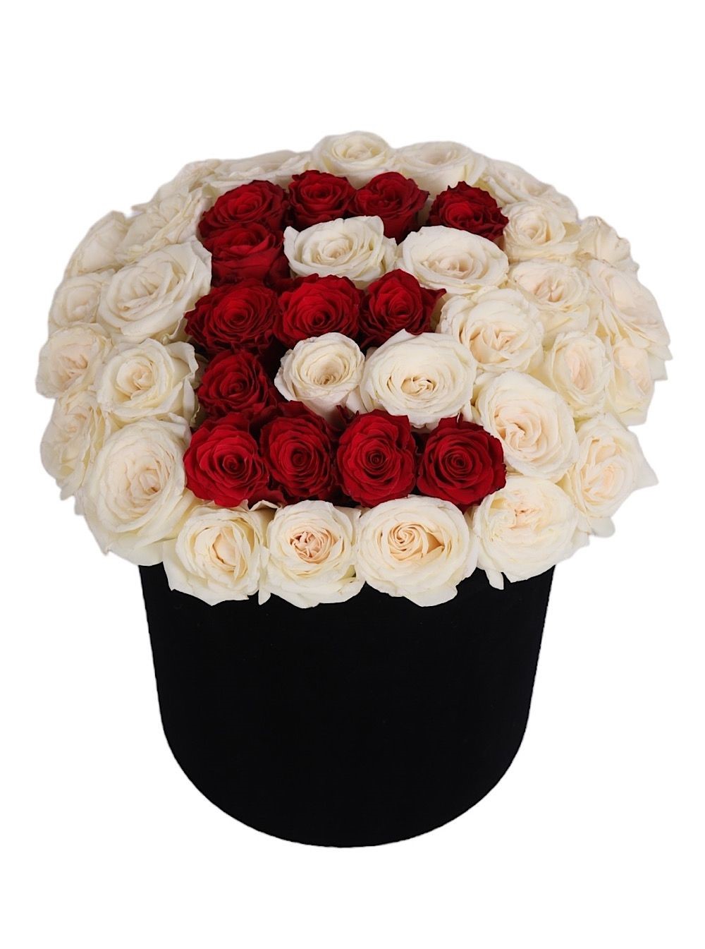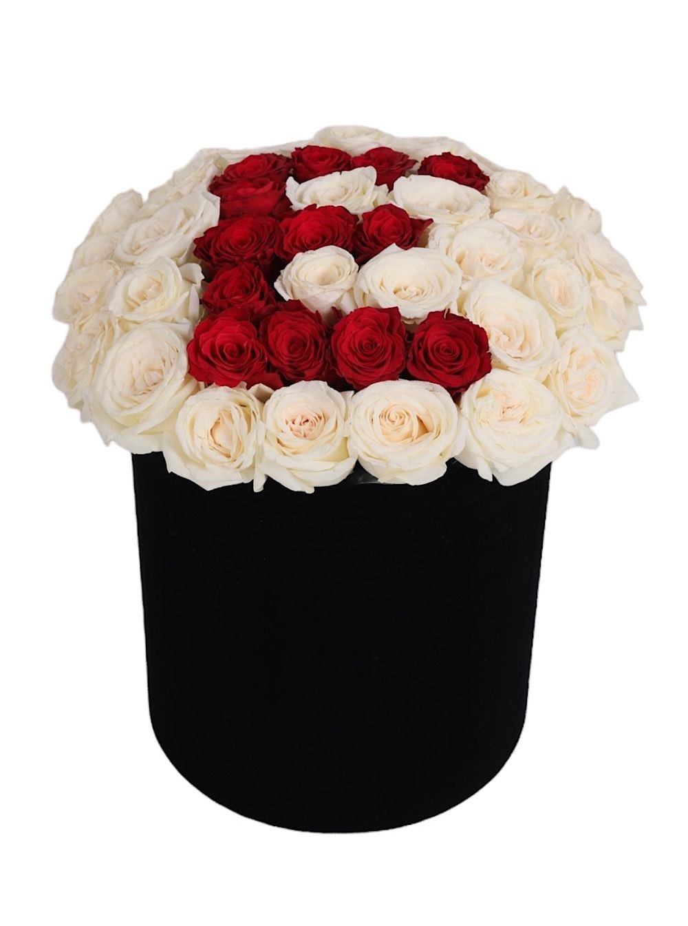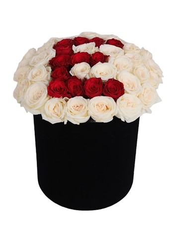 Kaliteli siyah kadife kutuda beyaz ve kırmızı güllerden hazırlanmış harf tasarımı