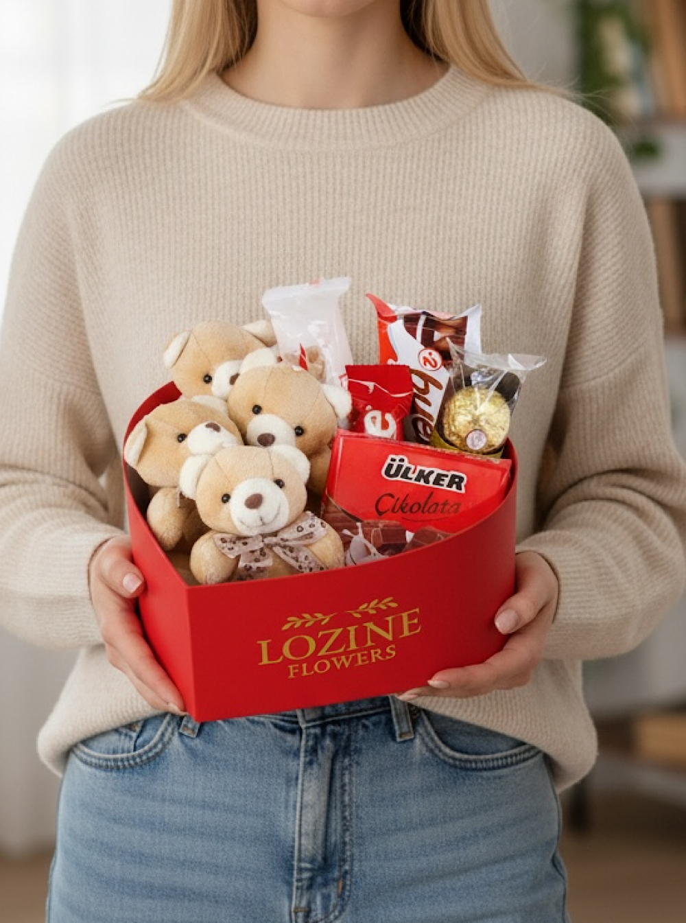 Kırmızı Kalp Kutuda Ayıcık ve Çikolata Mix, sevdiklerinize duygu dolu anlar yaşatmak için özel olarak tasarlanmış, hem romantik hem de tatlı bir hediye seçeneğidir. Gösterişli kırmızı kalp şeklindeki kutusu, ilk bakışta dikkat çeken zarif ve anlamlı bir tasarıma sahiptir. İçindeki her detay, sevgi, özen ve mutluluğu yansıtmak için bir araya getirilmiştir.