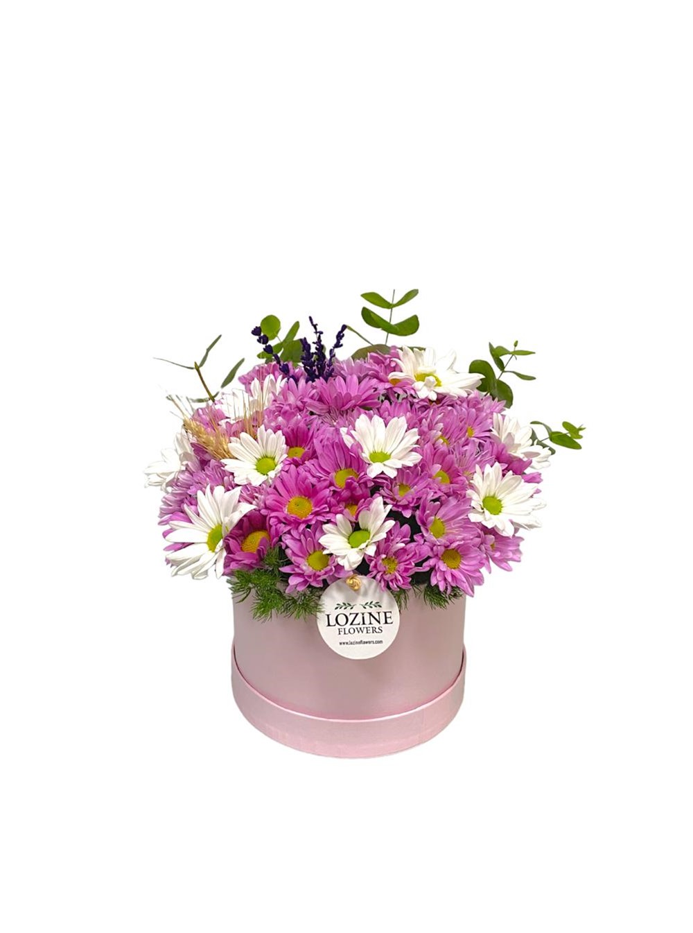 Pembe kutuda hazırlanmış pembe ve beyaz papatyalar.