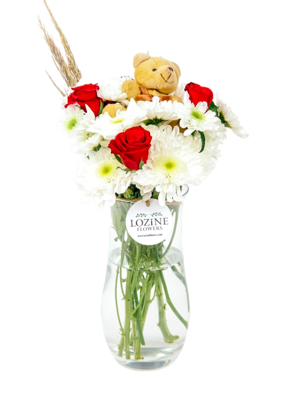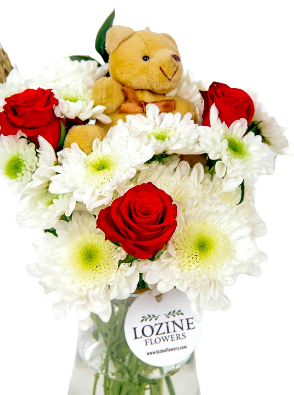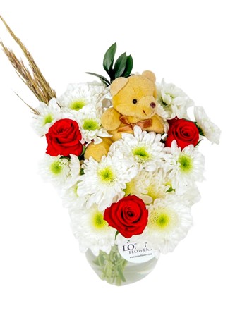 Paşabahçe vazoda 3 adet kırmızı gül, papatya ve mini ayıcık bulunmaktadır.