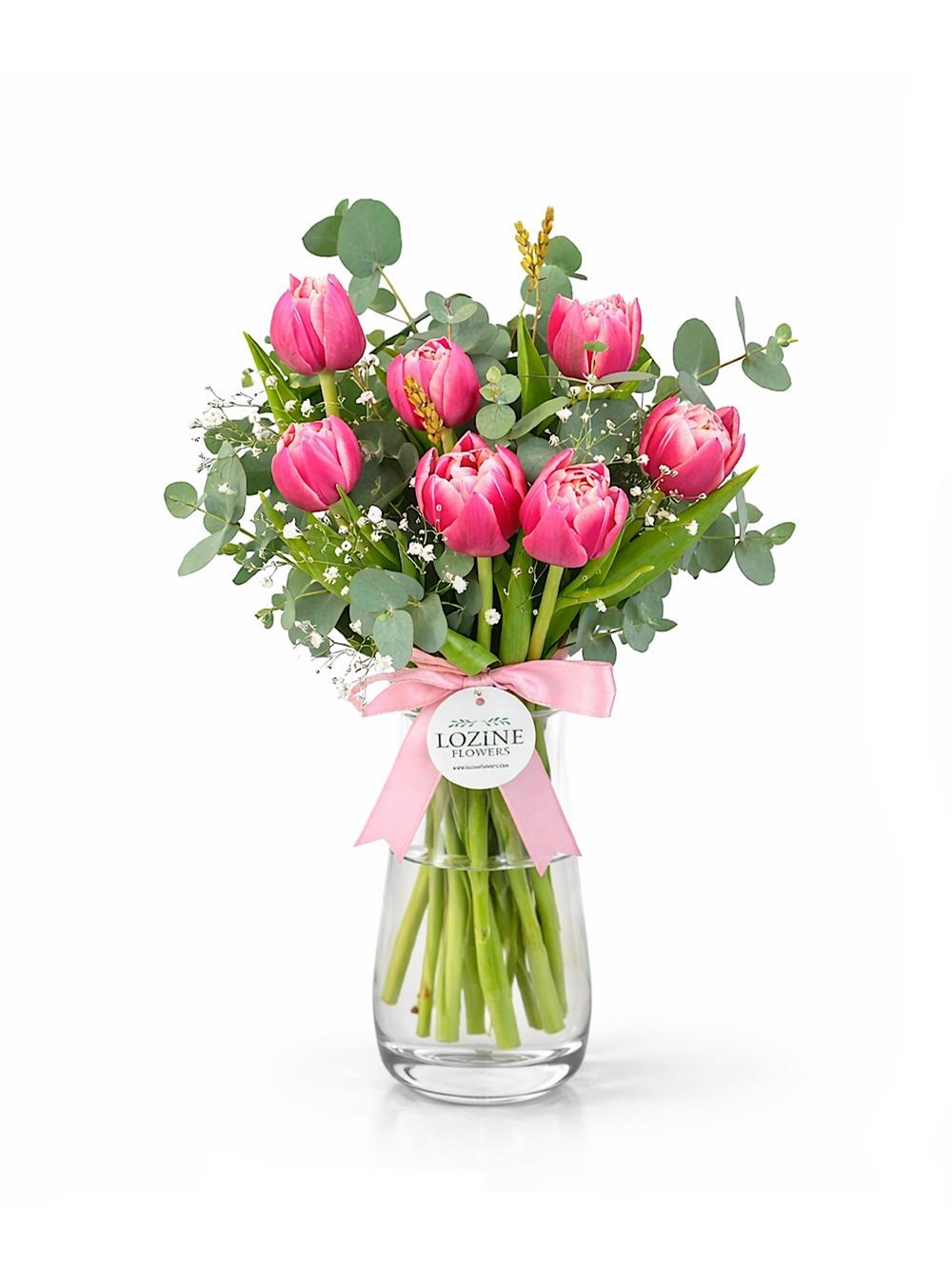 Silindir cam vazoda pembe lale bulunmaktadır.