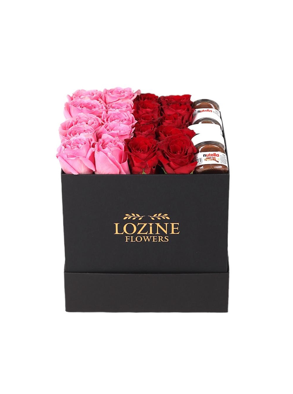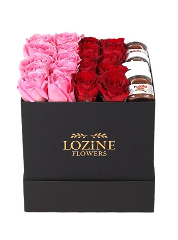 Kutuda 10 adet pembe gül, 10 adet kırmızı gül ve 4 adet mini nutella bulunmaktadır.