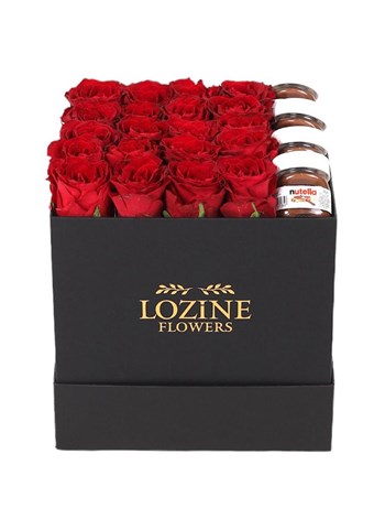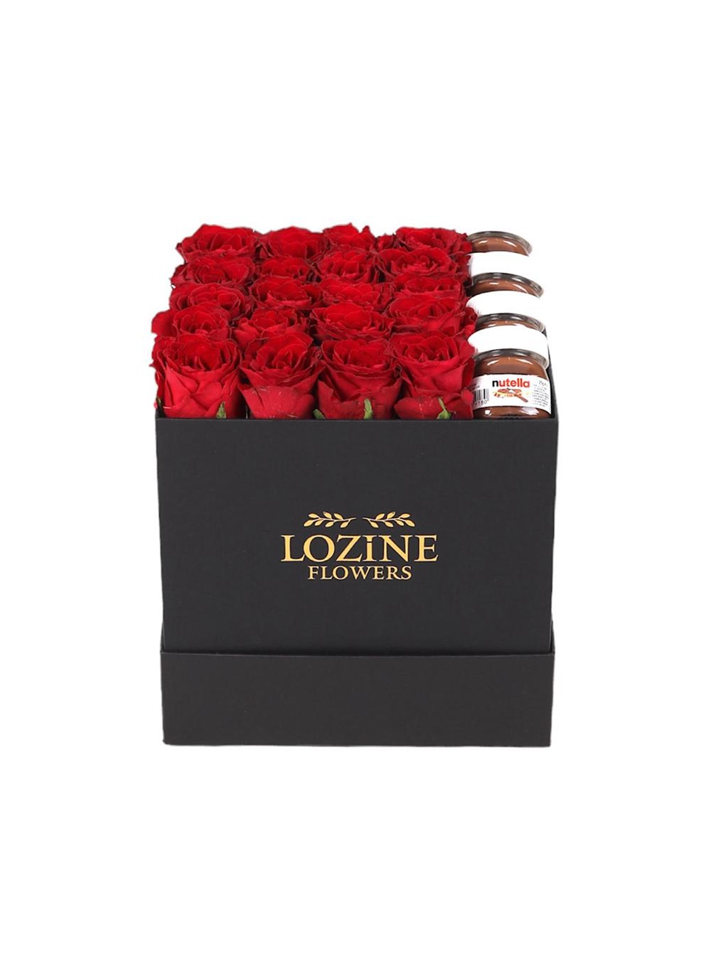 Kare kutuda 20 adet kırmızı gül ve 4 adet mini nutella bulunmaktadır.