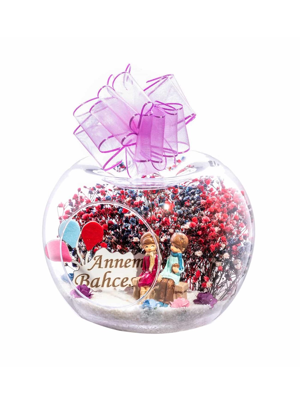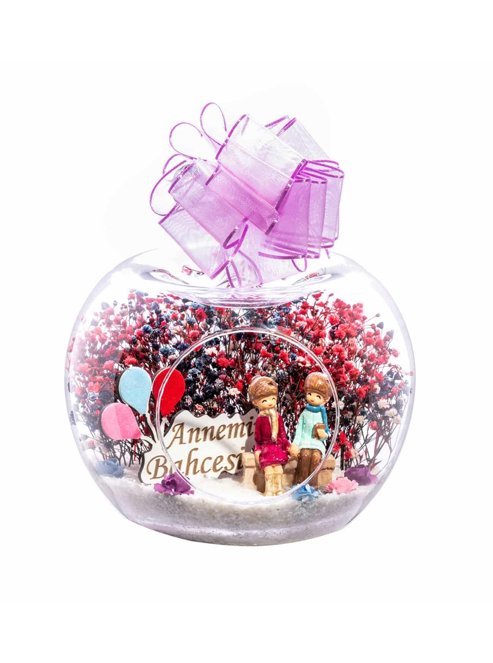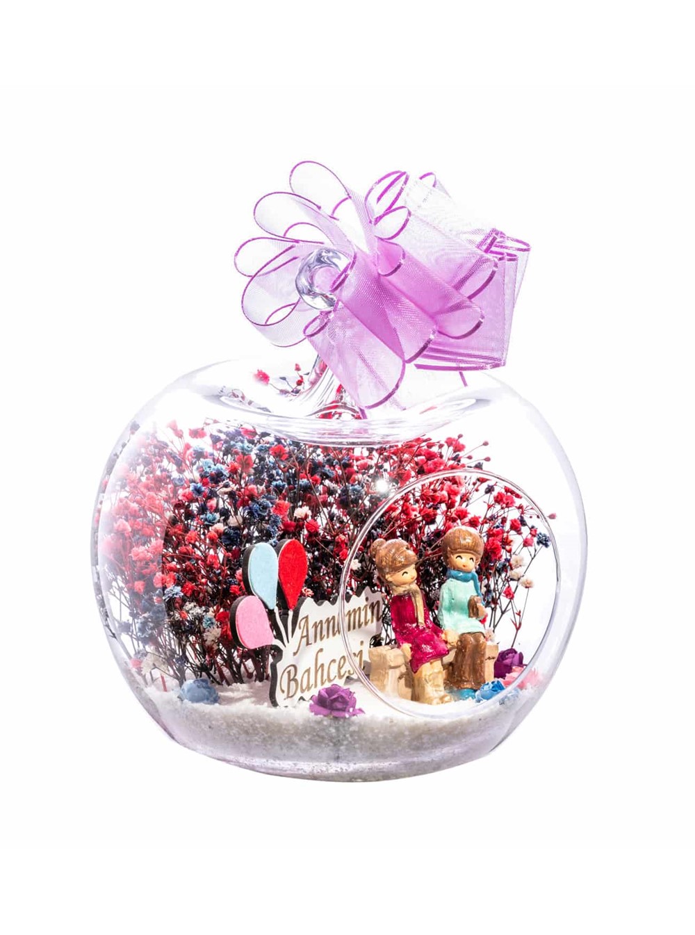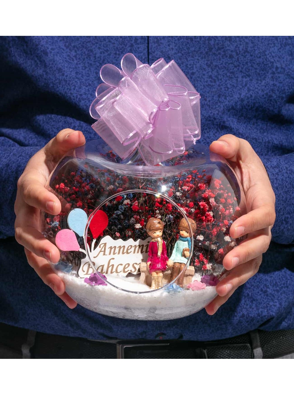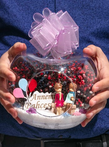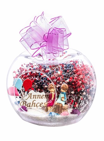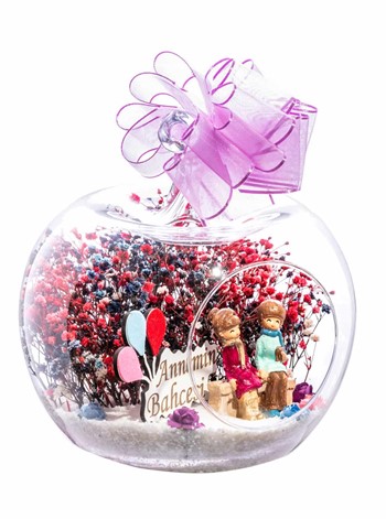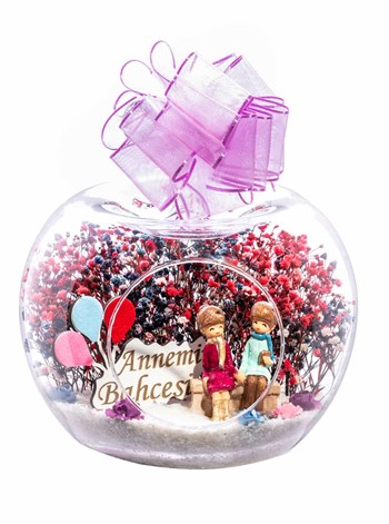 Küçük boy elma cam fanus içerisinde tasarladığımız bu kurdeleli güzel teraryum; beyaz kum, karışık renkli kurutulmuş bitkiler, renkli yapay mini güller, bir adet ahşap annemin bahçesi yazılı balonlu tabela ve bir adet yan yana bankta oturan çifti simgeleyen objeler kullanılarak tamamlanmıştır. Ev ve ofis ortamlarının tamamında sergilenebilir teraryumun içinde, kurutulmuş bitkiler bulunduğundan hava alması önemlidir. Açık olan kısmının kapatılmaması veya büfe vb. kapalı alanlara konulmaması gereklidir. Özellikle her ortamda yıllarca, zevkle izlenebilecek özel bir teraryumdur. Yaklaşık Ölçüleri: 20x20cm NOT: Teraryumlarda kullanılan camlar, üfleme cam işçiliğiyle üretildiğinden bazı detaylarda farklılıklar gözlenebilir. Örneğin, sap kısmı ve ağız bitiş noktalarının her biri kendine özgüdür.