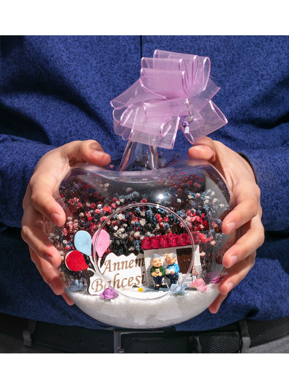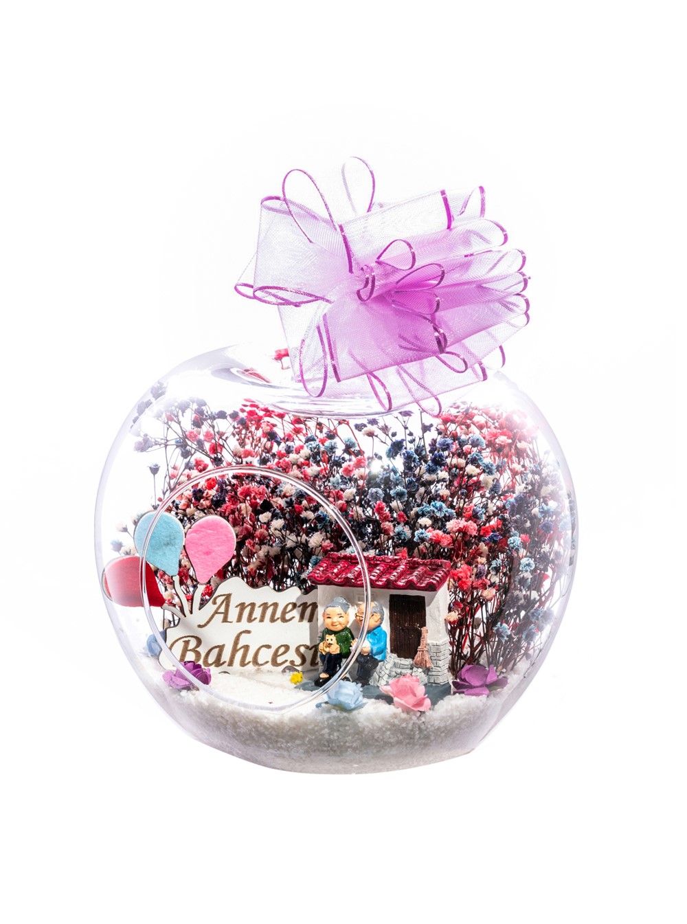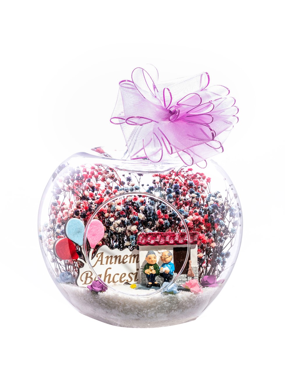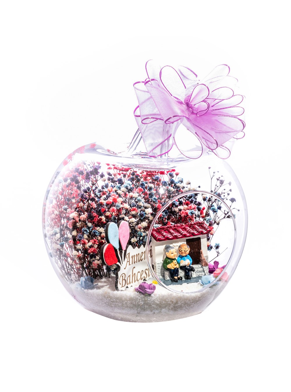 Küçük boy elma cam fanus içerisinde tasarladığımız bu kurdeleli güzel teraryum; beyaz kum, karışık renkli kurutulmuş bitkiler, renkli yapay mini güller, bir adet ahşap annemin bahçesi yazılı balonlu tabela ve bir adet evlerinin önünde yan yana oturan yaşlı çifti simgeleyen objeler kullanılarak tamamlanmıştır. Ev ve ofis ortamlarının tamamında sergilenebilir teraryumun içinde, kurutulmuş bitkiler bulunduğundan hava alması önemlidir. Açık olan kısmının kapatılmaması veya büfe vb. kapalı alanlara konulmaması gereklidir. Özellikle her ortamda yıllarca, zevkle izlenebilecek özel bir teraryumdur. Yaklaşık Ölçüleri: 20x20cm NOT: Teraryumlarda kullanılan camlar, üfleme cam işçiliğiyle üretildiğinden bazı detaylarda farklılıklar gözlenebilir. Örneğin, sap kısmı ve ağız bitiş noktalarının her biri kendine özgüdür.