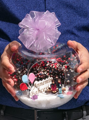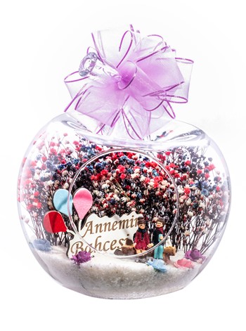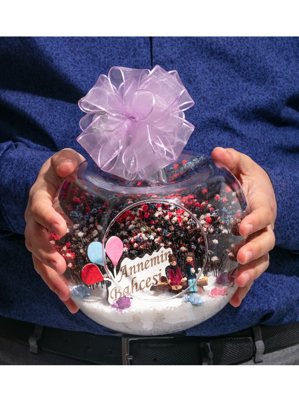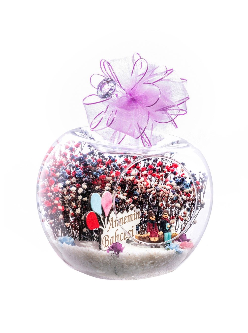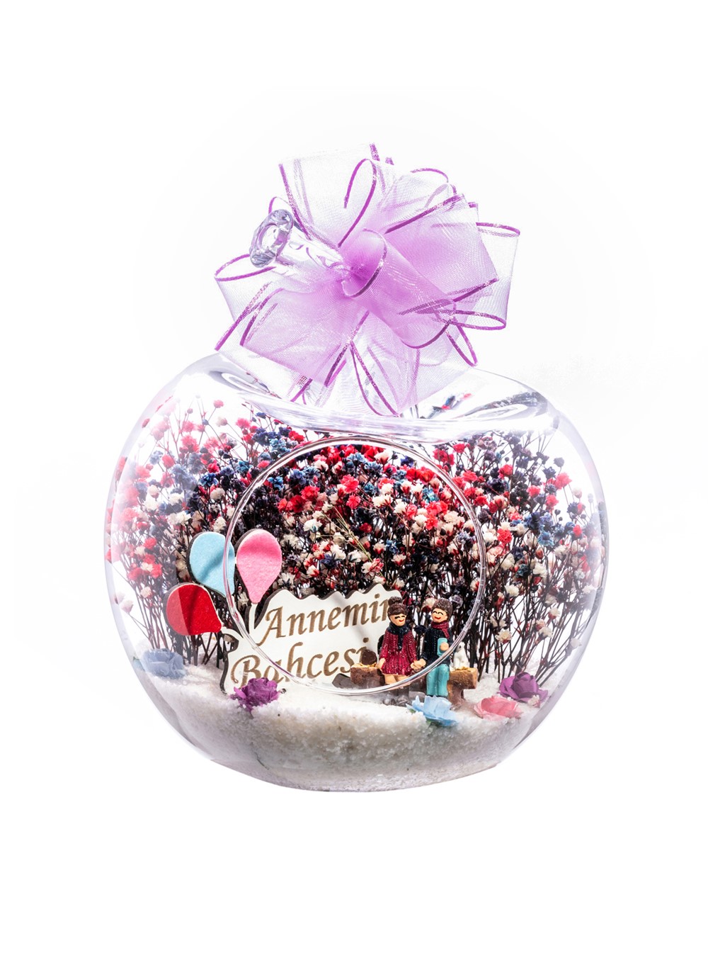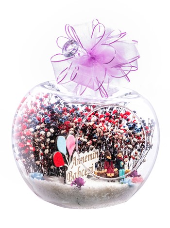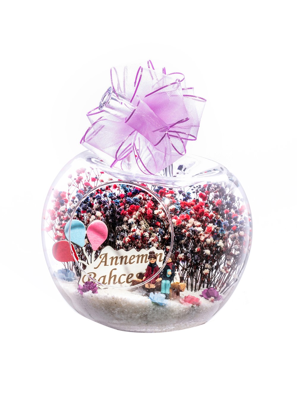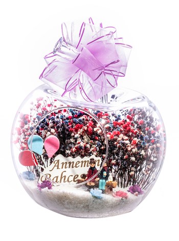 Küçük boy elma cam fanus içerisinde tasarladığımız bu kurdeleli güzel teraryum; beyaz kum, karışık renkli kurutulmuş bitkiler, renkli yapay mini güller, bir adet ahşap annemin bahçesi yazılı balonlu tabela ve bir adet yan yana bankta oturan çifti simgeleyen objeler kullanılarak tamamlanmıştır. Ev ve ofis ortamlarının tamamında sergilenebilir teraryumun içinde, kurutulmuş bitkiler bulunduğundan hava alması önemlidir. Açık olan kısmının kapatılmaması veya büfe vb. kapalı alanlara konulmaması gereklidir. Özellikle her ortamda yıllarca, zevkle izlenebilecek özel bir teraryumdur. Yaklaşık Ölçüleri: 20x20cm NOT: Teraryumlarda kullanılan camlar, üfleme cam işçiliğiyle üretildiğinden bazı detaylarda farklılıklar gözlenebilir. Örneğin, sap kısmı ve ağız bitiş noktalarının her biri kendine özgüdür.