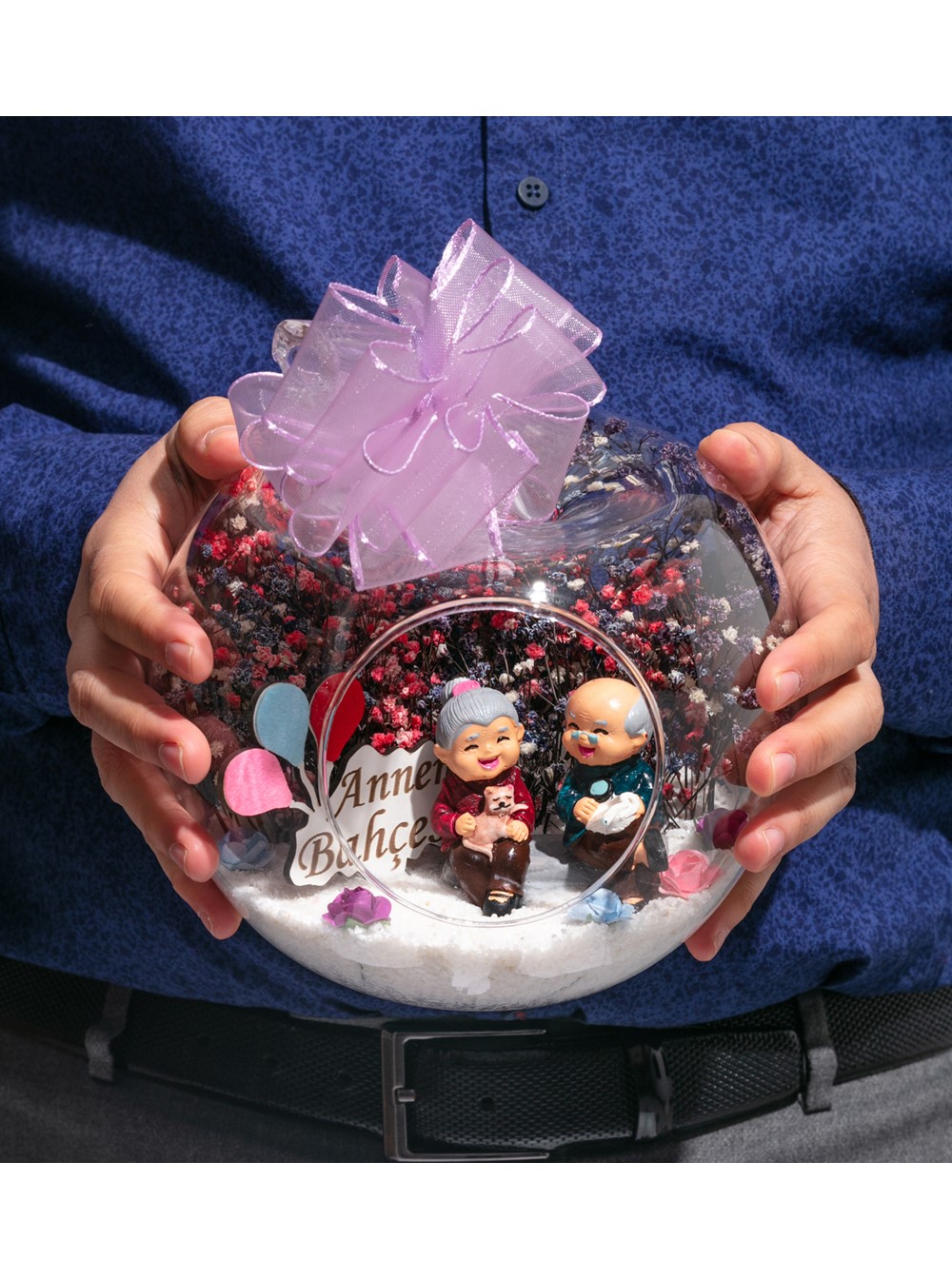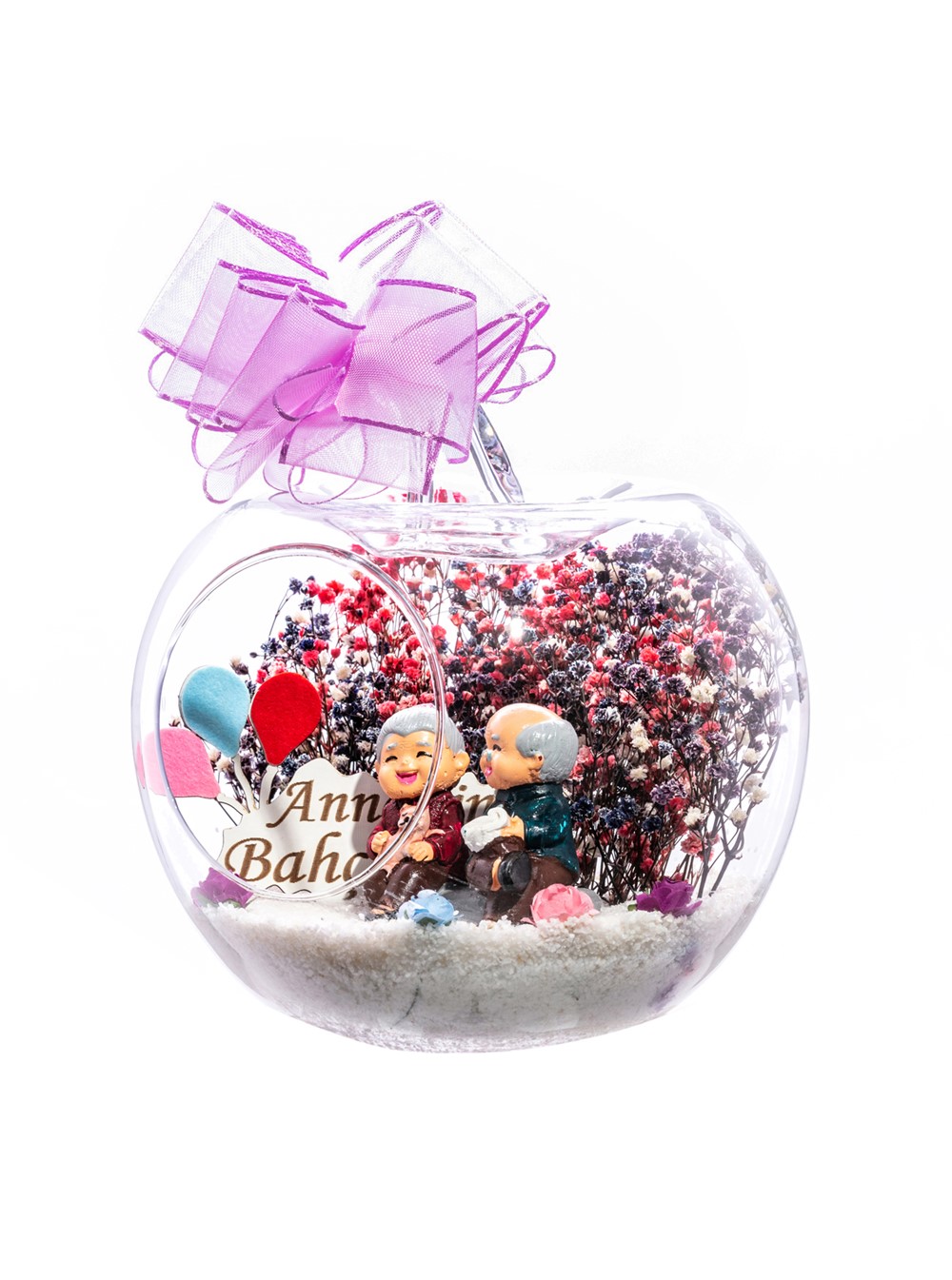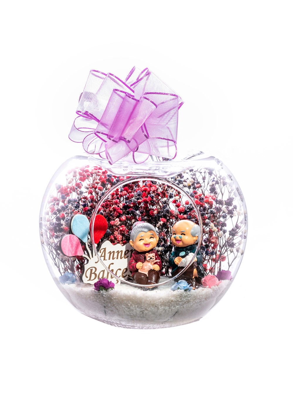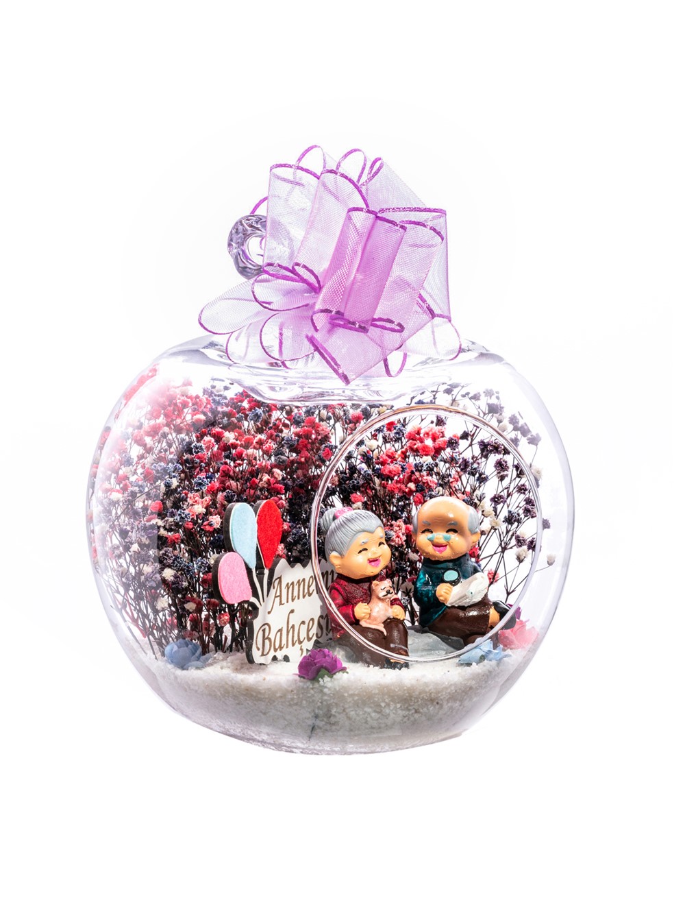 Küçük boy elma cam fanus içerisinde tasarladığımız bu kurdeleli güzel teraryum; beyaz kum, karışık renkli kurutulmuş bitkiler, renkli yapay mini güller, bir adet ahşap annemin bahçesi yazılı balonlu tabela ve bir adet yaşlı çifti simgeleyen objeler kullanılarak tamamlanmıştır. Ev ve ofis ortamlarının tamamında sergilenebilir teraryumun içinde, kurutulmuş bitkiler bulunduğundan hava alması önemlidir. Açık olan kısmının kapatılmaması veya büfe vb. kapalı alanlara konulmaması gereklidir. Özellikle her ortamda yıllarca, zevkle izlenebilecek özel bir teraryumdur. Yaklaşık Ölçüleri: 20x20cm NOT: Teraryumlarda kullanılan camlar, üfleme cam işçiliğiyle üretildiğinden bazı detaylarda farklılıklar gözlenebilir. Örneğin, sap kısmı ve ağız bitiş noktalarının her biri kendine özgüdür.