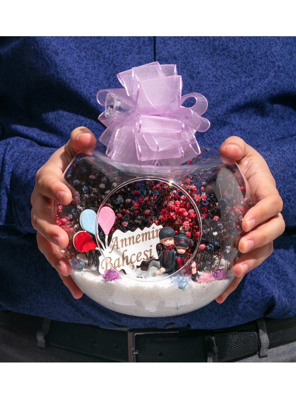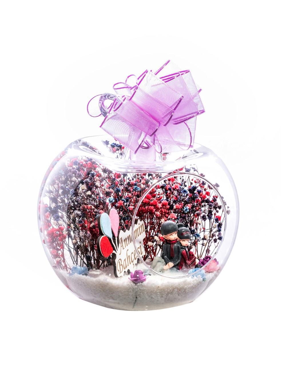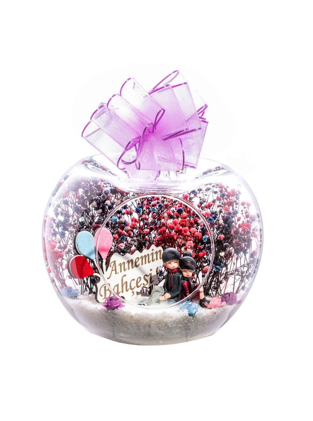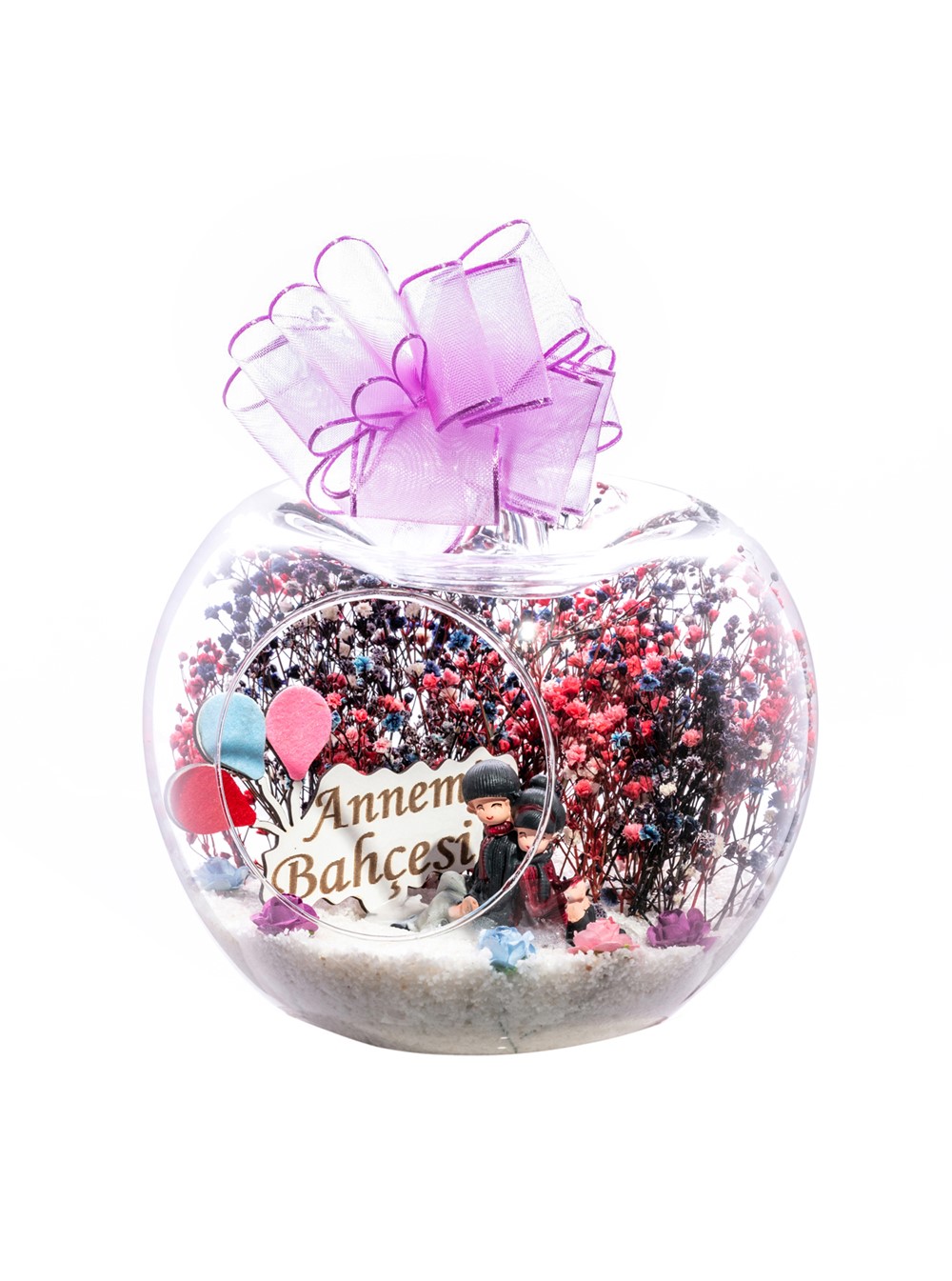 Küçük boy elma cam fanus içerisinde tasarladığımız bu kurdeleli güzel teraryum; beyaz kum, karışık renkli kurutulmuş bitkiler, renkli yapay mini güller, bir adet ahşap annemin bahçesi yazılı balonlu tabela ve bir adet sırt sırta oturan çifti simgeleyen objeler kullanılarak tamamlanmıştır. Ev ve ofis ortamlarının tamamında sergilenebilir teraryumun içinde, kurutulmuş bitkiler bulunduğundan hava alması önemlidir. Açık olan kısmının kapatılmaması veya büfe vb. kapalı alanlara konulmaması gereklidir. Özellikle her ortamda yıllarca, zevkle izlenebilecek özel bir teraryumdur. Yaklaşık Ölçüleri: 20x20cm NOT: Teraryumlarda kullanılan camlar, üfleme cam işçiliğiyle üretildiğinden bazı detaylarda farklılıklar gözlenebilir. Örneğin, sap kısmı ve ağız bitiş noktalarının her biri kendine özgüdür.