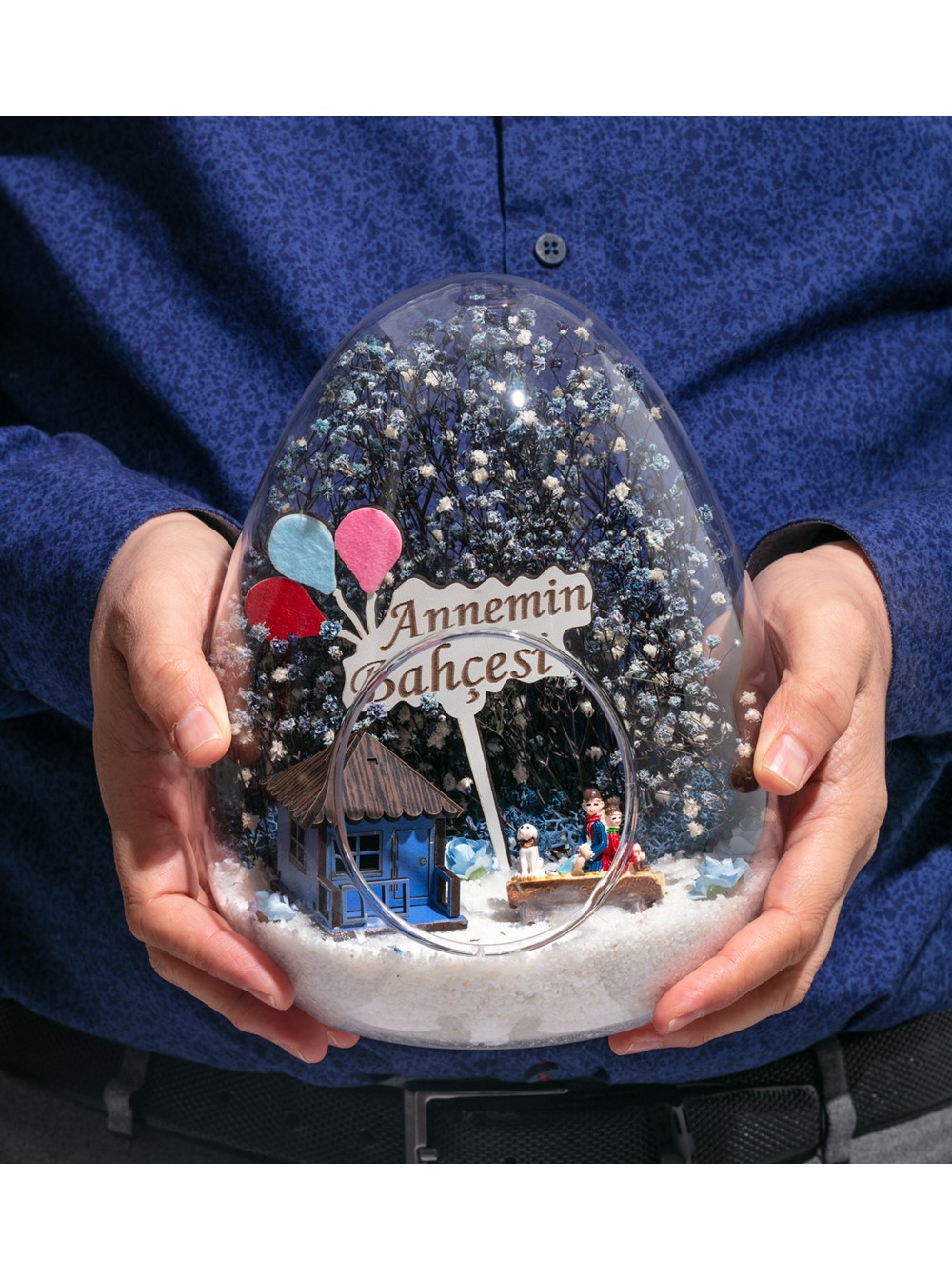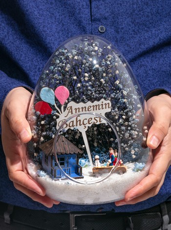 Küçük boy yumurta cam fanus içerisinde tasarladığımız teraryum; beyaz kum, kurutulmuş bitkiler, şoklanmış yosunlar, yapay mini güller, bir adet ahşap mavi ev, bir adet ahşap annemin bahçesi yazılı balonlu tabela ve bir adet bankta sırt sırta oturan çifti simgeleyen objelerle tamamlanmıştır. Ev ve ofis ortamlarının tamamında sergilenebilir teraryumun içinde canlı bitki bulunmadığından, herhangi bir bakıma ihtiyacı yoktur. Özellikle her ortamda yıllarca, zevkle izlenebilecek özel bir teraryumdur. Yaklaşık Ölçüleri: 18x22cm NOT: Teraryumlarda kullanılan camlar, üfleme cam işçiliğiyle üretildiğinden bazı detaylarda farklılıklar gözlenebilir. Örneğin, sap kısmı ve ağız bitiş noktalarının her biri kendine özgüdür.