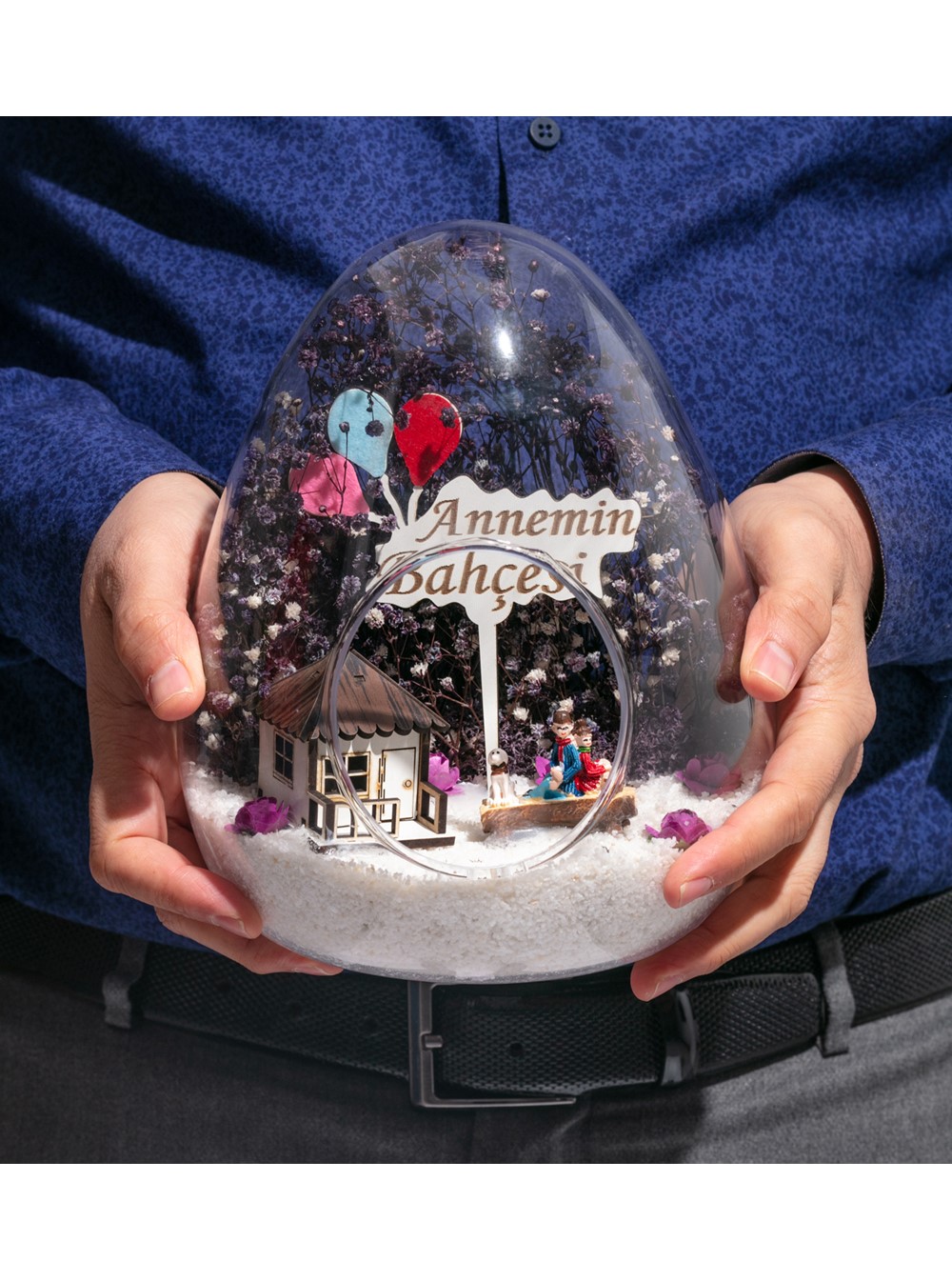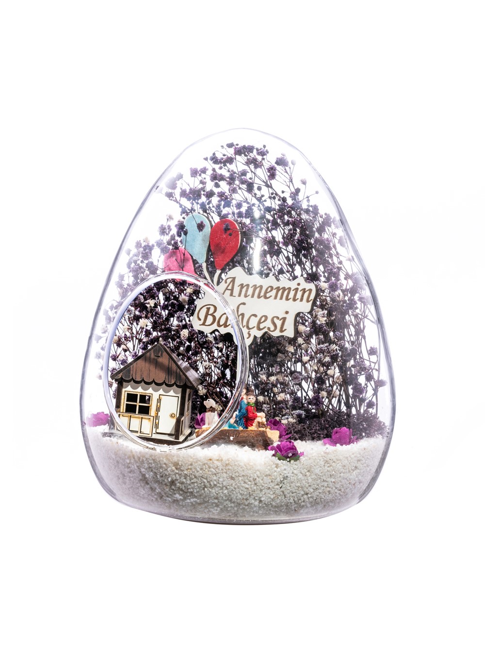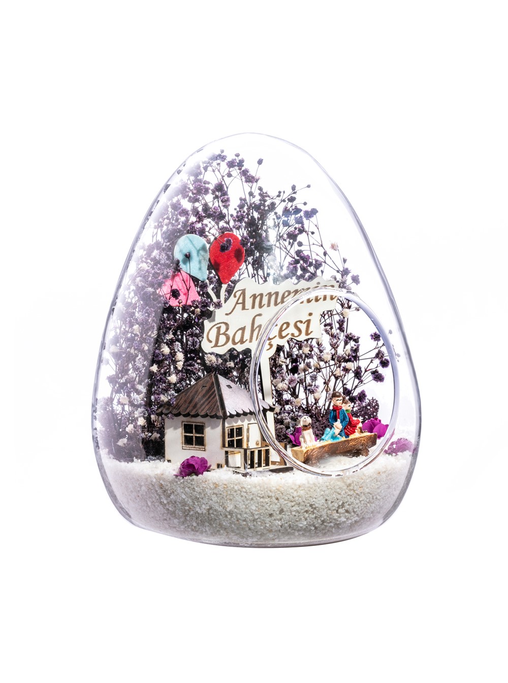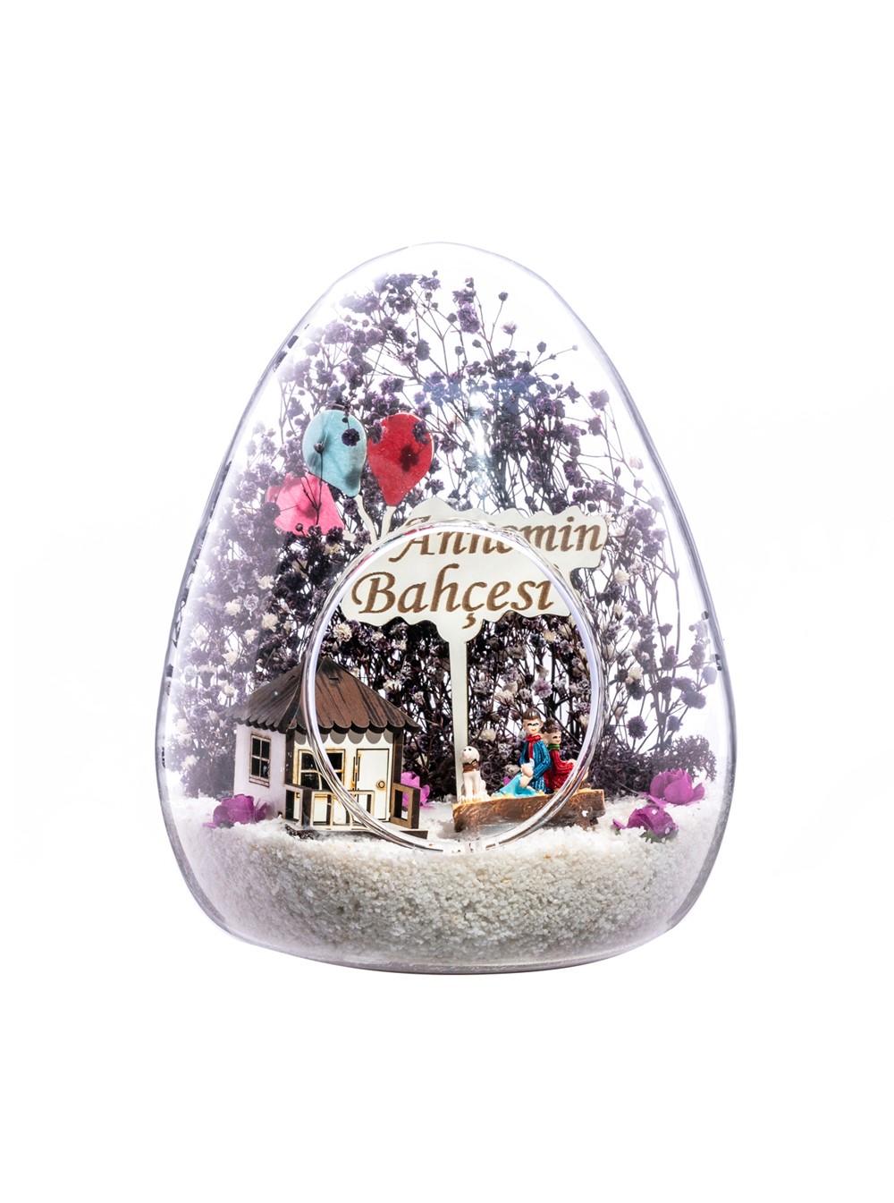 Küçük boy yumurta cam fanus içerisinde tasarladığımız teraryum; beyaz kum, kurutulmuş bitkiler, şoklanmış yosunlar, yapay mini güller, bir adet ahşap beyaz ev, bir adet ahşap annemin bahçesi yazılı balonlu tabela ve bir adet bankta sırt sırta oturan çifti simgeleyen objelerle tamamlanmıştır. Ev ve ofis ortamlarının tamamında sergilenebilir teraryumun içinde canlı bitki bulunmadığından, herhangi bir bakıma ihtiyacı yoktur. Özellikle her ortamda yıllarca, zevkle izlenebilecek özel bir teraryumdur. Yaklaşık Ölçüleri: 18x22cm NOT: Teraryumlarda kullanılan camlar, üfleme cam işçiliğiyle üretildiğinden bazı detaylarda farklılıklar gözlenebilir. Örneğin, sap kısmı ve ağız bitiş noktalarının her biri kendine özgüdür.