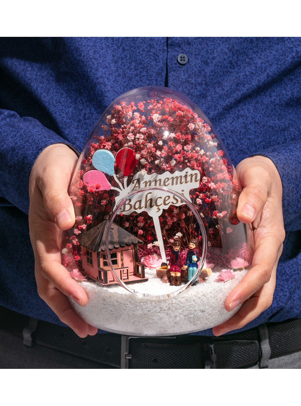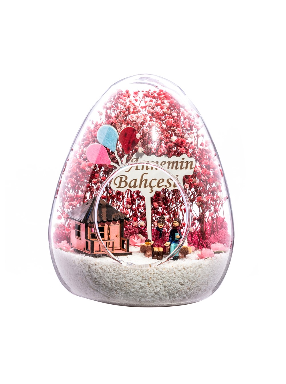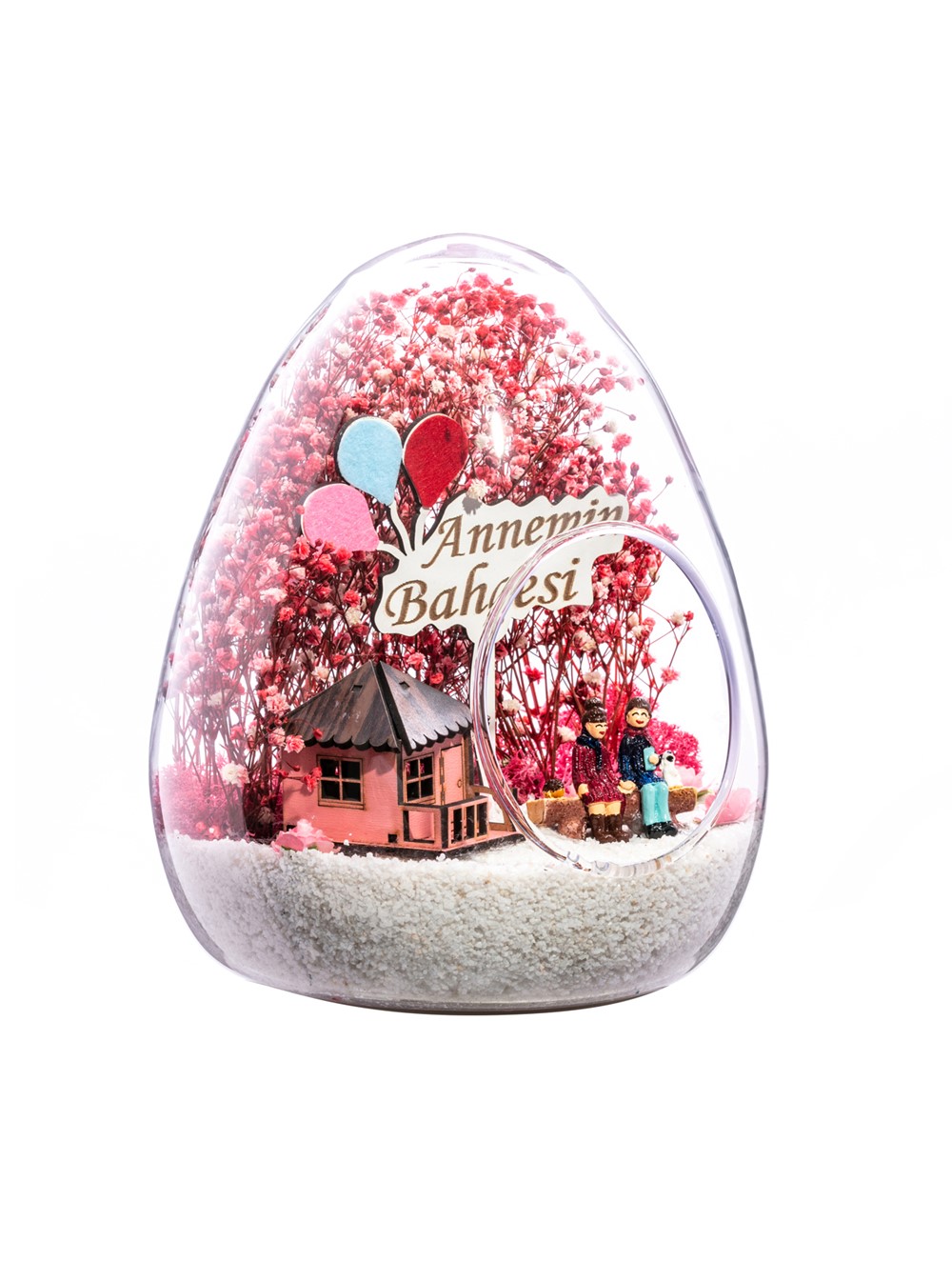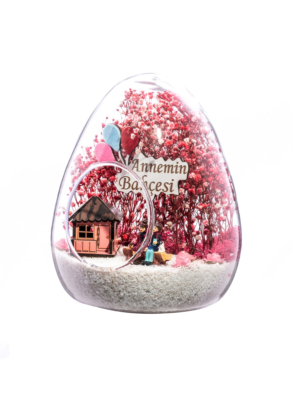 Küçük boy yumurta cam fanus içerisinde tasarladığımız teraryum; beyaz kum, kurutulmuş bitkiler, şoklanmış yosunlar, yapay mini güller, bir adet ahşap pembe ev, bir adet ahşap annemin bahçesi yazılı balonlu tabela ve bir adet bankta yan yana oturan çifti simgeleyen objelerle tamamlanmıştır. Ev ve ofis ortamlarının tamamında sergilenebilir teraryumun içinde canlı bitki bulunmadığından, herhangi bir bakıma ihtiyacı yoktur. Özellikle her ortamda yıllarca, zevkle izlenebilecek özel bir teraryumdur. Yaklaşık Ölçüleri: 18x22cm NOT: Teraryumlarda kullanılan camlar, üfleme cam işçiliğiyle üretildiğinden bazı detaylarda farklılıklar gözlenebilir. Örneğin, sap kısmı ve ağız bitiş noktalarının her biri kendine özgüdür.