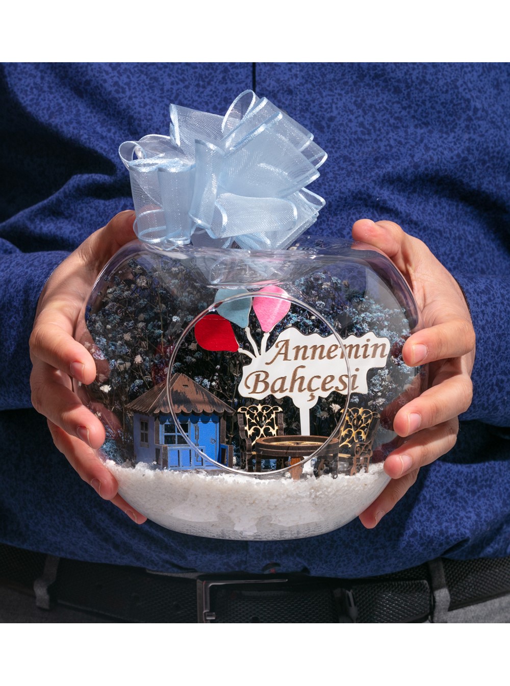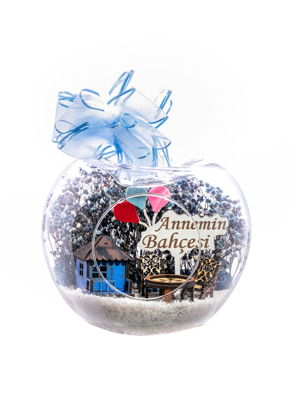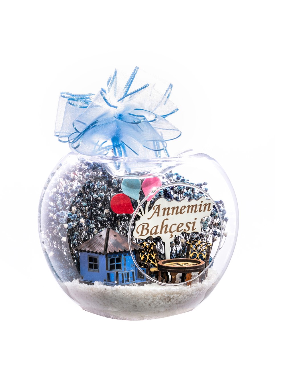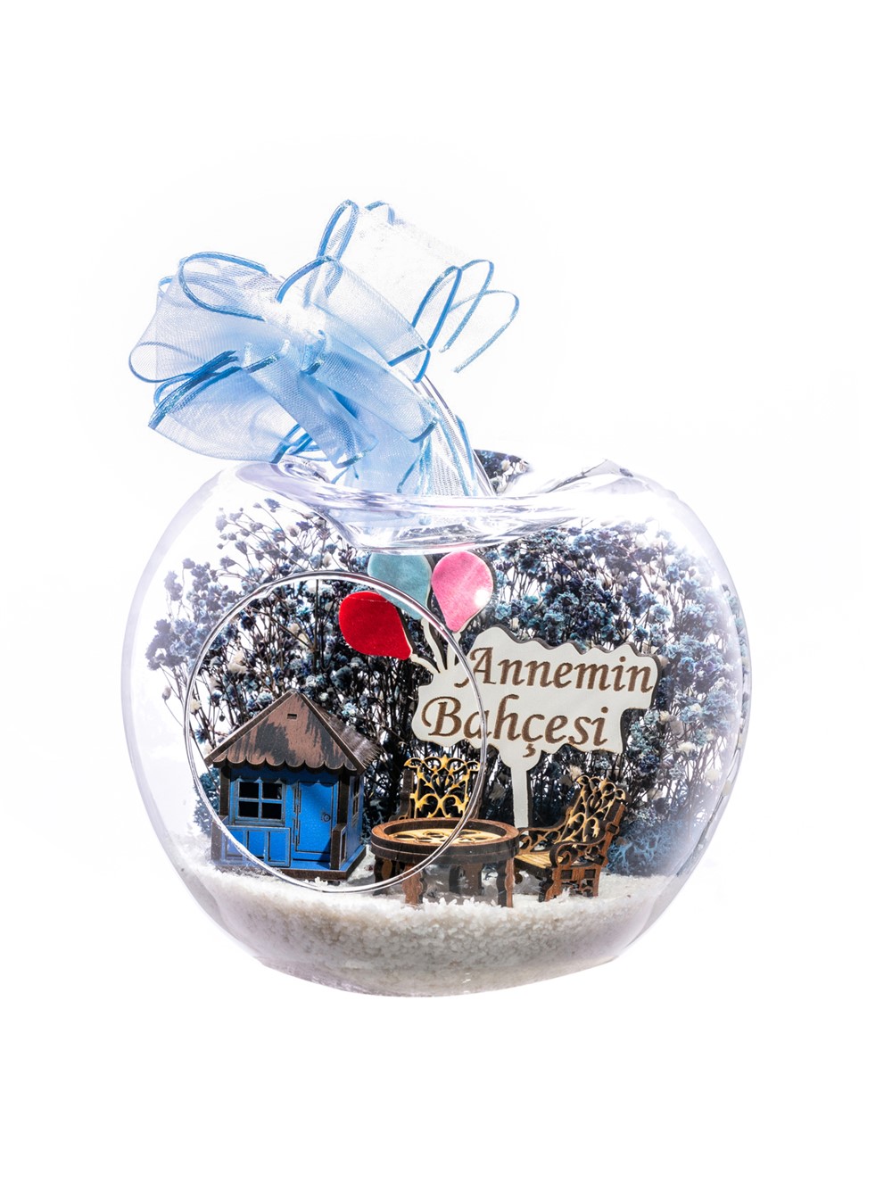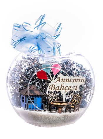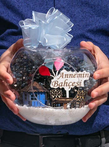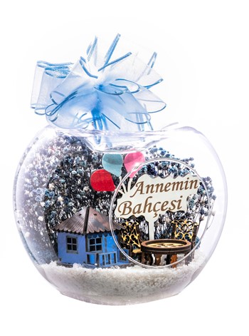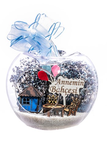 Küçük boy elma cam fanus içerisinde tasarladığımız bu kurdeleli güzel teraryum; beyaz kum, kurutulmuş bitkiler, şoklanmış yosunlar, bir adet ahşap annemin bahçesi yazılı balonlu tabela, bir adet mavi ahşap ev ve otantik ahşap bahçe mobilyalarını simgeleyen objeler kullanılarak tamamlanmıştır. Ev ve ofis ortamlarının tamamında sergilenebilir teraryumun içinde, kurutulmuş bitkiler bulunduğundan hava alması önemlidir. Açık olan kısmının kapatılmaması veya büfe vb. kapalı alanlara konulmaması gereklidir. Özellikle her ortamda yıllarca, zevkle izlenebilecek özel bir teraryumdur. Yaklaşık Ölçüleri: 20x20cm NOT: Teraryumlarda kullanılan camlar, üfleme cam işçiliğiyle üretildiğinden bazı detaylarda farklılıklar gözlenebilir. Örneğin, sap kısmı ve ağız bitiş noktalarının her biri kendine özgüdür.