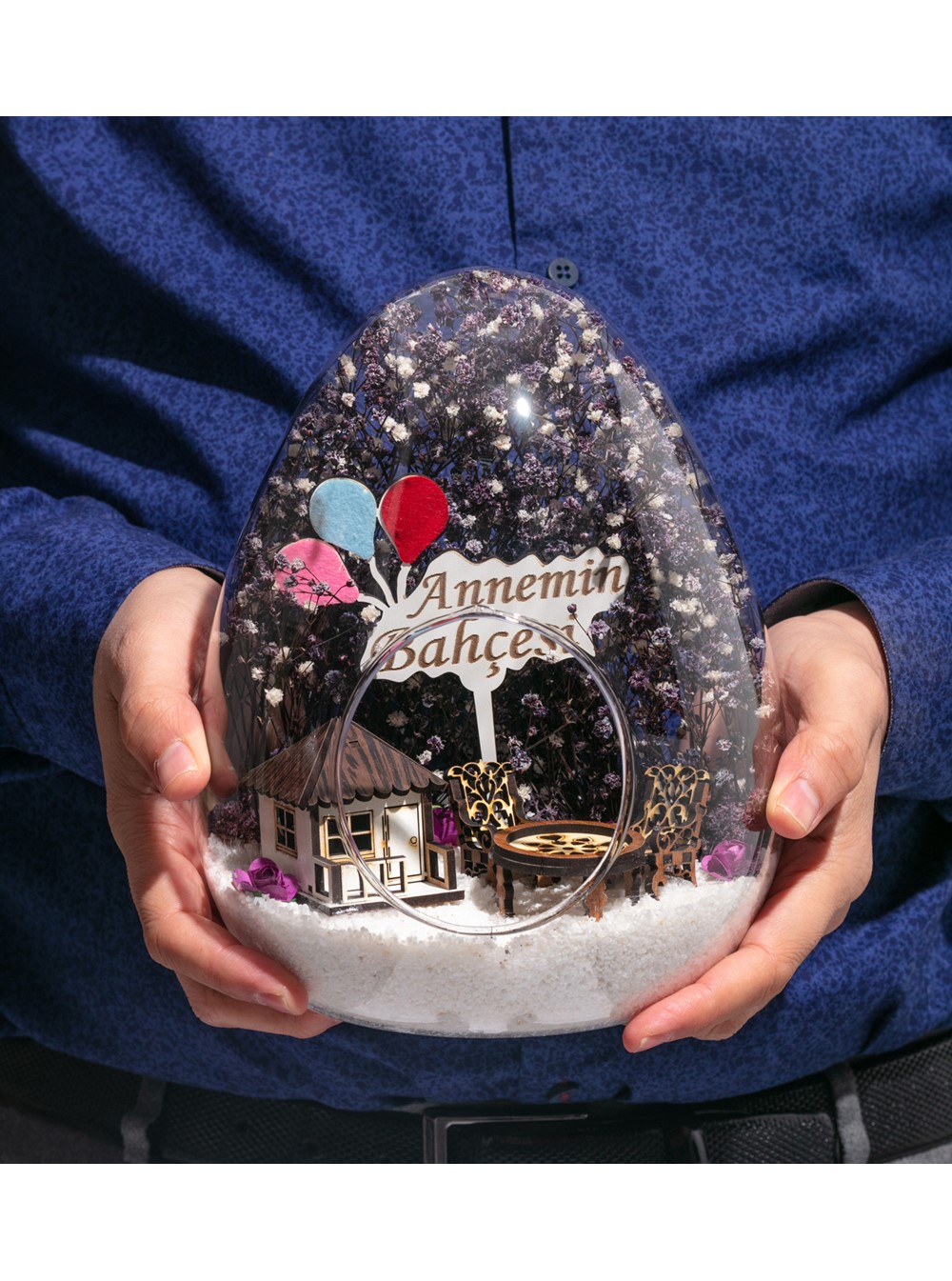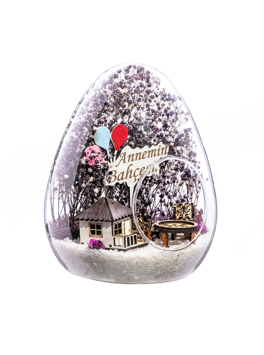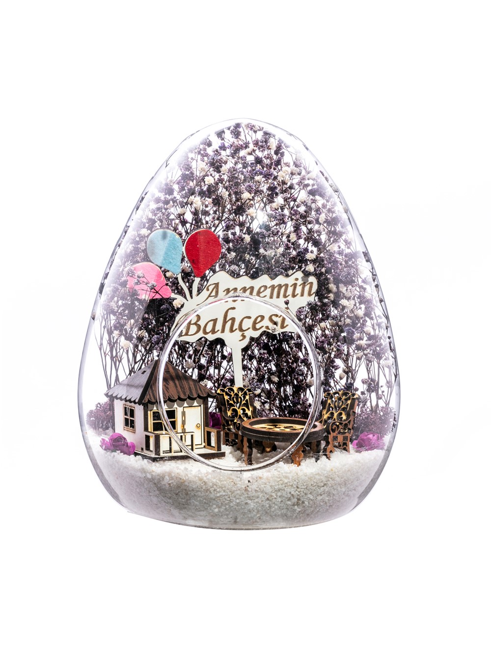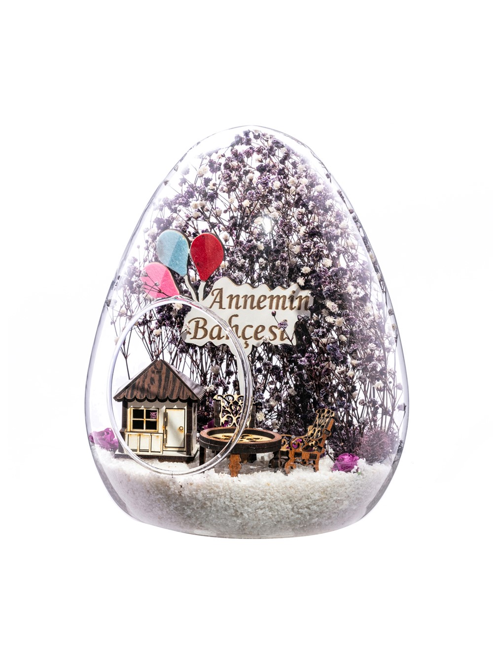 Küçük boy yumurta cam fanus içerisinde tasarladığımız teraryum; beyaz kum, kurutulmuş bitkiler, şoklanmış yosunlar, yapay mini güller, bir adet ahşap beyaz ev, bir adet ahşap annemin bahçesi yazılı balonlu tabela ve otantik ahşaptan bahçe mobilyalarını simgeleyen objelerle tamamlanmıştır. Ev ve ofis ortamlarının tamamında sergilenebilir teraryumun içinde canlı bitki bulunmadığından, herhangi bir bakıma ihtiyacı yoktur. Özellikle her ortamda yıllarca, zevkle izlenebilecek özel bir teraryumdur. Yaklaşık Ölçüleri: 18x22cm NOT: Teraryumlarda kullanılan camlar, üfleme cam işçiliğiyle üretildiğinden bazı detaylarda farklılıklar gözlenebilir. Örneğin, sap kısmı ve ağız bitiş noktalarının her biri kendine özgüdür.