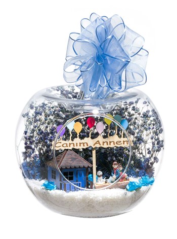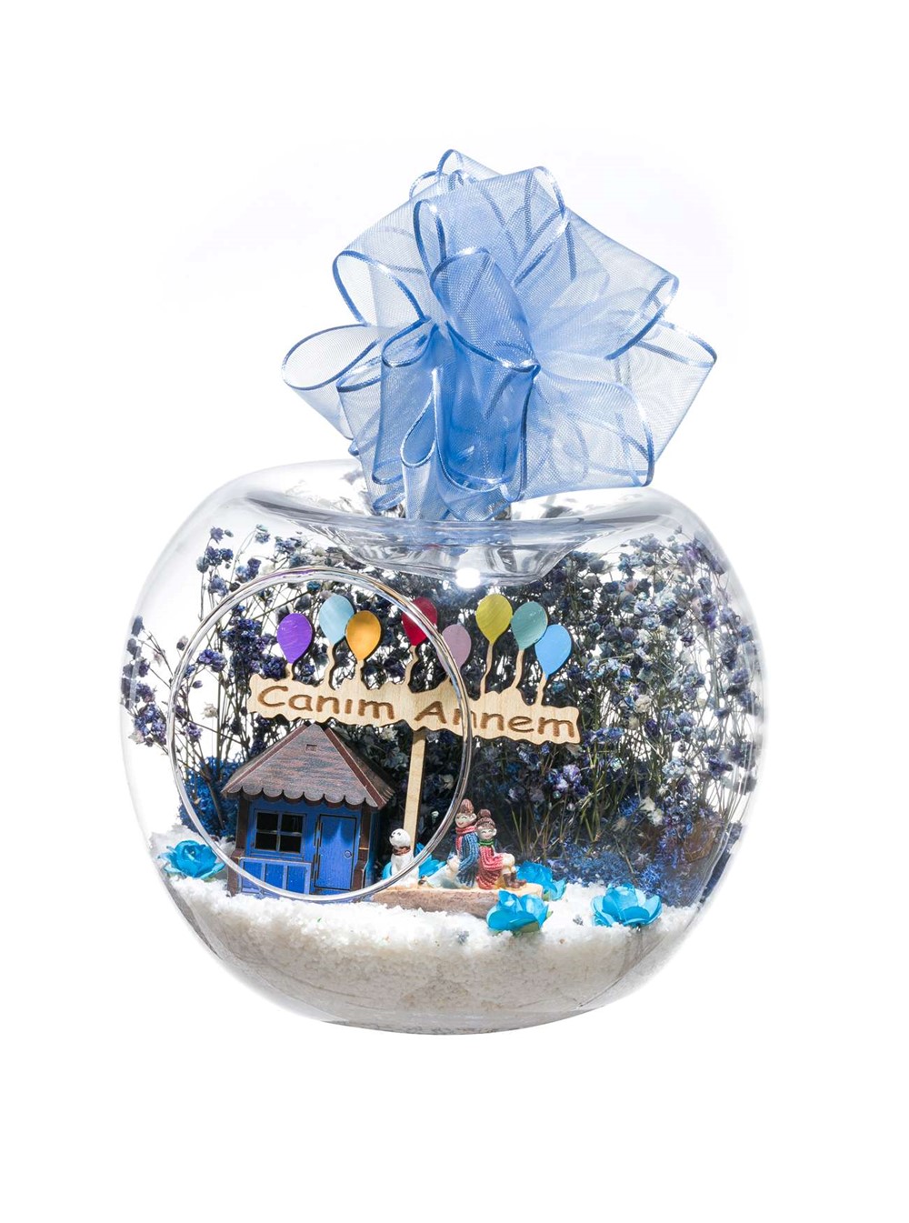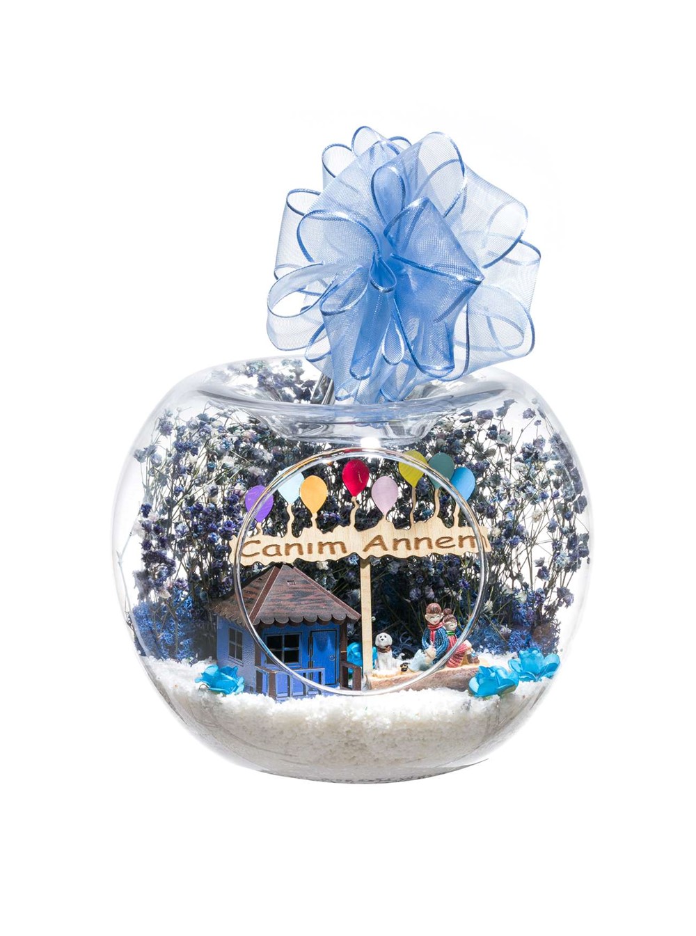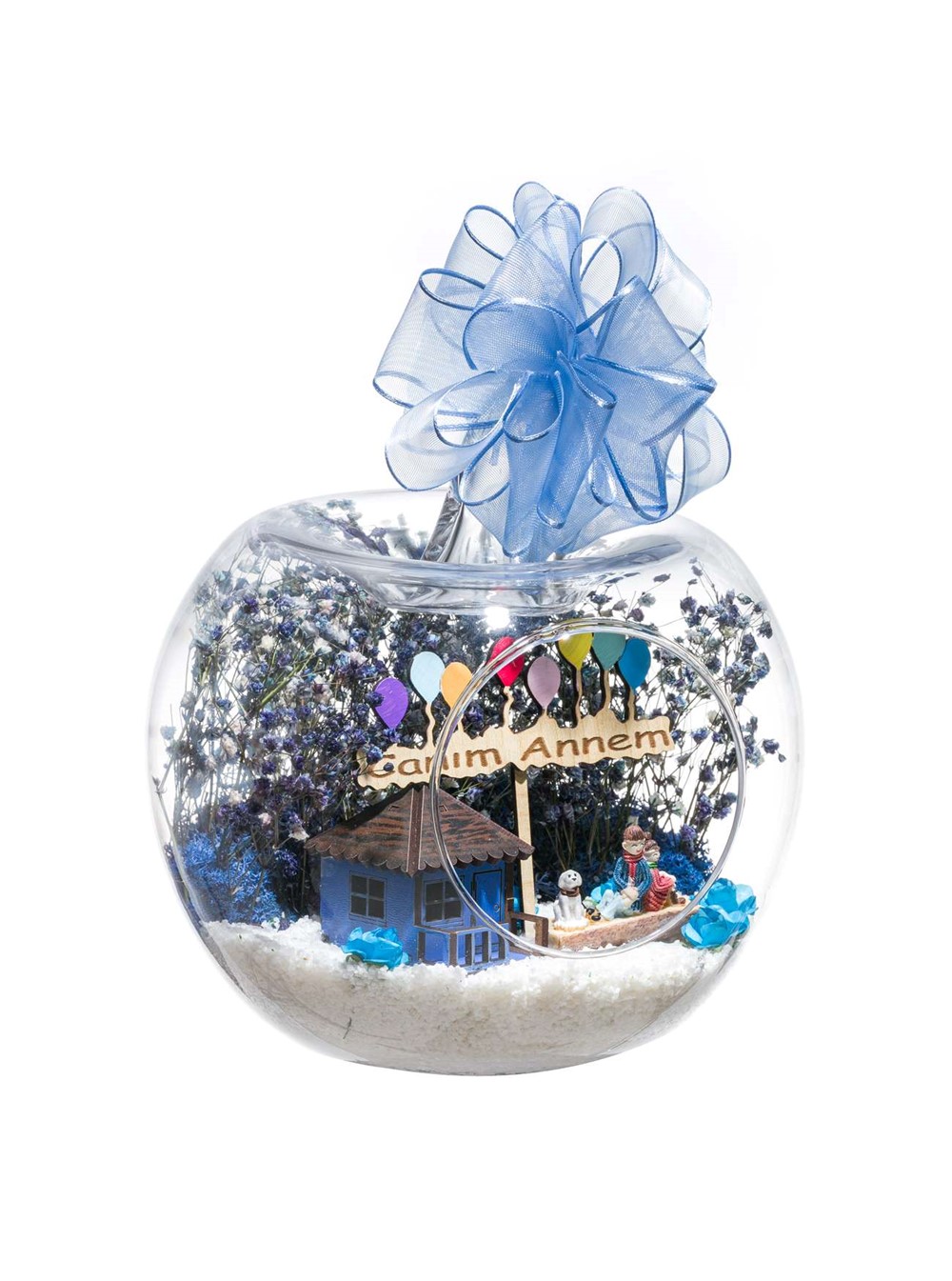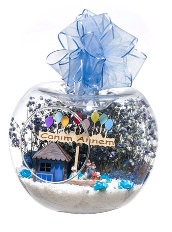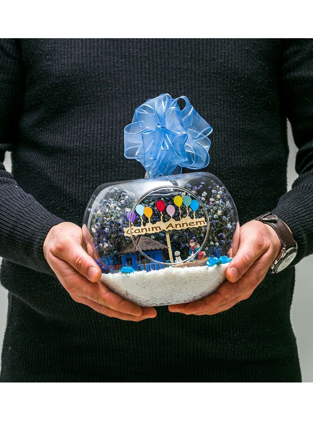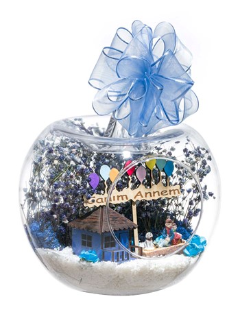 Kurdele takılmış küçük boy elma cam fanus içerisinde tasarladığımız bu çok anlamlıteraryum; beyaz kum, şoklanmış yosunlar, kurutulmuş bitkiler, yapay mini güller, bir adet ahşap, balonlu CANIM ANNEM yazan tabela, bir adetahşap mavi ev ve bahçesinde bankta sırt sırta oturmuş ebeveynler görseli kullanılarak tamamlanmıştır. Ev ve ofis ortamlarının tamamında sergilenebilir teraryumun içinde,kurutulmuş ve şoklanmış bitkiler bulunduğundan hava alması önemlidir. Açık olan kısmının kapatılmaması veya büfe vb. kapalı alanlara konulmaması gereklidir. Özellikle her ortamda yıllarca, zevkle izlenebilecek özel bir teraryumdur. Yaklaşık Ölçüleri: 20x20cm NOT: Teraryumlarda kullanılan camlar, üfleme cam işçiliğiyle üretildiğinden bazı detaylarda farklılıklar gözlenebilir. Örneğin, sap kısmı ve ağız bitiş noktalarının her biri kendine özgüdür.