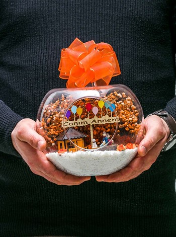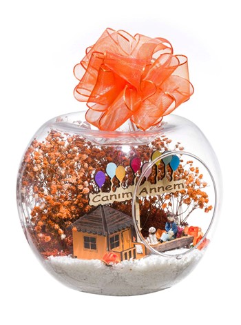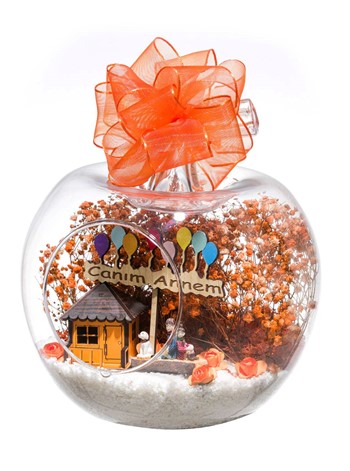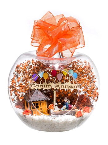 Kurdele takılmış küçük boy elma cam fanus içerisinde tasarladığımız bu çok anlamlıteraryum; beyaz kum, şoklanmış yosunlar, kurutulmuş bitkiler, yapay mini güller, bir adet ahşap, balonlu CANIM ANNEM yazan tabela, bir adetahşap turuncu ev ve bahçesinde bankta sırt sırta oturmuş ebeveynler görseli kullanılarak tamamlanmıştır. Ev ve ofis ortamlarının tamamında sergilenebilir teraryumun içinde,kurutulmuş ve şoklanmış bitkiler bulunduğundan hava alması önemlidir. Açık olan kısmının kapatılmaması veya büfe vb. kapalı alanlara konulmaması gereklidir. Özellikle her ortamda yıllarca, zevkle izlenebilecek özel bir teraryumdur. Yaklaşık Ölçüleri: 20x20cm NOT: Teraryumlarda kullanılan camlar, üfleme cam işçiliğiyle üretildiğinden bazı detaylarda farklılıklar gözlenebilir. Örneğin, sap kısmı ve ağız bitiş noktalarının her biri kendine özgüdür.
