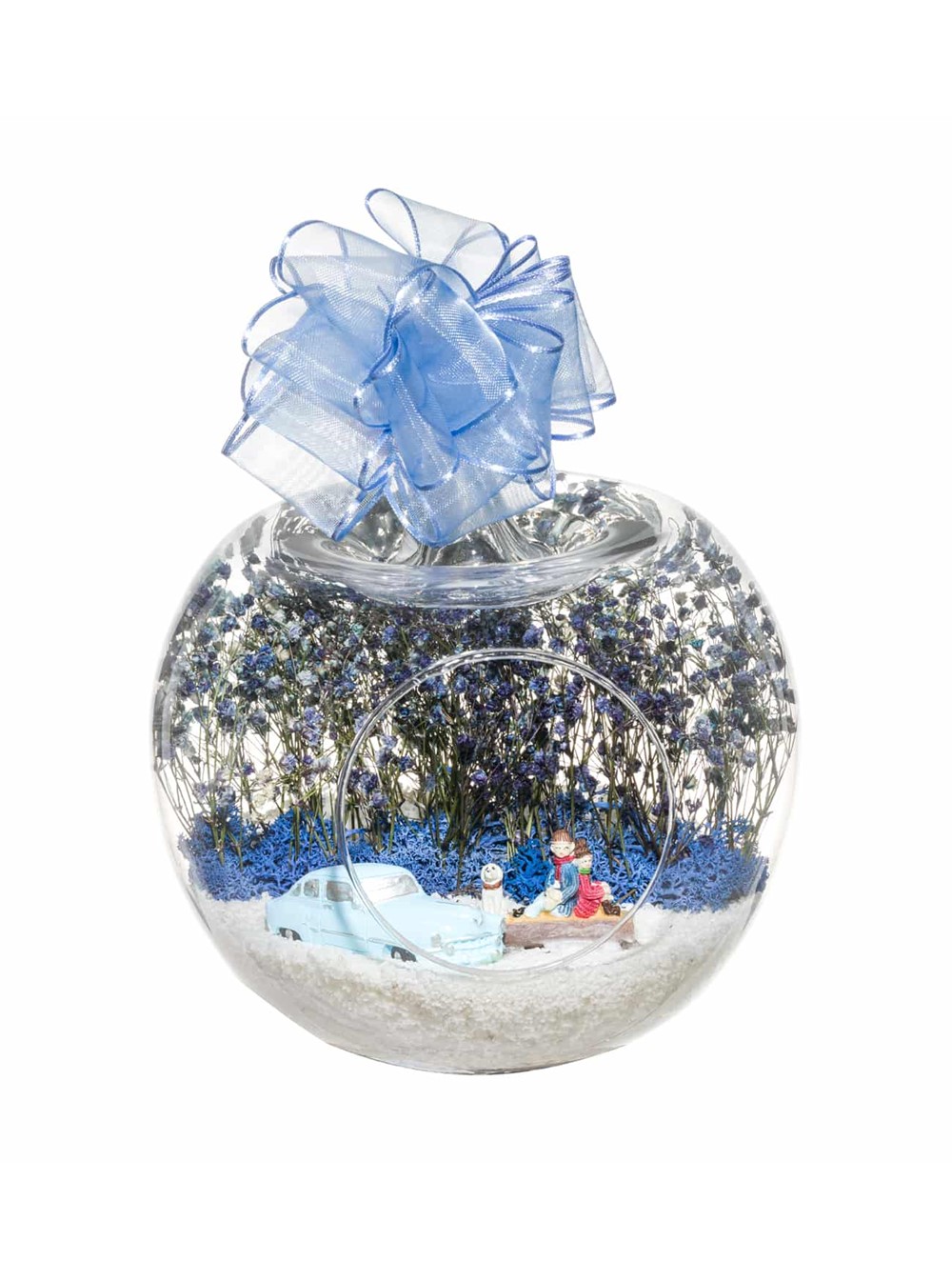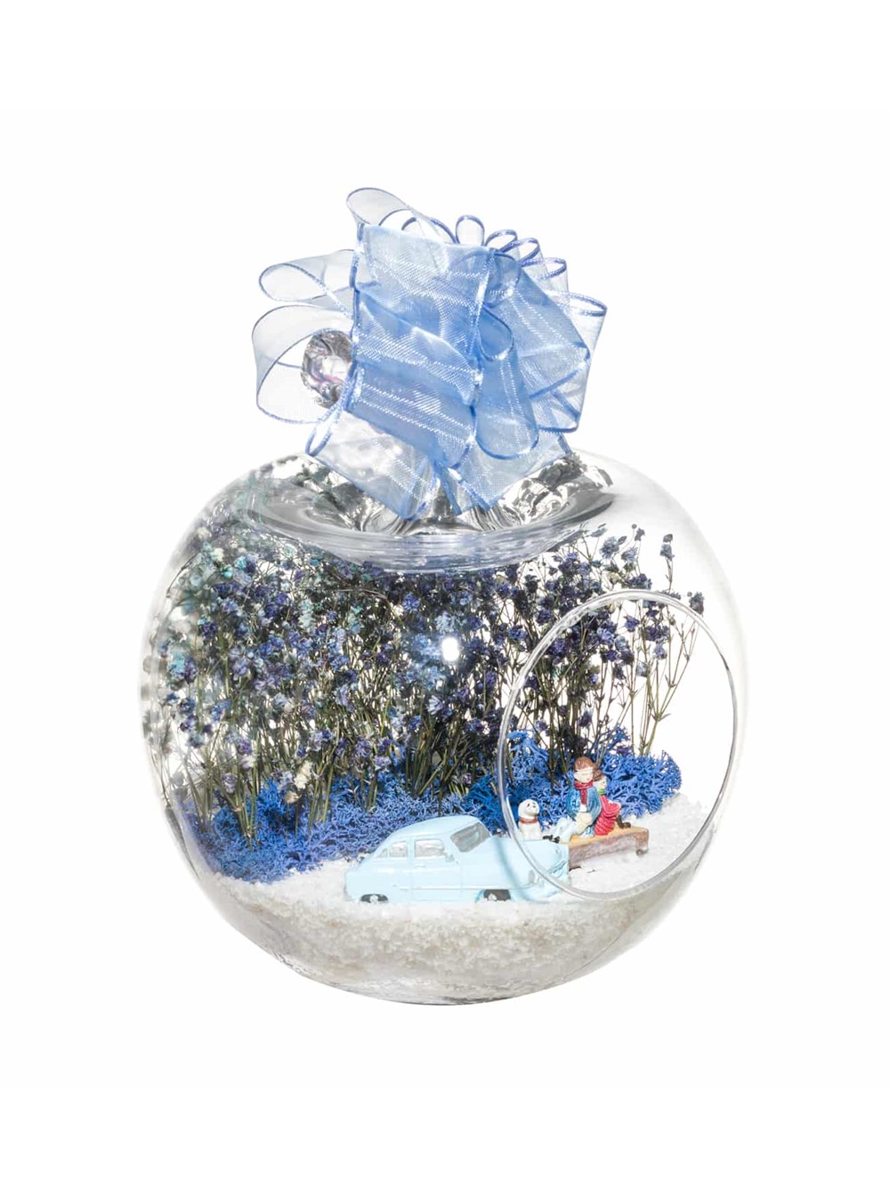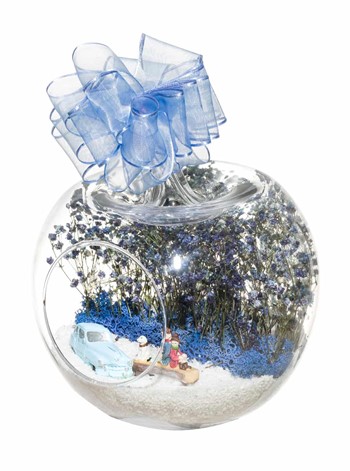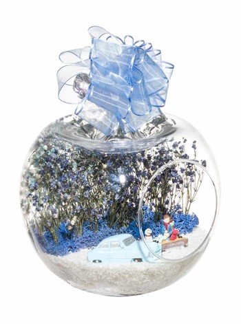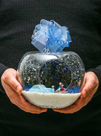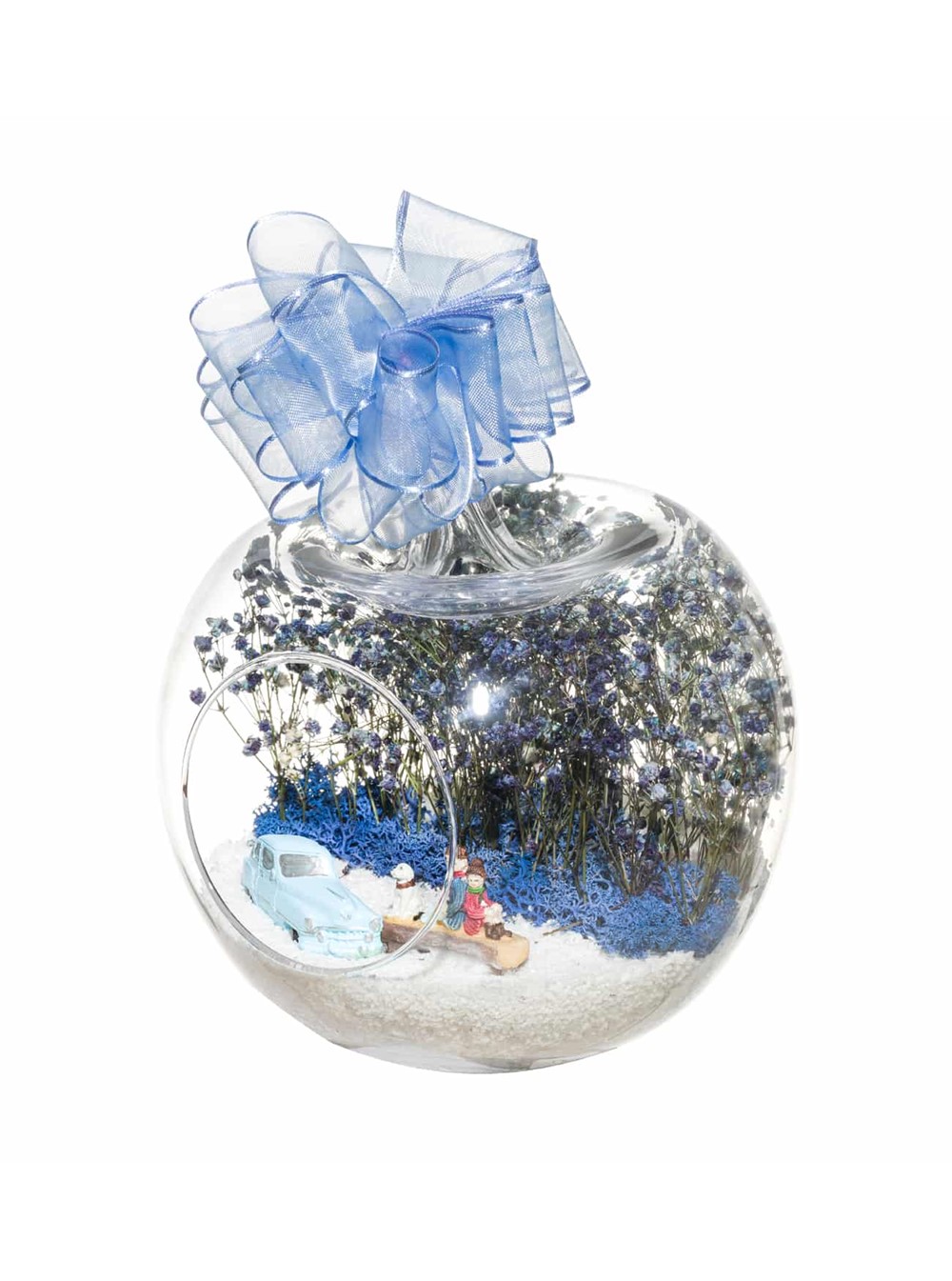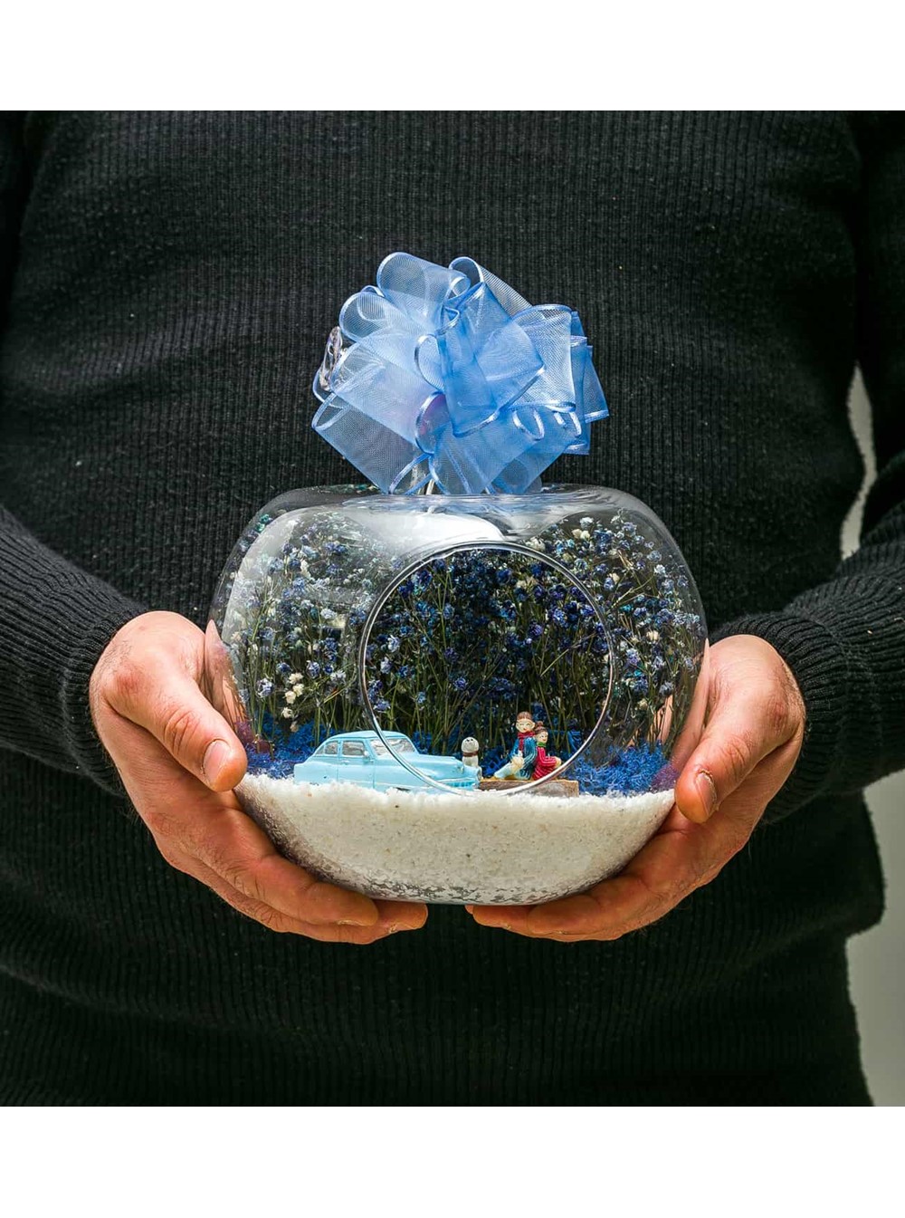 Kurdele takılı küçük boy elma cam fanus içerisinde tasarladığımız bu güzel teraryum; beyaz kum, şoklanmış yosunlar, kurutulmuş bitkiler, bir adet antika otomobil görseli, bir adet bankta sırt sırta oturan aşıkları simgeleyen objelerle tamamlanmıştır. Ev ve ofis ortamlarının tamamında sergilenebilir teraryumun içinde, kurutulmuş ve şoklanmış bitkiler bulunduğundan hava alması önemlidir. Açık olan kısmının kapatılmaması veya büfe vb. kapalı alanlara konulmaması gereklidir. Özellikle her ortamda yıllarca, zevkle izlenebilecek özel bir teraryumdur. Yaklaşık Ölçüleri: 20x20cm NOT: Teraryumlarda kullanılan camlar, üfleme cam işçiliğiyle üretildiğinden bazı detaylarda farklılıklar gözlenebilir. Örneğin, sap kısmı ve ağız bitiş noktalarının her biri kendine özgüdür.