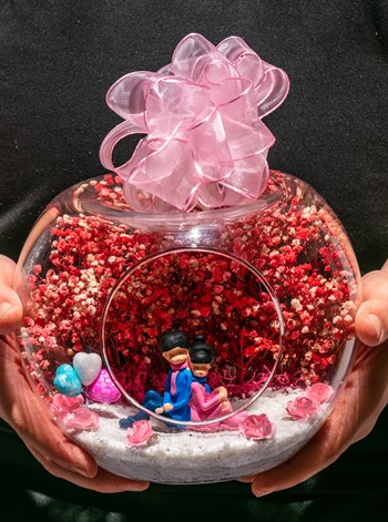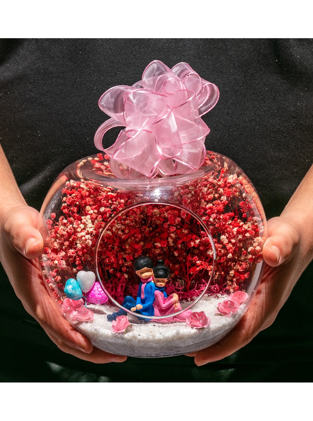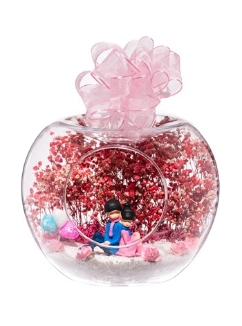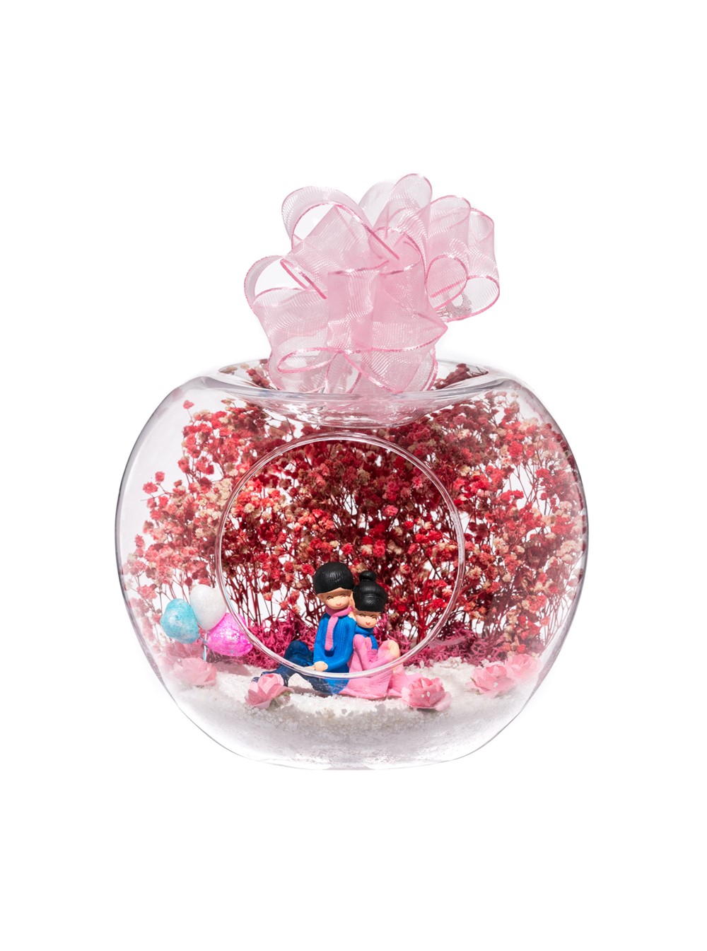 Küçük boy elma cam fanus içerisinde tasarladığımız bu kurdeleli teraryum; beyaz kum, yapay mini güller, renkli simli kalpler, kurutulmuş bitkilerle beraber bir adet sırt sırta anın tadını çıkartan sevgilileri simgeleyen objeyle tamamlanmıştır. Ev ve ofis ortamlarının tamamında sergilenebilir teraryumun içinde, kurutulmuş bitkiler bulunduğundan hava alması önemlidir. Açık olan kısmının kapatılmaması veya büfe vb. kapalı alanlara konulmaması gereklidir. Özellikle her ortamda, zevkle izlenebilecek çok özel bir teraryumdur. Yaklaşık Ölçüleri: 20x20cm NOT: Teraryumlarda kullanılan camlar, üfleme cam işçiliğiyle üretildiğinden bazı detaylarda farklılıklar gözlenebilir. Örneğin, sap kısmı ve ağız bitiş noktalarının her biri kendine özgüdür.