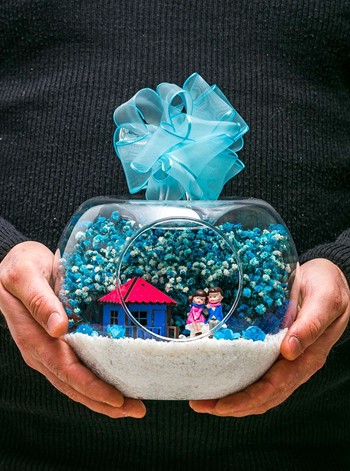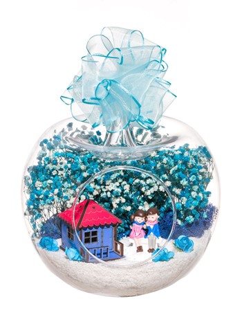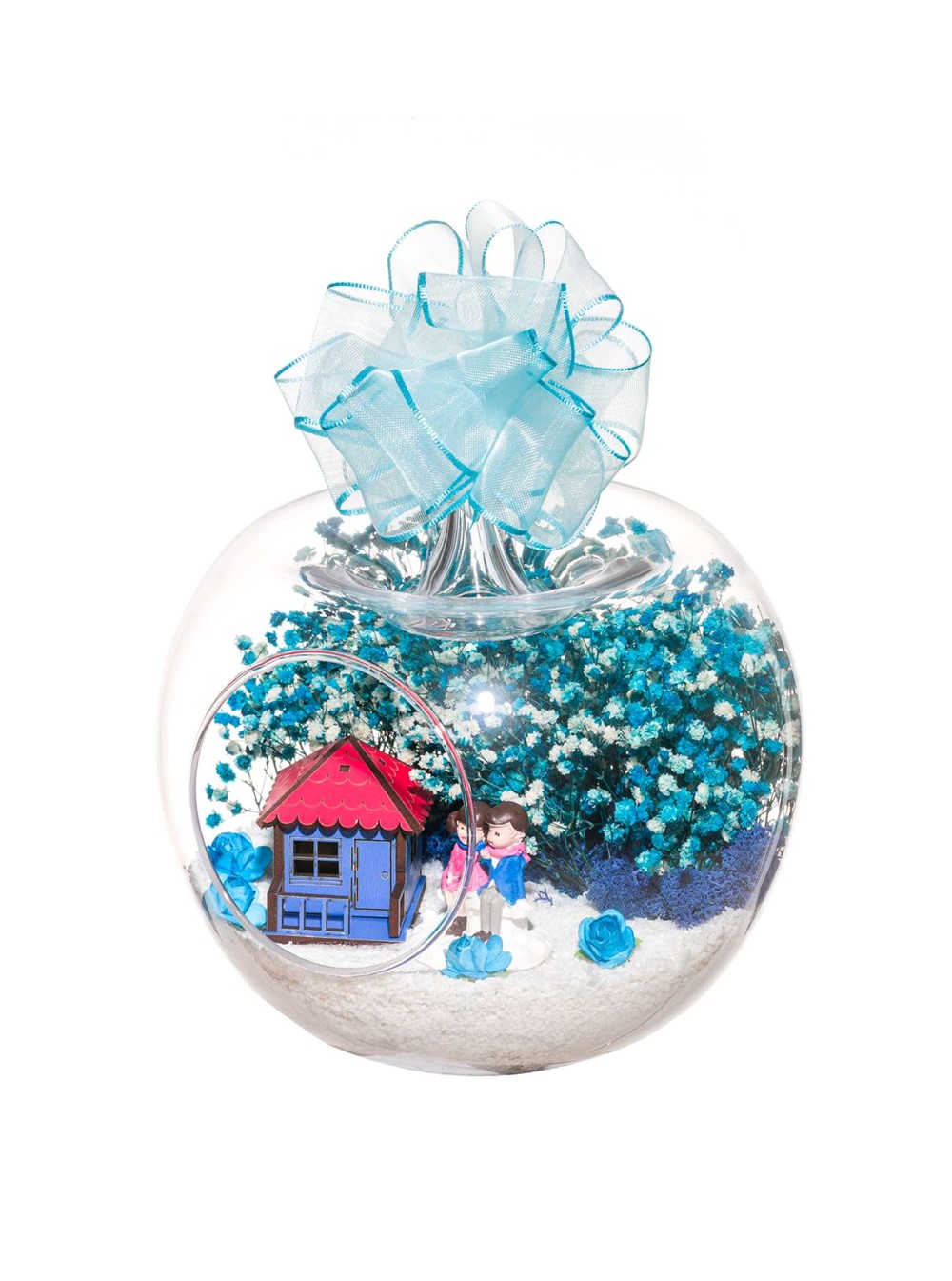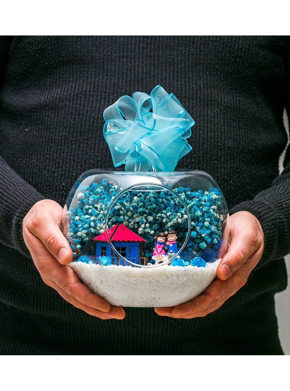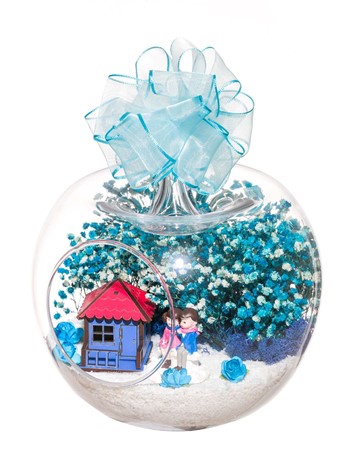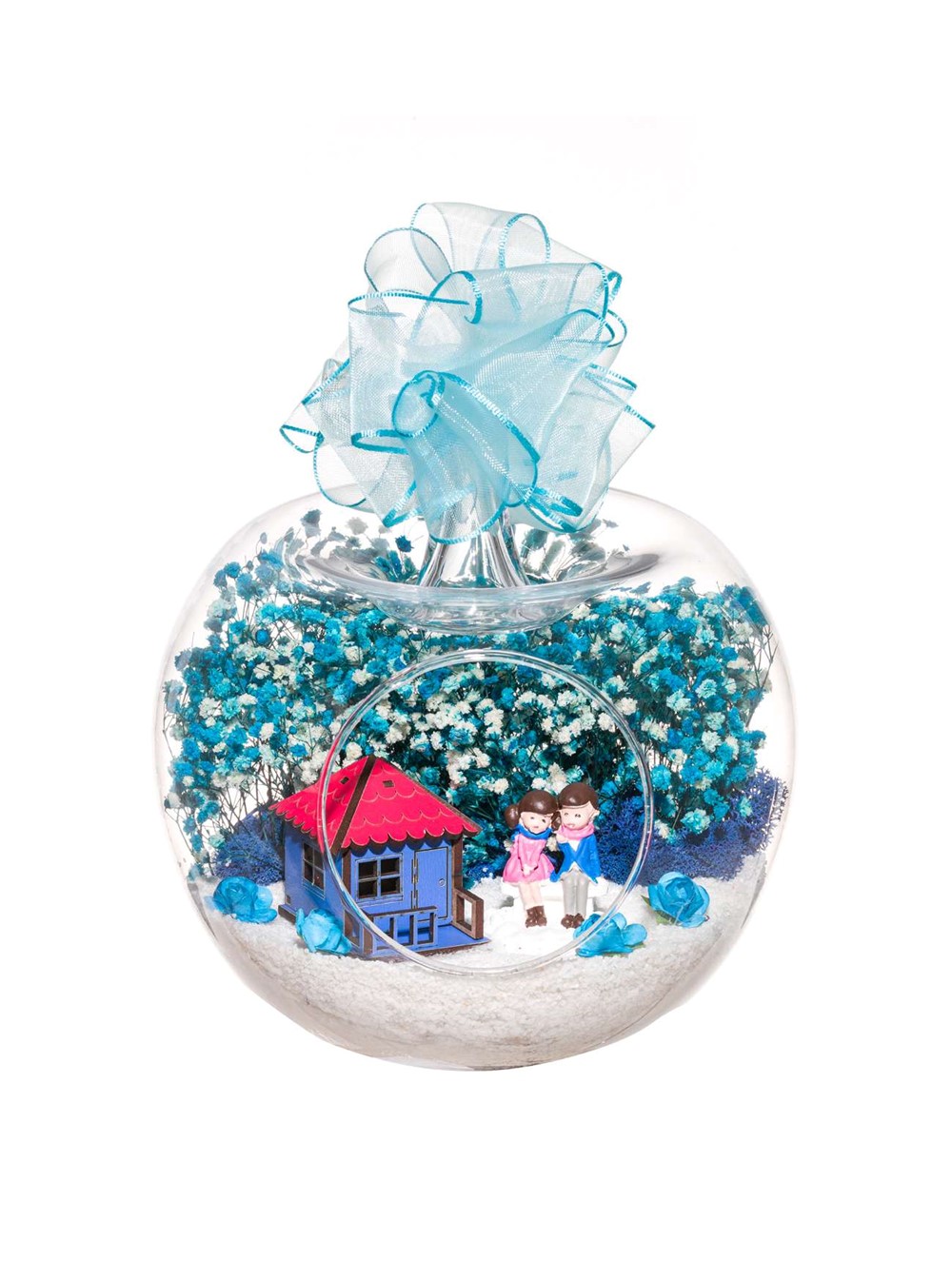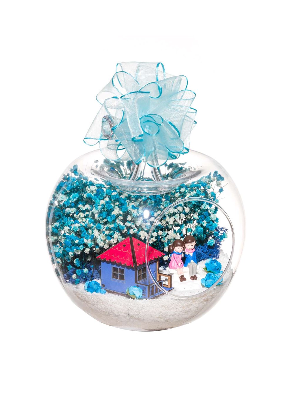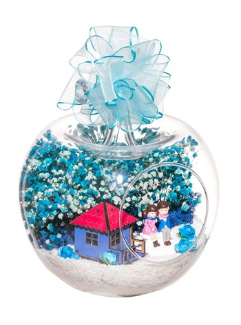 Kurdele takılmış küçük boy elma cam fanus içerisinde tasarladığımız buanlamlıteraryum; beyaz kum, kurutulmuş bitkiler, şoklanmış yosunlar, yapay mini güller, bir adet ahşap mavi ev ve bahçelerinde yan yana oturmuş keyifle sohbet eden aşıkları simgeleyen objeler kullanılarak tamamlanmıştır. Ev ve ofis ortamlarının tamamında sergilenebilir teraryumun içinde,kurutulmuş ve şoklanmış bitkiler bulunduğundan hava alması önemlidir. Açık olan kısmının kapatılmaması veya büfe vb. kapalı alanlara konulmaması gereklidir. Özellikle her ortamda yıllarca, zevkle izlenebilecek özel bir teraryumdur. Yaklaşık Ölçüleri: 20x20cm NOT: Teraryumlarda kullanılan camlar, üfleme cam işçiliğiyle üretildiğinden bazı detaylarda farklılıklar gözlenebilir. Örneğin, sap kısmı ve ağız bitiş noktalarının her biri kendine özgüdür.
