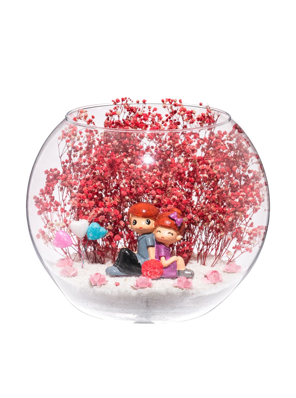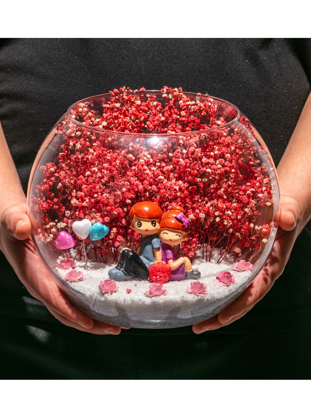 Orta boy açık cam fanus içerisinde hazırlanan bu özgün teraryum; beyaz kum, kurutulmuş bitkiler, yapay mini güller, renkli simli kalpler ve sırt sırta oturmuş anın tadını çıkartan aşıkları simgeleyen objeyle birlikte kurgulanmıştır. Ev ve ofis ortamlarının tamamında sergilenebilir teraryumun içinde, kurutulmuş ve şoklanmış bitkiler bulunduğundan hava alması önemlidir. Açık olan kısmının kapatılmaması veya büfe vb. kapalı alanlara konulmaması gereklidir. Özellikle her ortamda zevkle izlenebilecek özel bir teraryumdur. Yaklaşık Ölçüler: 19x23 cm'dir.