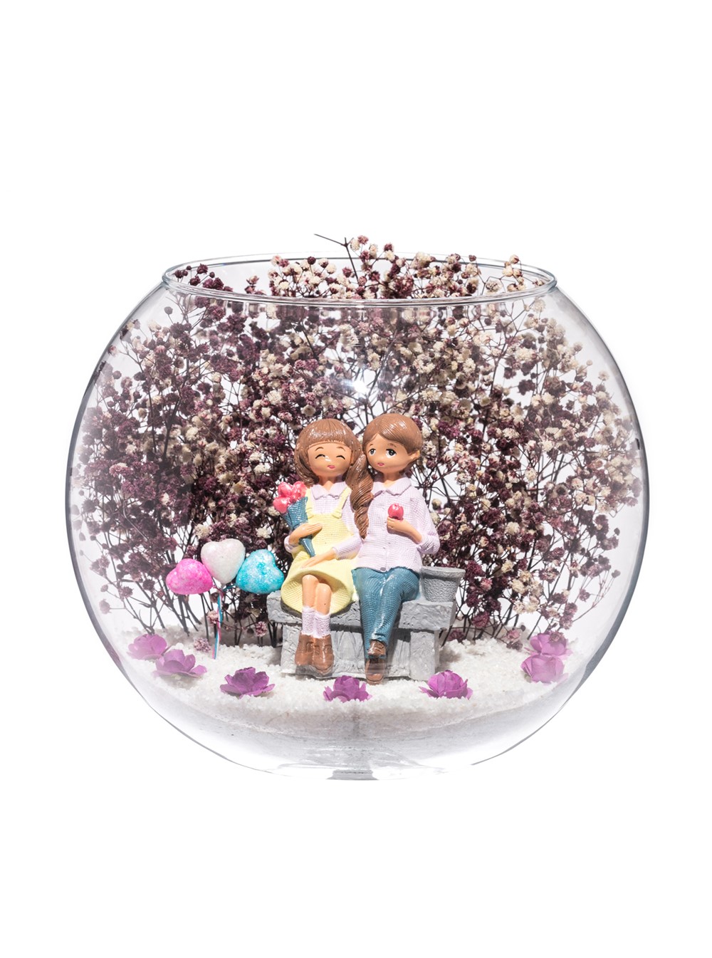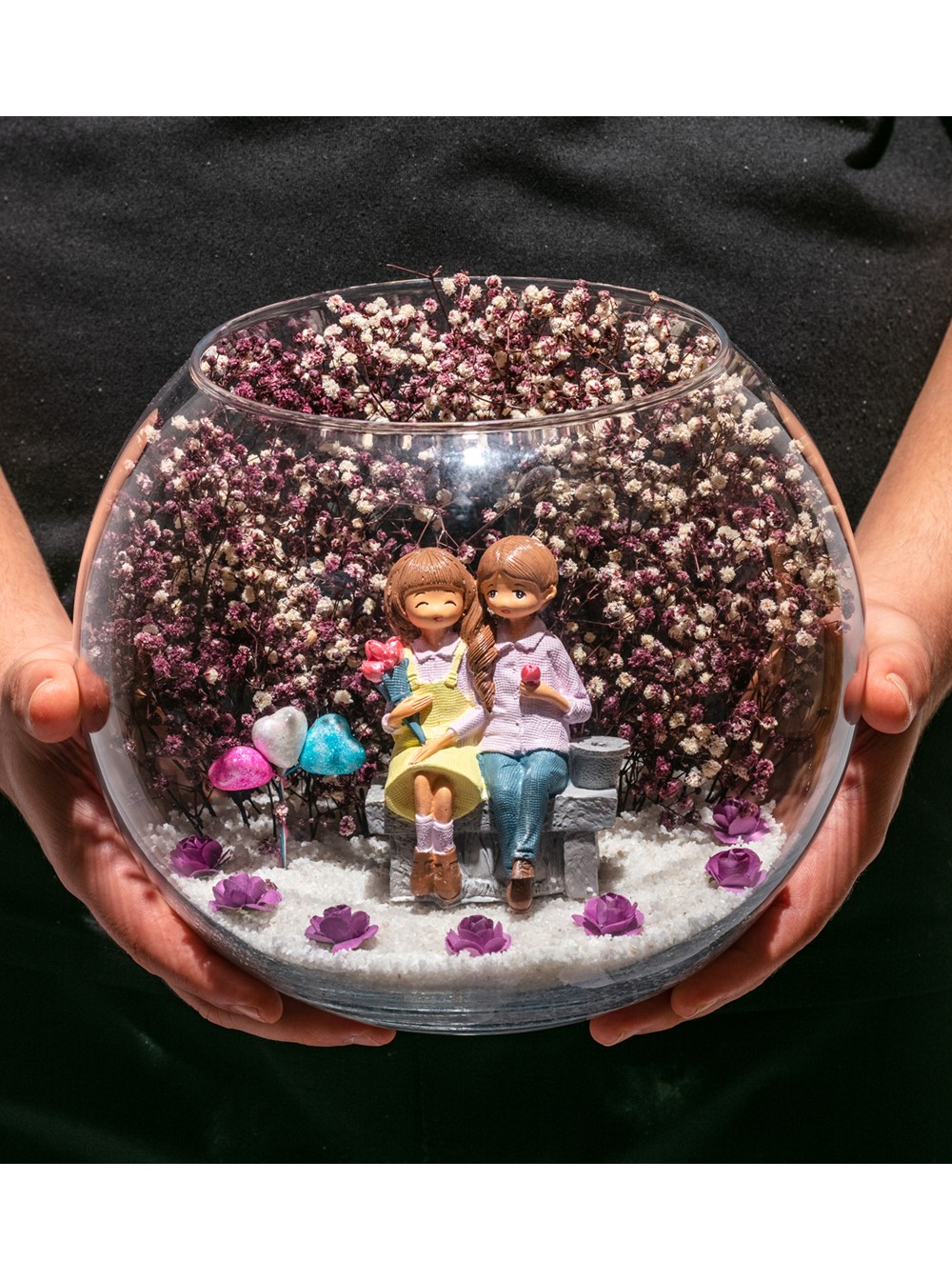 Orta boy açık cam fanus içerisinde hazırlanan bu özgün teraryum; beyaz kum, kurutulmuş bitkiler, yapay mini güller, renkli simli kalpler ve yan yana oturmuş anın tadını çıkartan aşıkları simgeleyen objeyle birlikte kurgulanmıştır. Ev ve ofis ortamlarının tamamında sergilenebilir teraryumun içinde, kurutulmuş ve şoklanmış bitkiler bulunduğundan hava alması önemlidir. Açık olan kısmının kapatılmaması veya büfe vb. kapalı alanlara konulmaması gereklidir. Özellikle her ortamda zevkle izlenebilecek özel bir teraryumdur. Yaklaşık Ölçüler: 19x23 cm'dir.