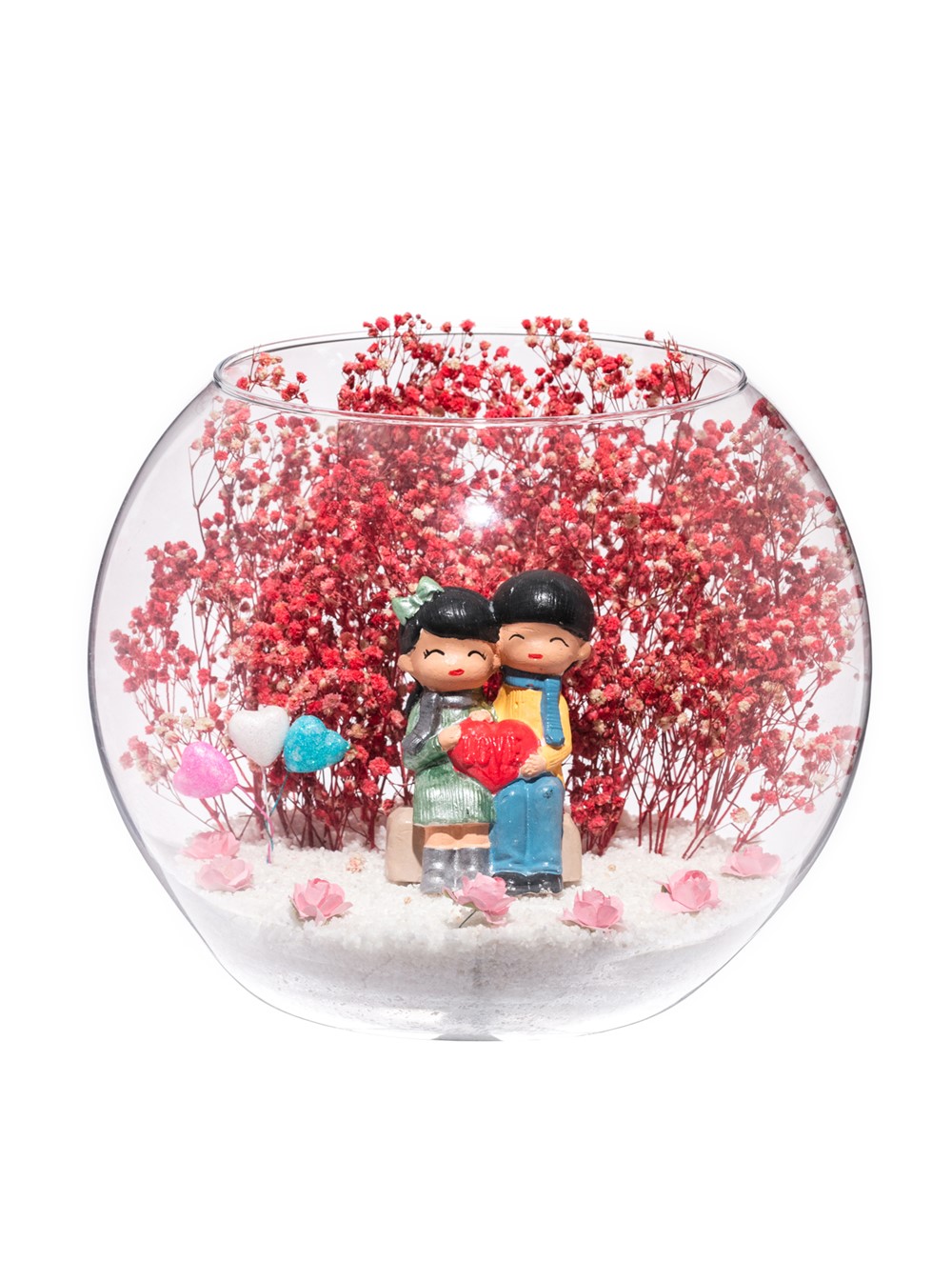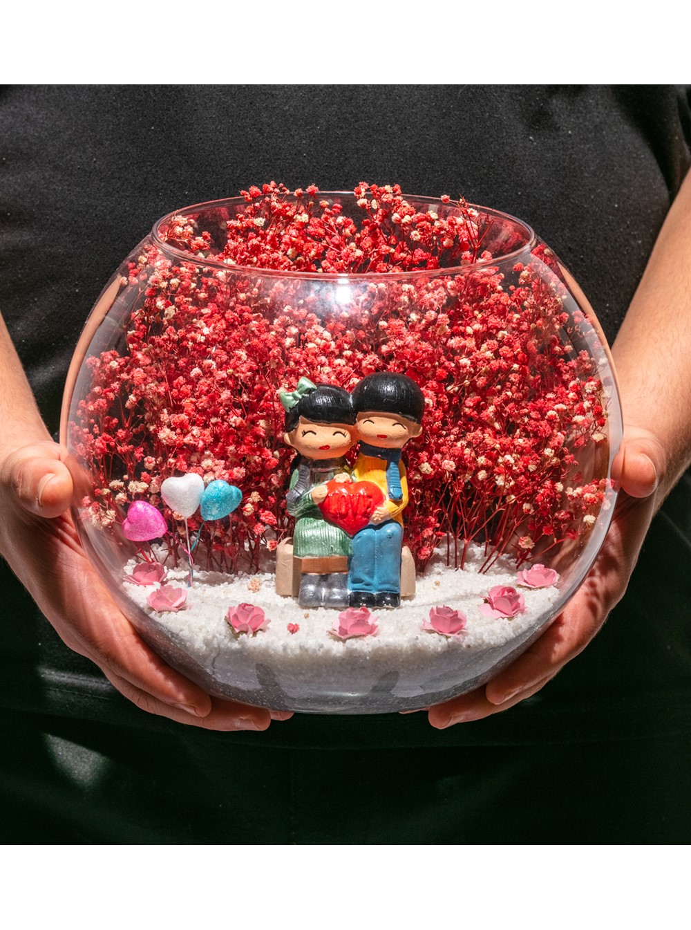 Orta boy açık cam fanus içerisinde hazırlanan bu özgün teraryum; beyaz kum, kurutulmuş bitkiler, yapay mini güller, renkli simli kalpler ve yan yana oturmuş anın tadını çıkartan aşıkları simgeleyen objeyle birlikte kurgulanmıştır. Ev ve ofis ortamlarının tamamında sergilenebilir teraryumun içinde, kurutulmuş ve şoklanmış bitkiler bulunduğundan hava alması önemlidir. Açık olan kısmının kapatılmaması veya büfe vb. kapalı alanlara konulmaması gereklidir. Özellikle her ortamda zevkle izlenebilecek özel bir teraryumdur. Yaklaşık Ölçüler: 19x23 cm'dir.