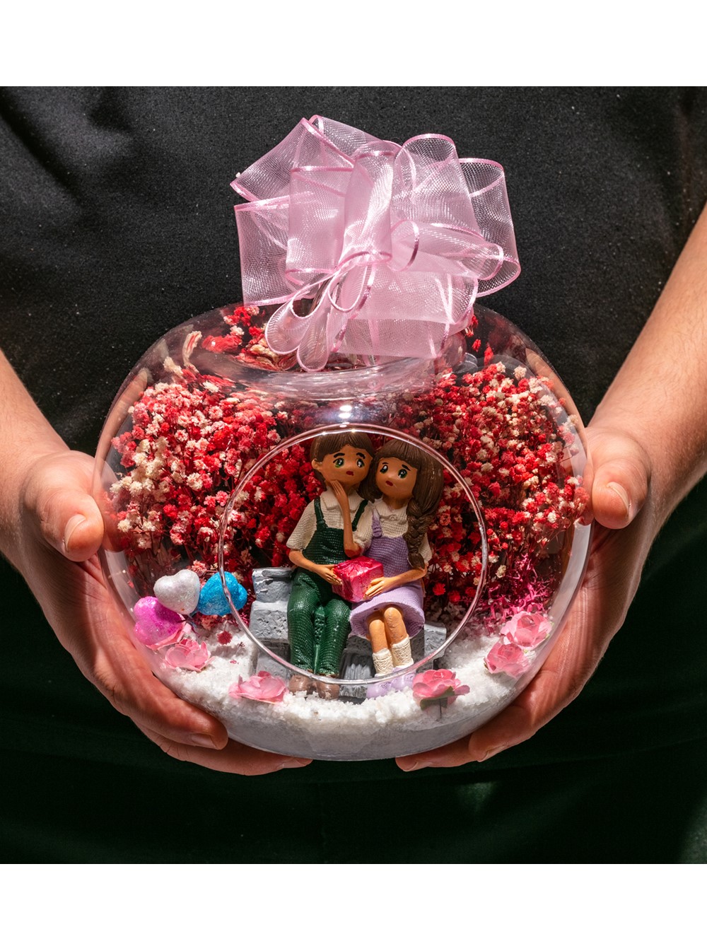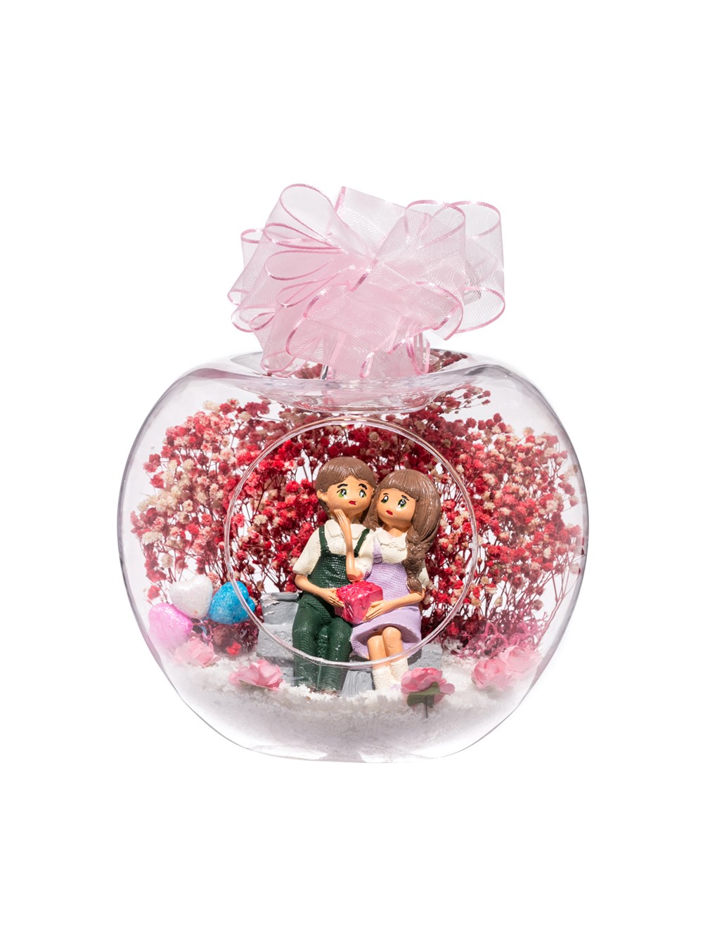 Küçük boy elma cam fanus içerisinde tasarladığımız bu kurdeleli teraryum; beyaz kum, yapay mini güller, renkli simli kalpler, kurutulmuş bitkilerle beraber bir adet ellerinde hediye paketi tutan sevgilileri simgeleyen objeyle tamamlanmıştır. Ev ve ofis ortamlarının tamamında sergilenebilir teraryumun içinde, kurutulmuş bitkiler bulunduğundan hava alması önemlidir. Açık olan kısmının kapatılmaması veya büfe vb. kapalı alanlara konulmaması gereklidir. Özellikle her ortamda, zevkle izlenebilecek çok özel bir teraryumdur. Yaklaşık Ölçüleri: 20x20cm NOT: Teraryumlarda kullanılan camlar, üfleme cam işçiliğiyle üretildiğinden bazı detaylarda farklılıklar gözlenebilir. Örneğin, sap kısmı ve ağız bitiş noktalarının her biri kendine özgüdür.