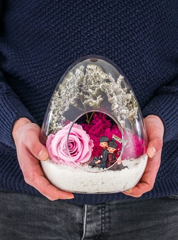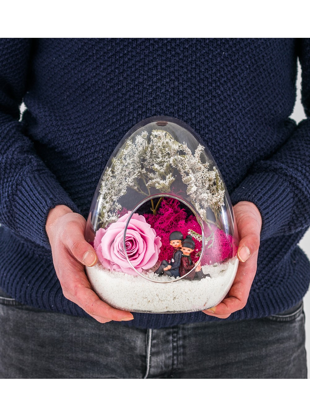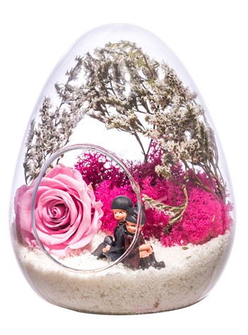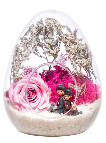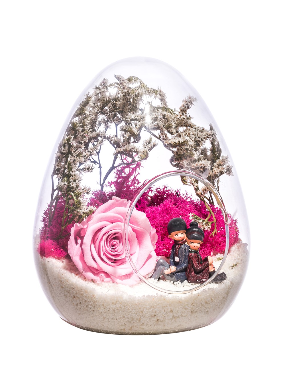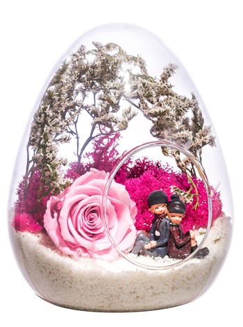 Küçük boy yumurta cam fanus içerisinde tasarladığımız teraryum; beyaz kum, şoklanmış yosunlar, kurutulmuş bitkiler, bir adet solmayan gül ve sırt sırta oturan sevgilileri simgeleyen objeyle tamamlanmıştır. Ev ve ofis ortamlarının tamamında sergilenebilir teraryumun içinde canlı bitki bulunmadığından, herhangi bir bakıma ihtiyacı yoktur. Özellikle her ortamda yıllarca, zevkle izlenebilecek çok özel bir teraryumdur. Yaklaşık Ölçüleri: 18x22cm