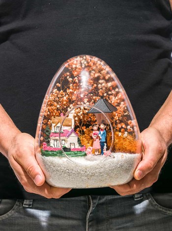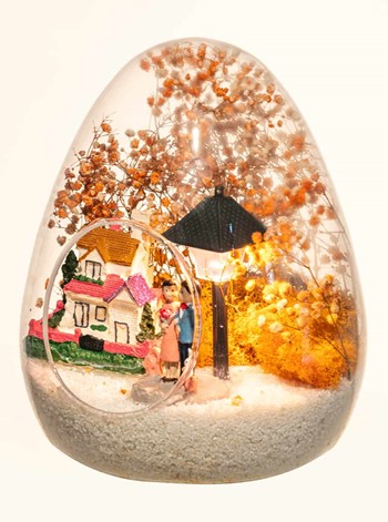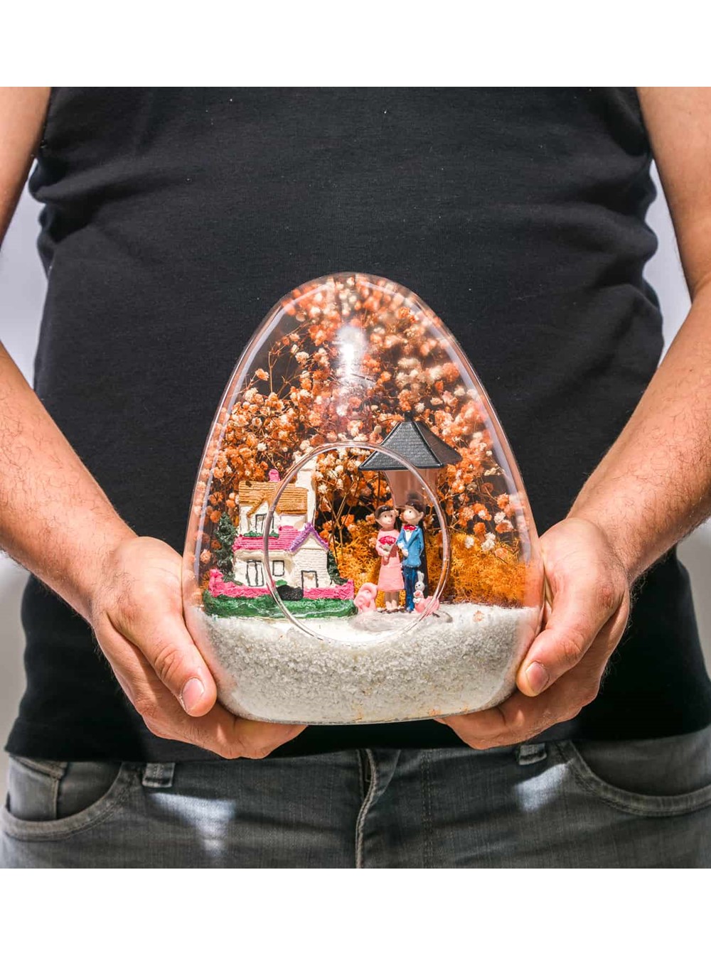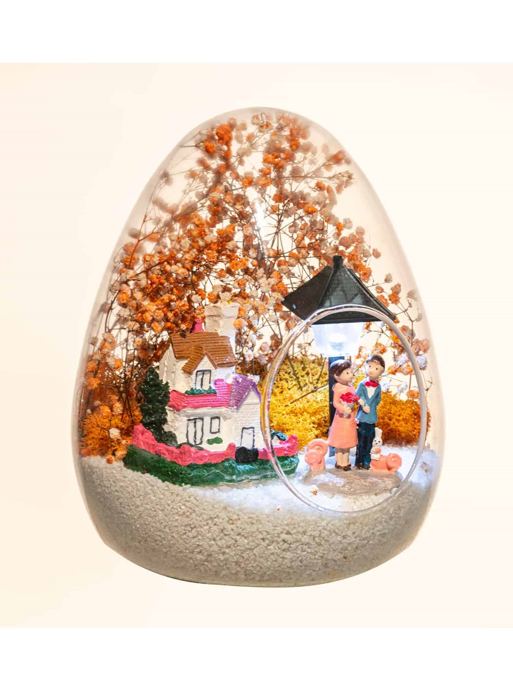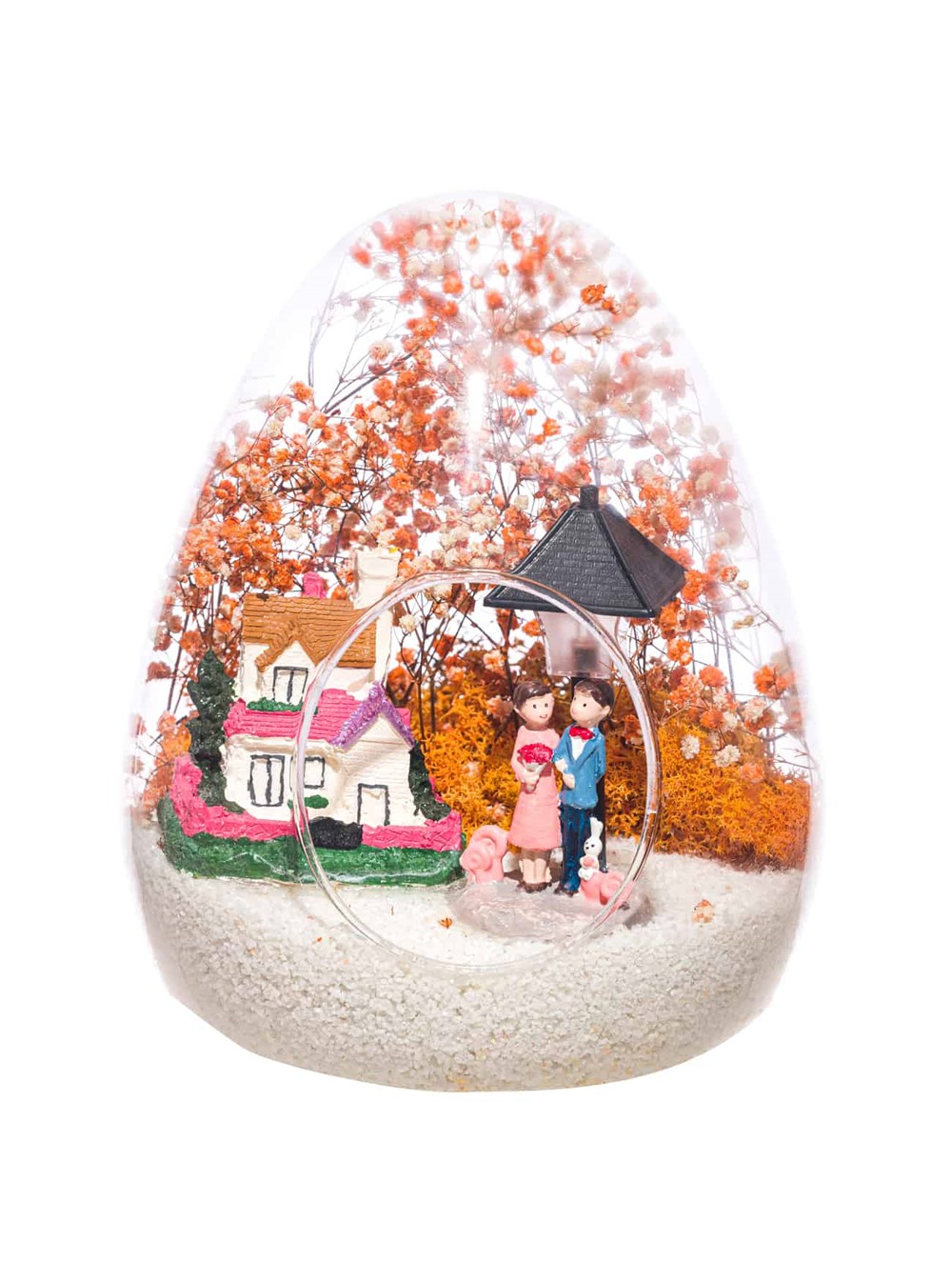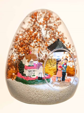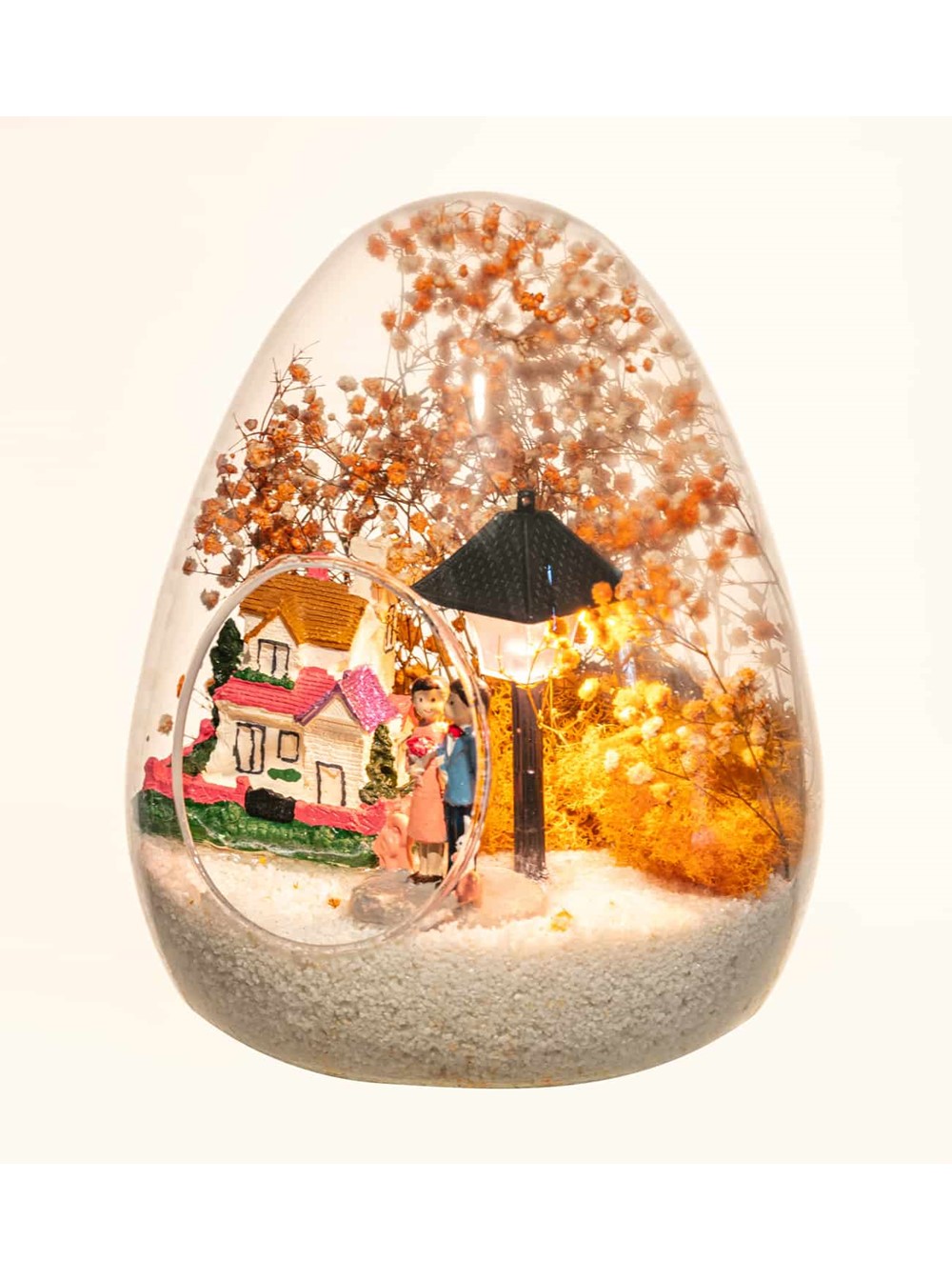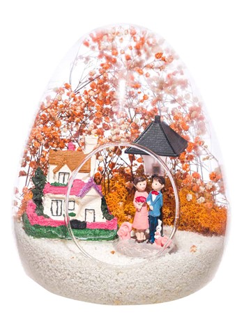 Küçük boy yumurta cam fanus içerisinde tasarladığımız bu güzel teraryum; beyaz kum, kurutulmuş bitkiler, şoklanmış yosunlar, bir adet taş ev, bir adet ışığı iki farklı renkte yanan lamba ve kol kola saadetlerini yudumlayan iki yetişkin görselleriyle tamamlanmıştır. Ev ve ofis ortamlarının tamamında sergilenebilir teraryumun içinde, kurutulmuş ve şoklanmış bitkiler bulunduğundan hava alması önemlidir. Açık olan kısmının kapatılmaması veya büfe vb. kapalı alanlara konulmaması gereklidir. Özellikle her ortamda yıllarca, zevkle izlenebilecek özel bir teraryumdur. Yaklaşık Ölçüleri: 18x22cm NOT: Teraryumlarda kullanılan camlar, üfleme cam işçiliğiyle üretildiğinden bazı detaylarda farklılıklar gözlenebilir. Örneğin, sap kısmı ve ağız bitiş noktalarının her biri kendine özgüdür.