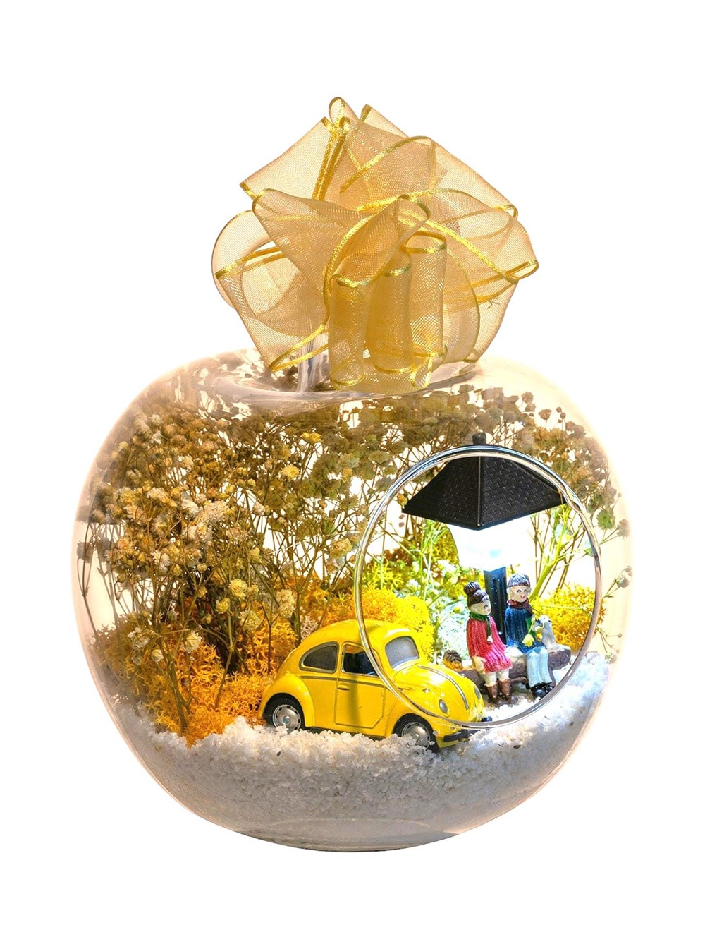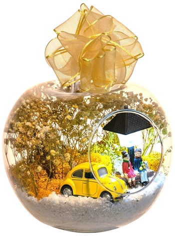 Küçük boy elma cam fanus içerisinde tasarladığımız bu güzelteraryum; beyaz kum, şoklanmış yosunlar, kurutulmuş bitkiler, bir adet vosvos araba, bir adet köpekleriyle yan yana oturan mutlu çift, bir adet işığı 2 farklı renkte yanan lamba ve üzerinde kurdelasıyla sizler için tasarlanmıştır. Ev ve ofis ortamlarının tamamında sergilenebilir teraryumun içinde canlı bitki bulunmadığından, herhangi bir bakıma ihtiyacı yoktur. Özellikle her ortamda yıllarca, zevkle izlenebilecek özel bir teraryumdur. Yaklaşık Ölçüleri: 20x20cm NOT:Teraryumlarda kullanılan camlar, üfleme cam işçiliğiyleüretildiğinden bazı detaylarda farklılıklar gözlenebilir. Örneğin, sap kısmı ve ağız bitiş noktalarının her biri kendine özgüdür.