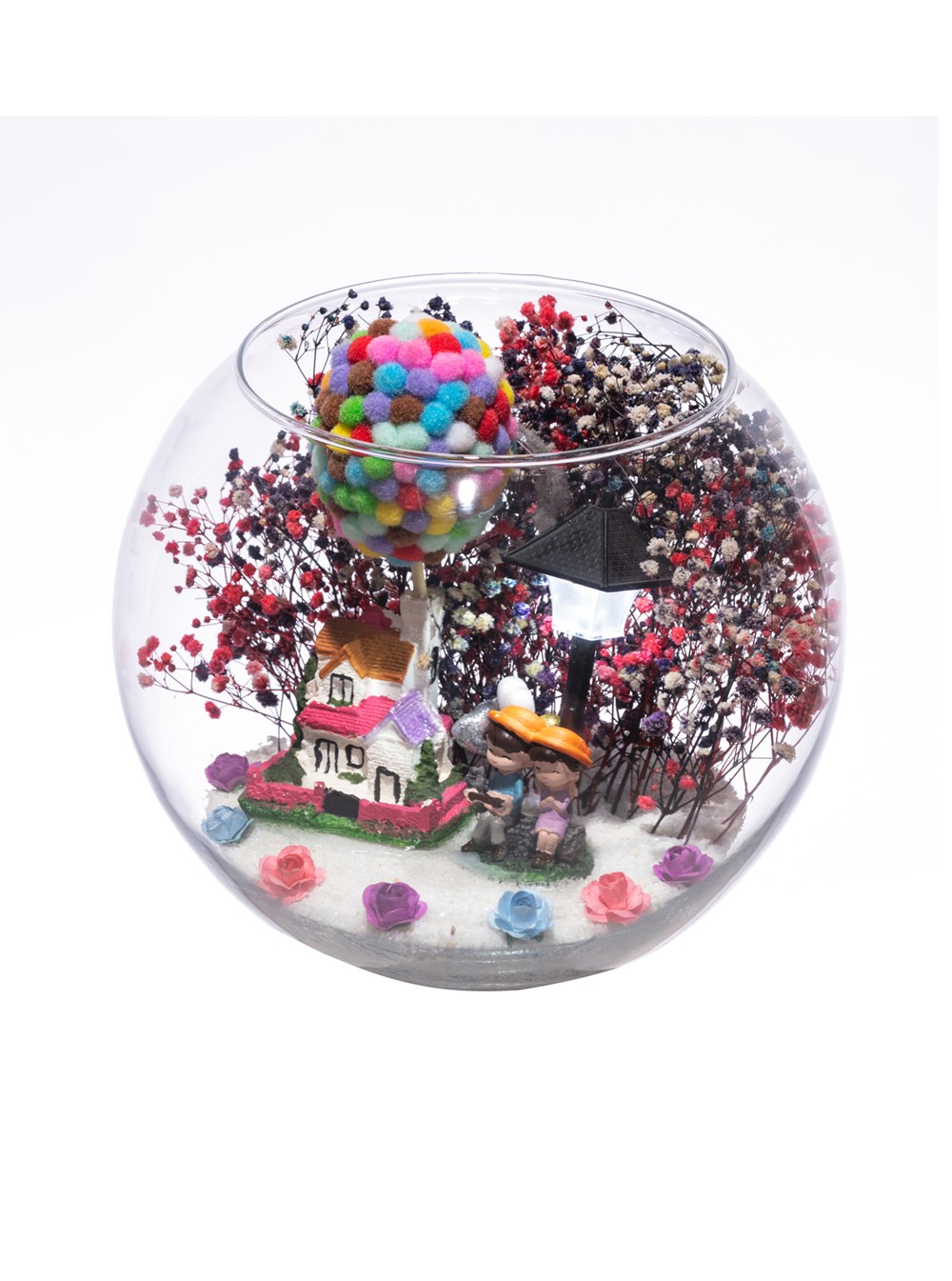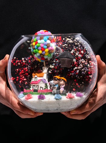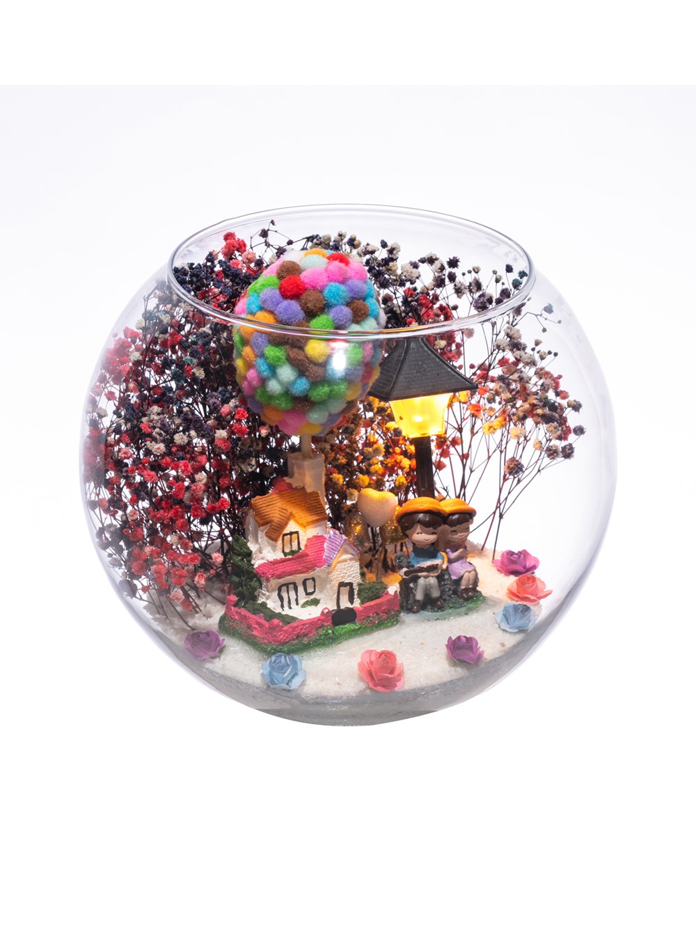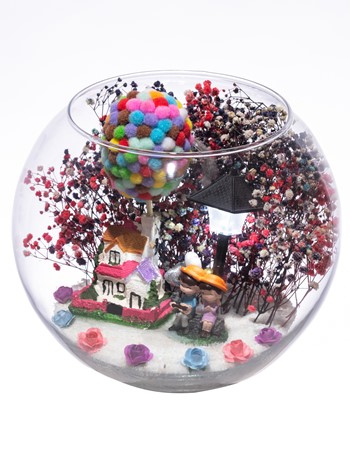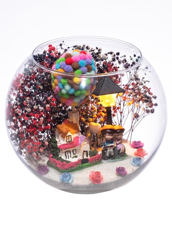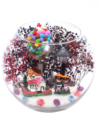 Orta boy açık cam fanus içerisinde hazırlanan, isminin hakkını veren bu özgün teraryum; beyaz kum, karışık renkli kurutulmuş bitkiler, renkli mini yapay güller, renkli simli kalpler, üzerinde renkli balonlarıyla bir adet taş ev, bir adet ışığı iki farklı renkte yanan led lamba ve yan yana oturmuş anın tadını çıkartan sevgilileri simgeleyen objeler ile birlikte kurgulanmıştır. Ev ve ofis ortamlarının tamamında sergilenebilir teraryumun içinde, kurutulmuş ve şoklanmış bitkiler bulunduğundan hava alması önemlidir. Açık olan kısmının kapatılmaması veya büfe vb. kapalı alanlara konulmaması gereklidir. Özellikle her ortamda yıllarca, zevkle izlenebilecek özel bir teraryumdur. Yaklaşık Ölçüler: 19x23 cm'dir.