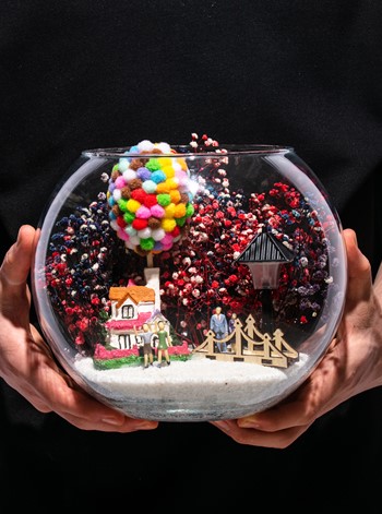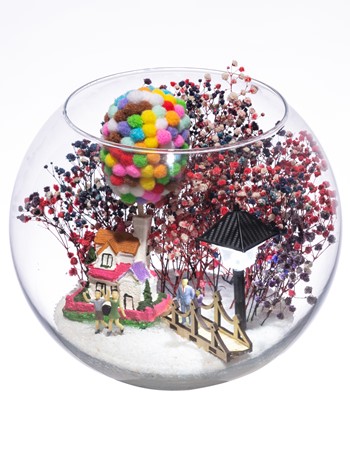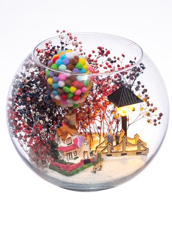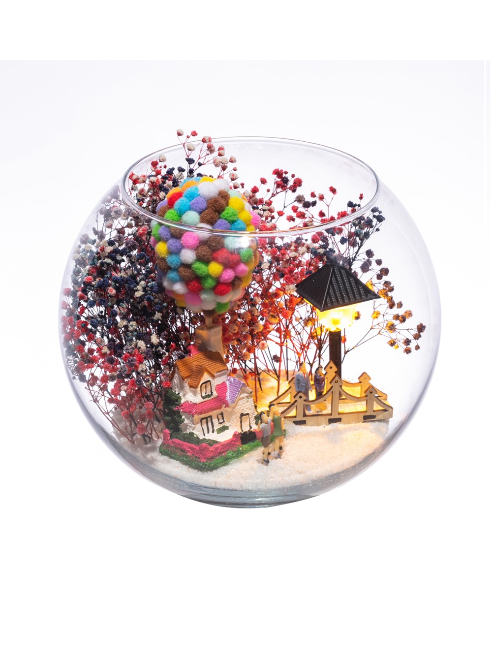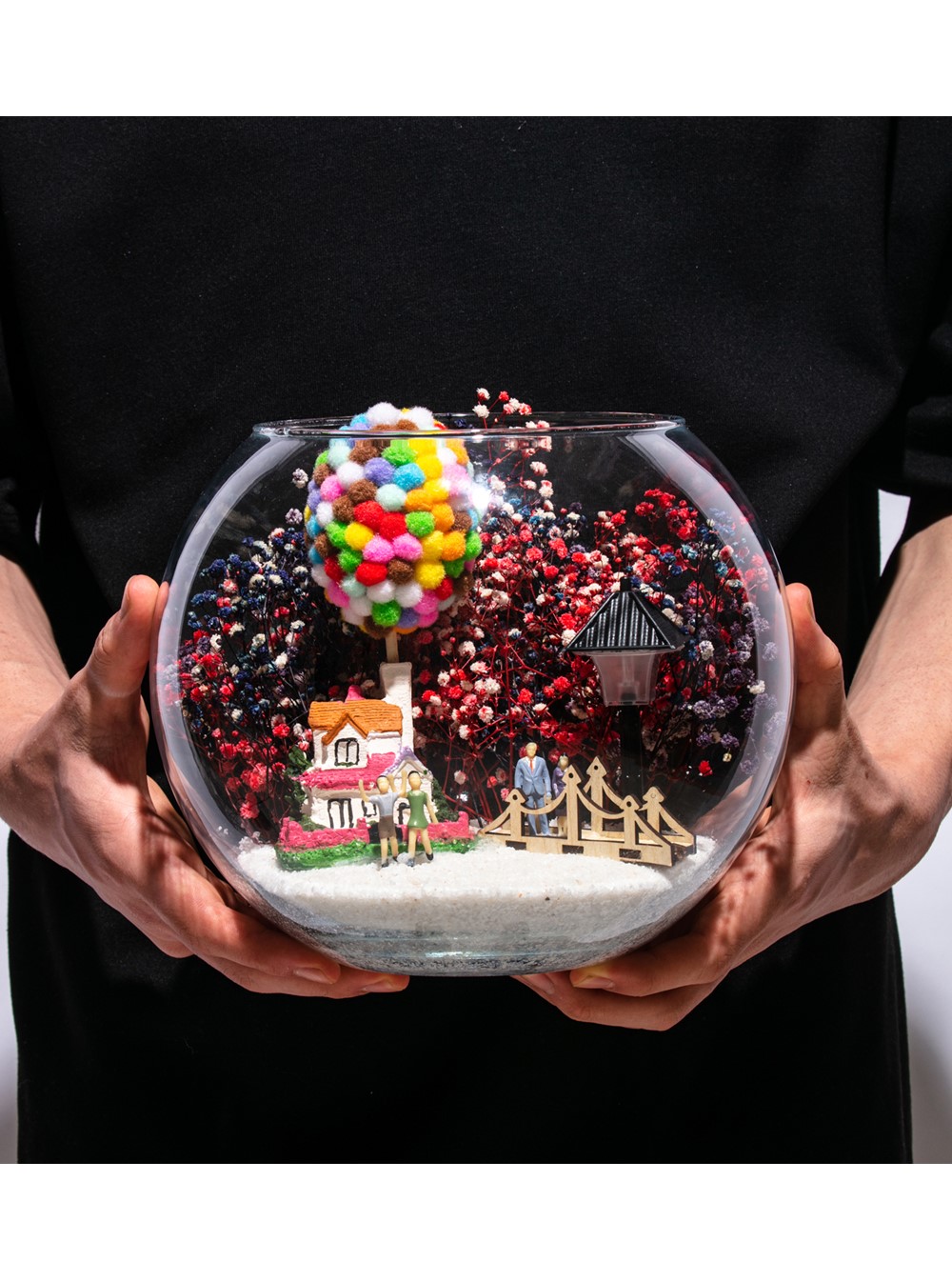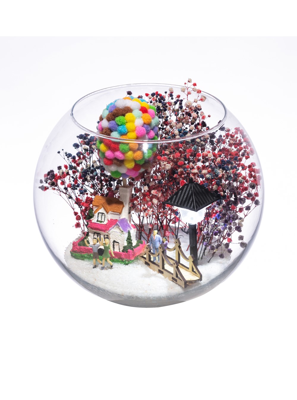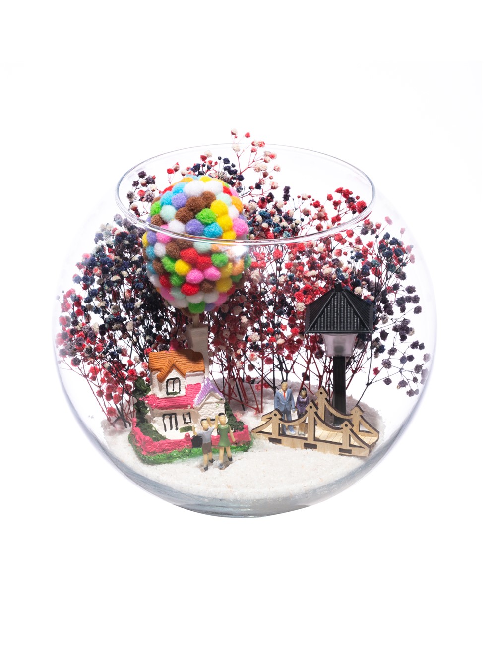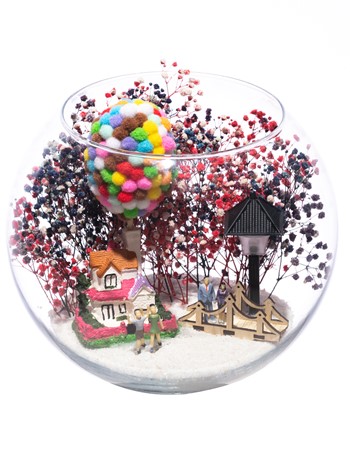 Orta boy açık cam fanus içerisinde hazırlanan, isminin hakkını veren bu özgün teraryum; beyaz kum, karışık renkli kurutulmuş bitkiler, üzerinde renkli balonlarıyla bir adet taş ev, bir adet ışığı iki farklı renkte yanan led lamba, bir adet üzerinde bir çiftle ahşap köprü ve evin bahçesinde oynayan iki adet çocuğu simgeleyen objeler ile birlikte kurgulanmıştır. Ev ve ofis ortamlarının tamamında sergilenebilir teraryumun içinde, kurutulmuş ve şoklanmış bitkiler bulunduğundan hava alması önemlidir. Açık olan kısmının kapatılmaması veya büfe vb. kapalı alanlara konulmaması gereklidir. Özellikle her ortamda yıllarca, zevkle izlenebilecek özel bir teraryumdur. Yaklaşık Ölçüler: 19x23 cm'dir.