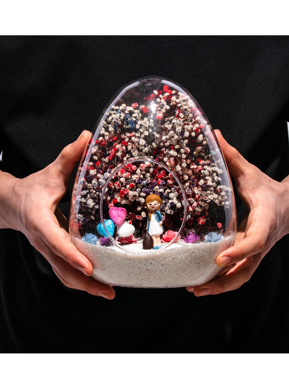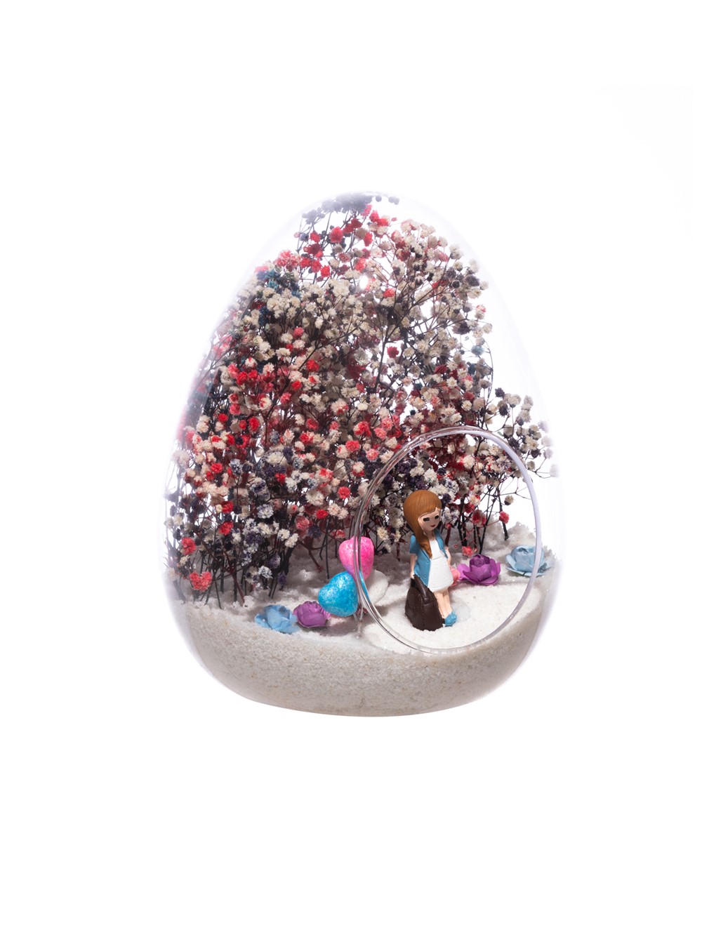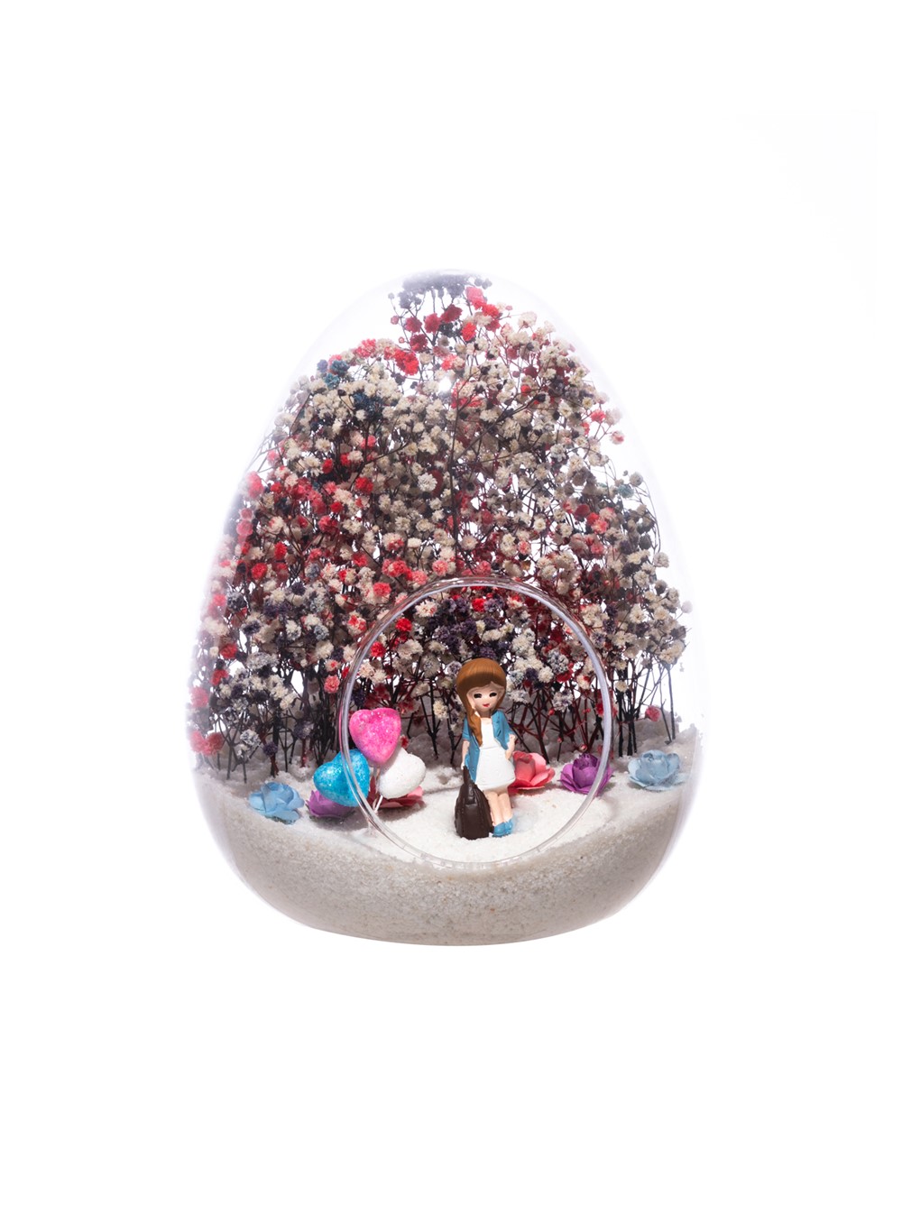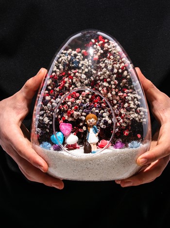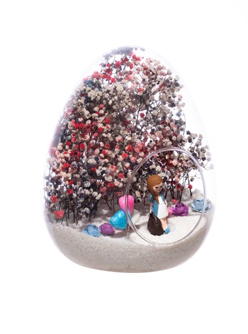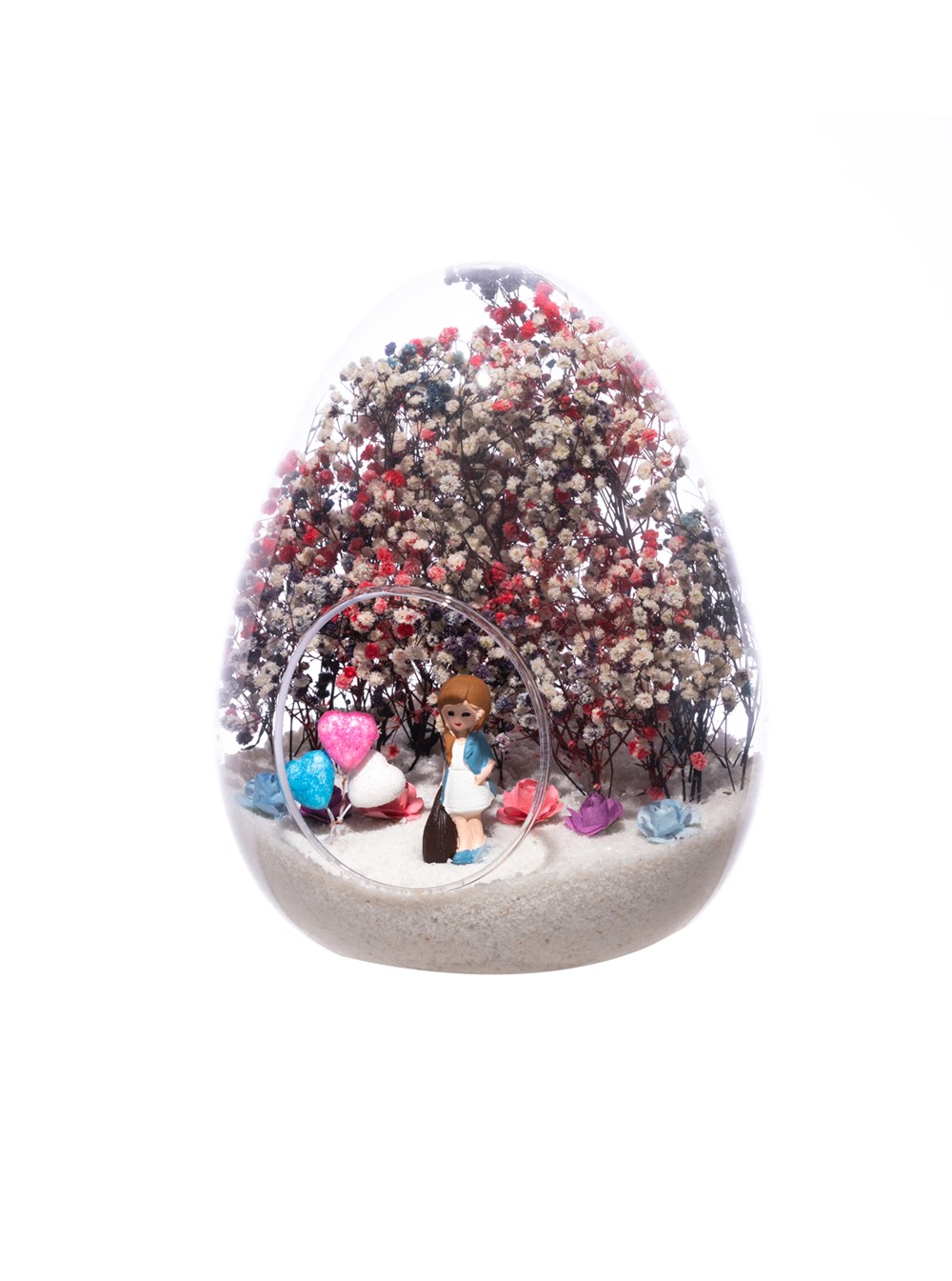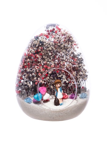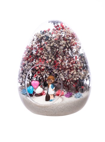 Küçük boy yumurta cam fanus içerisinde tasarladığımız, bu özgün teraryum; beyaz kum, karışık renkli kurutulmuş bitkiler, renkli simli kalpler, renkli mini yapay güller ve elinde çantasıyla bir bayan hemşireyi simgeleyen objeler kullanılarak tamamlanmıştır. Ev ve ofis ortamlarının tamamında sergilenebilir teraryumun içinde, kurutulmuş ve şoklanmış bitkiler olduğundan hava alması önemlidir. Açık olan kısmının kapatılmaması veya büfe vb. kapalı alanlara konulmaması gereklidir. Özellikle her ortamda yıllarca, zevkle izlenebilecek özel bir teraryumdur. Yaklaşık Ölçüleri: 18x22cm NOT: Teraryumlarda kullanılan camlar, üfleme cam işçiliğiyle üretildiğinden bazı detaylarda farklılıklar gözlenebilir. Örneğin, ağız bitiş noktalarının her biri kendine özgüdür.