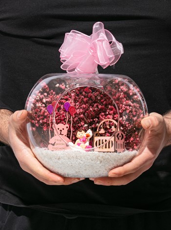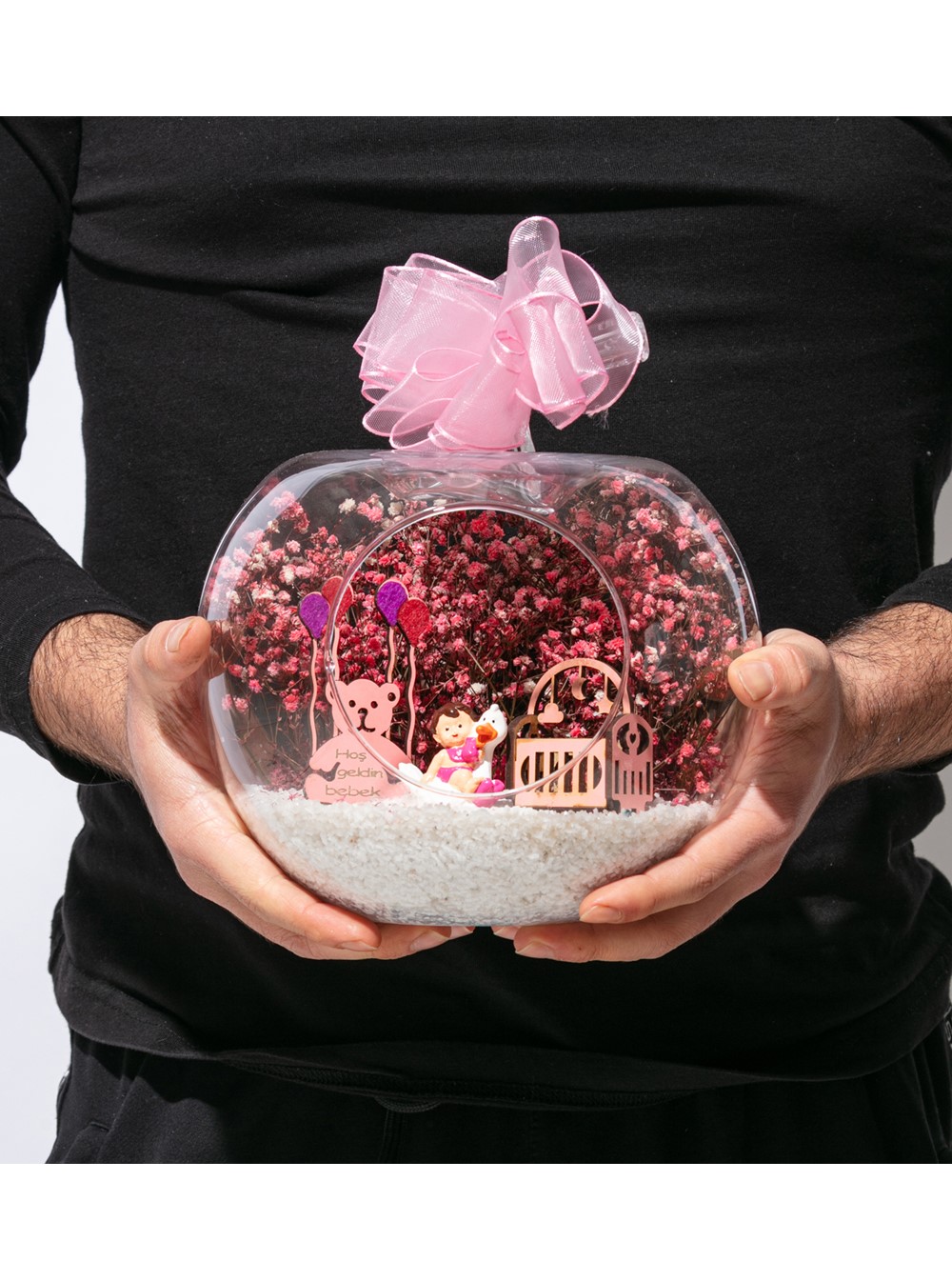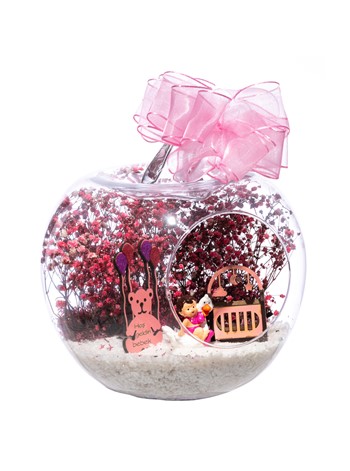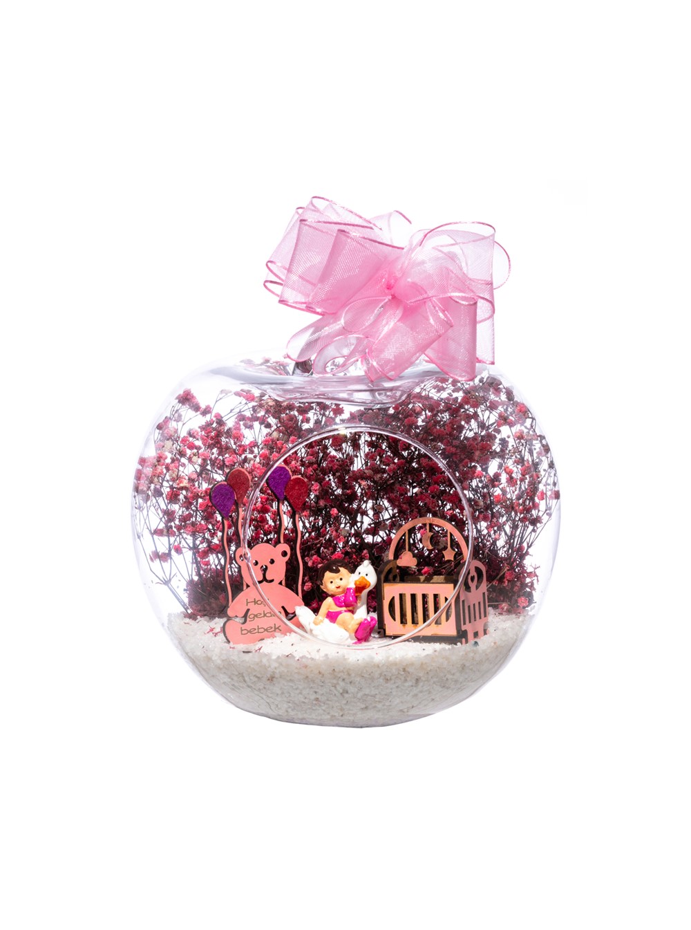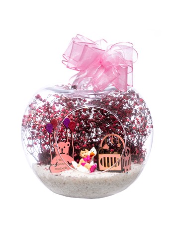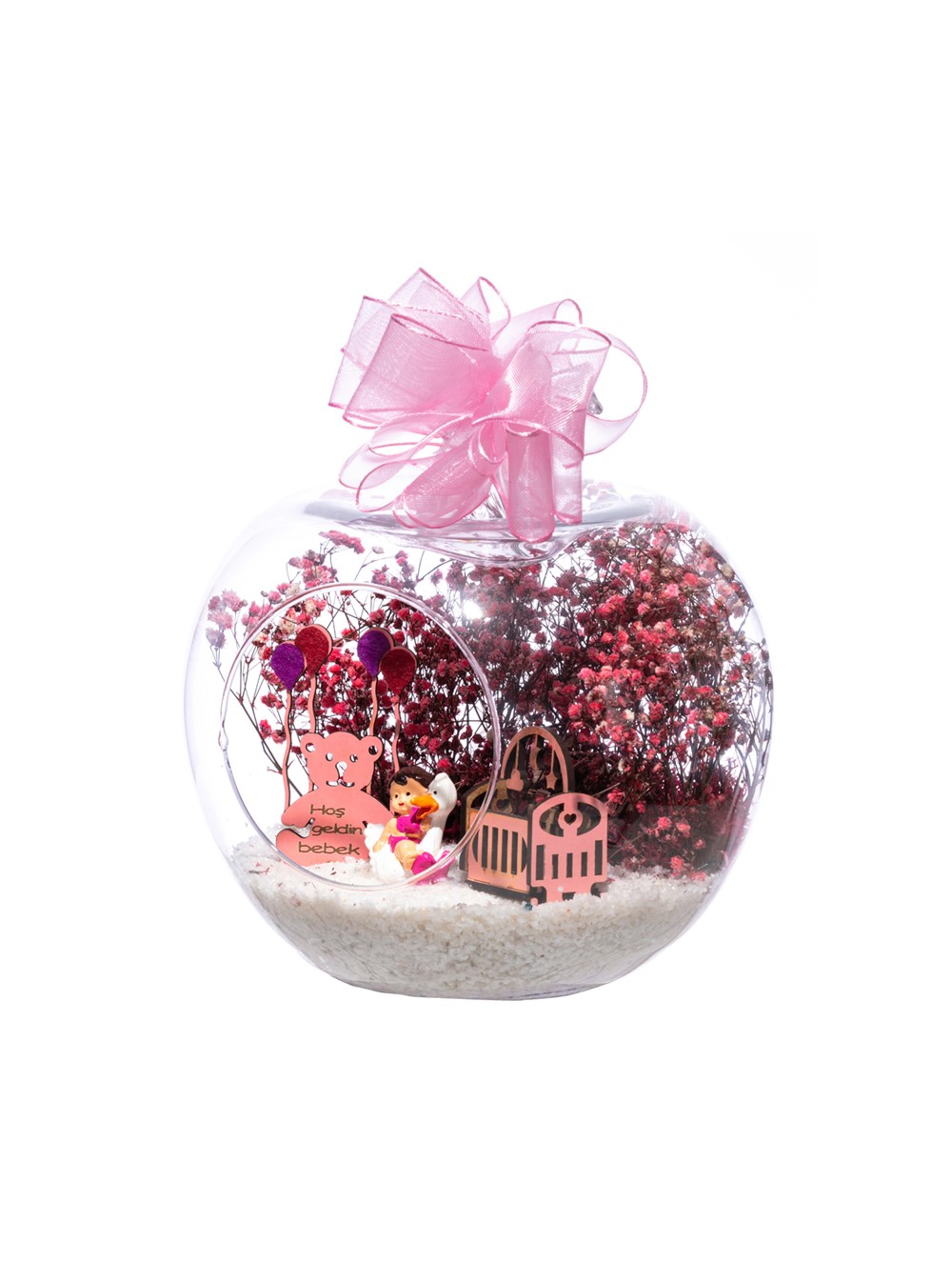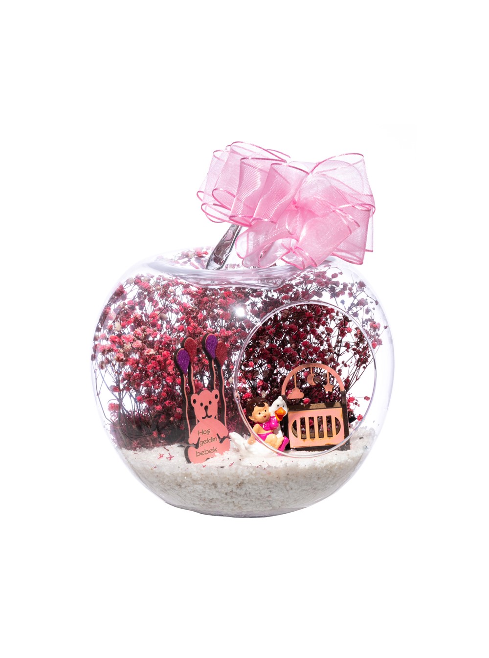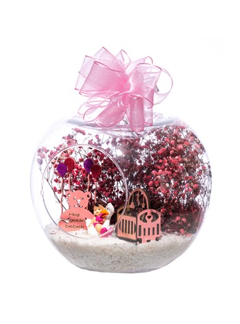 Üzerinde kurdelesiyle küçük boy elma cam fanus içerisinde tasarladığımız bu çok güzel teraryum; beyaz kum, şoklanmış yosunlar, kurutulmuş bitkiler, bir adet ahşap pembe karyola, bir adet balonlu ahşap ayıcık ve bir adet ördek kanadında oturan kız bebek obje kullanılarak tamamlanmıştır. Ev ve ofis ortamlarının tamamında sergilenebilir teraryumun içinde, kurutulmuş ve şoklanmış bitkiler bulunduğundan hava alması önemlidir. Açık olan kısmının kapatılmaması veya büfe vb. kapalı alanlara konulmaması gereklidir. Özellikle her ortamda yıllarca, zevkle izlenebilecek özel bir teraryumdur. Yaklaşık Ölçüleri: 20x20cm NOT: Teraryumlarda kullanılan camlar, üfleme cam işçiliğiyle üretildiğinden bazı detaylarda farklılıklar gözlenebilir. Örneğin, sap kısmı ve ağız bitiş noktalarının her biri kendine özgüdür.