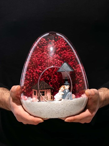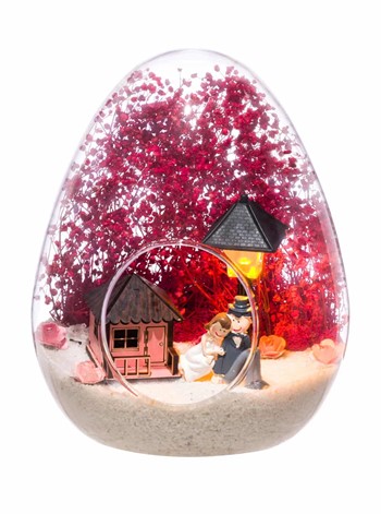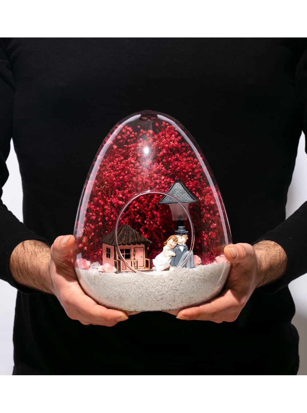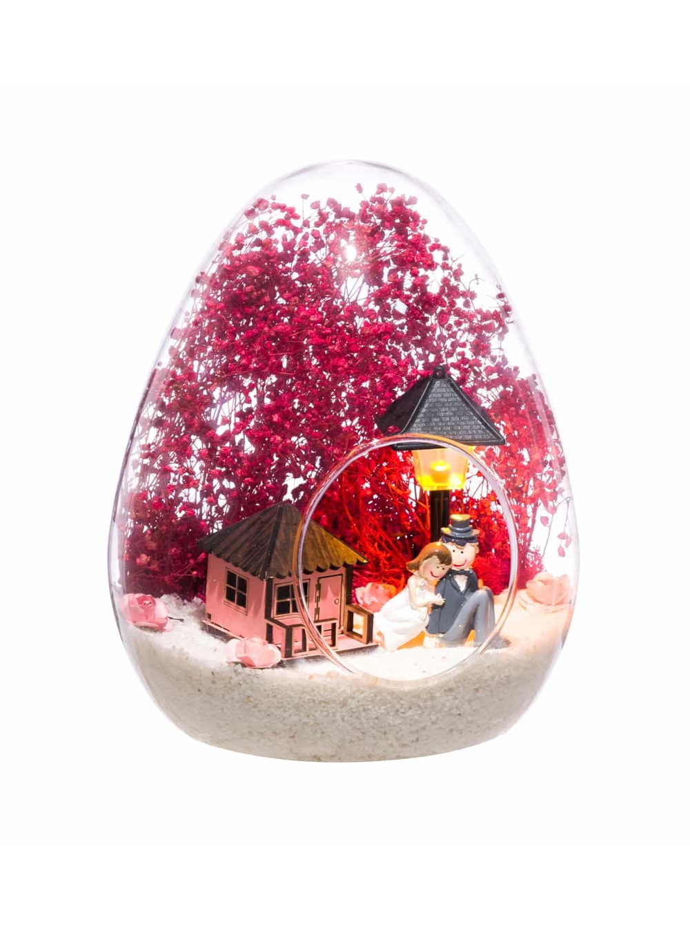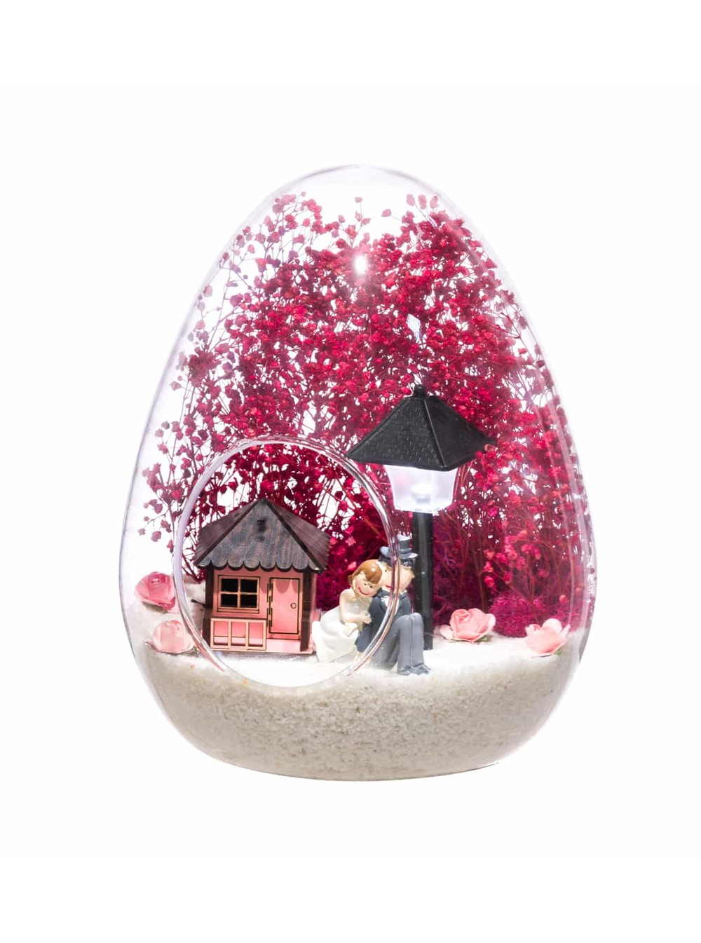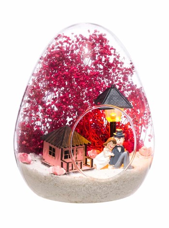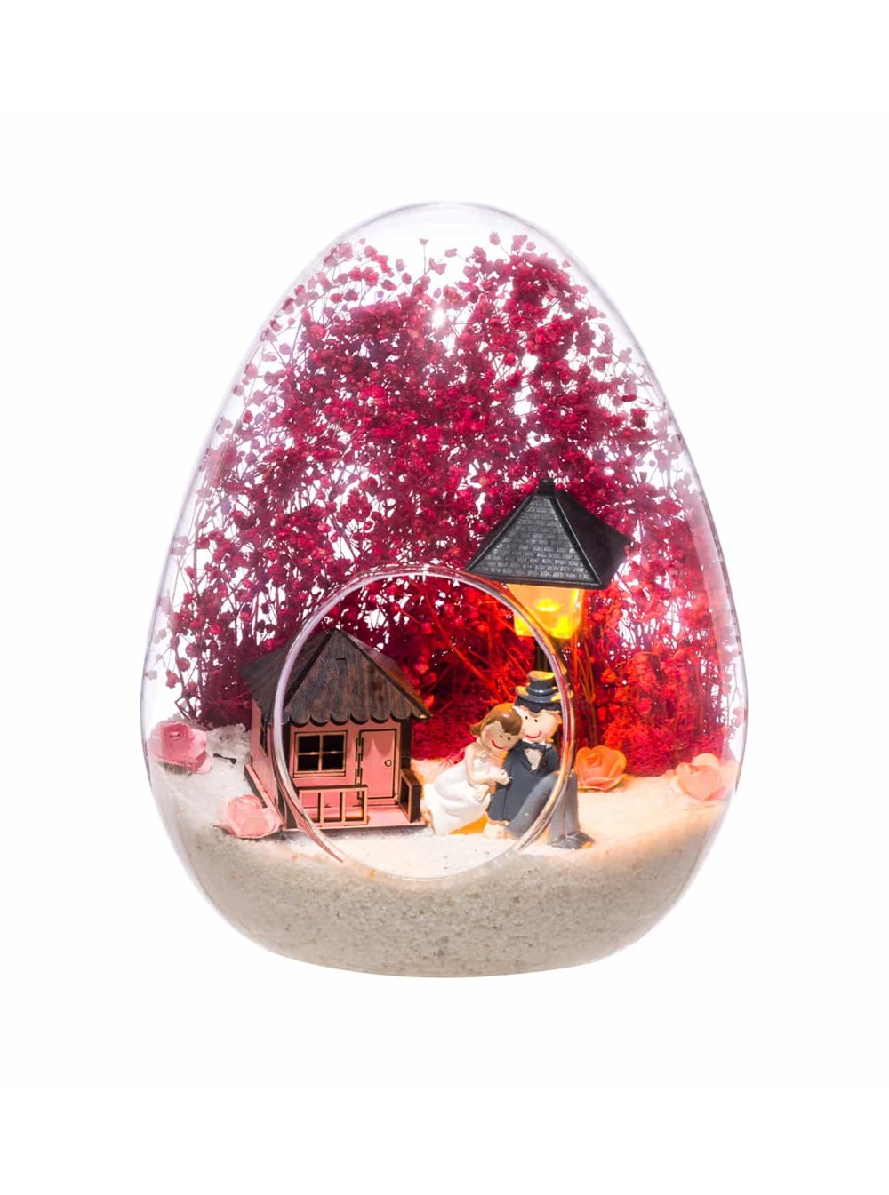 Küçük boy yumurta cam fanus içerisinde tasarladığımız bu güzel teraryum; beyaz kum, kurutulmuş bitkiler, şoklanmış yosunlar, yapay güller, bir adet pembe ahşap ev görseli, bir adet ışığı iki farklı renkte yanan led sokak lambası görseli ve bir adet yeni hayatlarına adım atmış mutlu aşıkları simgeleyen objekullanılarak tamamlanmıştır. Ev ve ofis ortamlarının tamamında sergilenebilir teraryumun içinde, kurutulmuş ve şoklanmış bitkiler bulunduğundan hava alması önemlidir. Açık olan kısmının kapatılmaması veya büfe vb. kapalı alanlara konulmaması gereklidir. Özellikle her ortamda yıllarca, zevkle izlenebilecek özel bir teraryumdur. Yaklaşık Ölçüleri: 18x22cm NOT:Teraryumlarda kullanılan camlar, üfleme cam işçiliğiyle üretildiğinden bazı detaylarda farklılıklar gözlenebilir. Örneğin, yumurta şekli ve ağız bitiş noktalarının her biri kendine özgüdür.