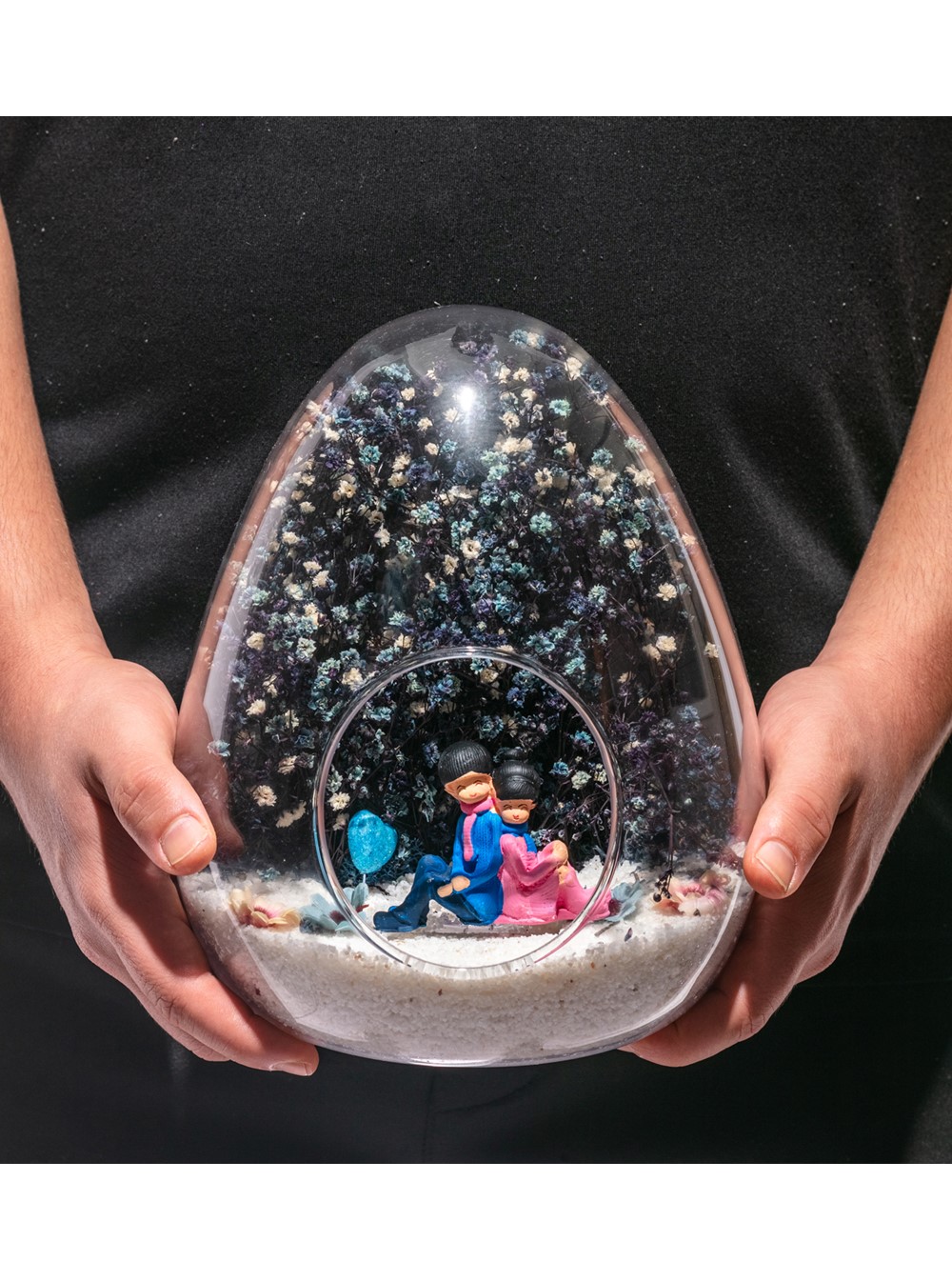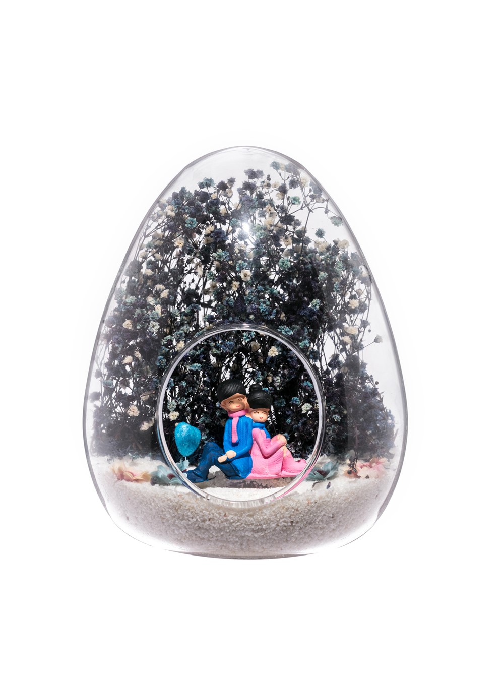 Küçük boy yumurta cam fanus içerisinde tasarladığımız bu özgün teraryum; beyaz kum, kurutulmuş bitkiler, şoklanmış yosunlar, bir adet simli kalp, renkli yapay mini çiçekler ve sırt sırta anı paylaşan sevgilileri simgeleyen obje kullanılarak tamamlanmıştır. Ev ve ofis ortamlarının tamamında sergilenebilir teraryumun içinde, kurutulmuş bitkiler olduğundan hava alması önemlidir. Açık olan kısmının kapatılmaması veya büfe vb. kapalı alanlara konulmaması gereklidir. Özellikle her ortamda, zevkle izlenebilecek özel bir teraryumdur. Yaklaşık Ölçüleri: 18x22cm NOT: Teraryumlarda kullanılan camlar, üfleme cam işçiliğiyle üretildiğinden bazı detaylarda farklılıklar gözlenebilir. Örneğin, ağız bitiş noktalarının her biri kendine özgüdür.