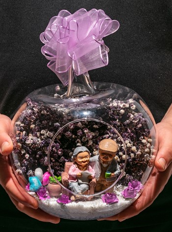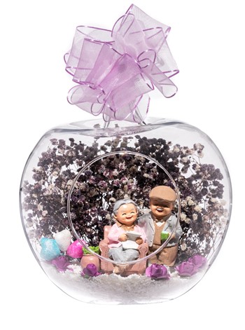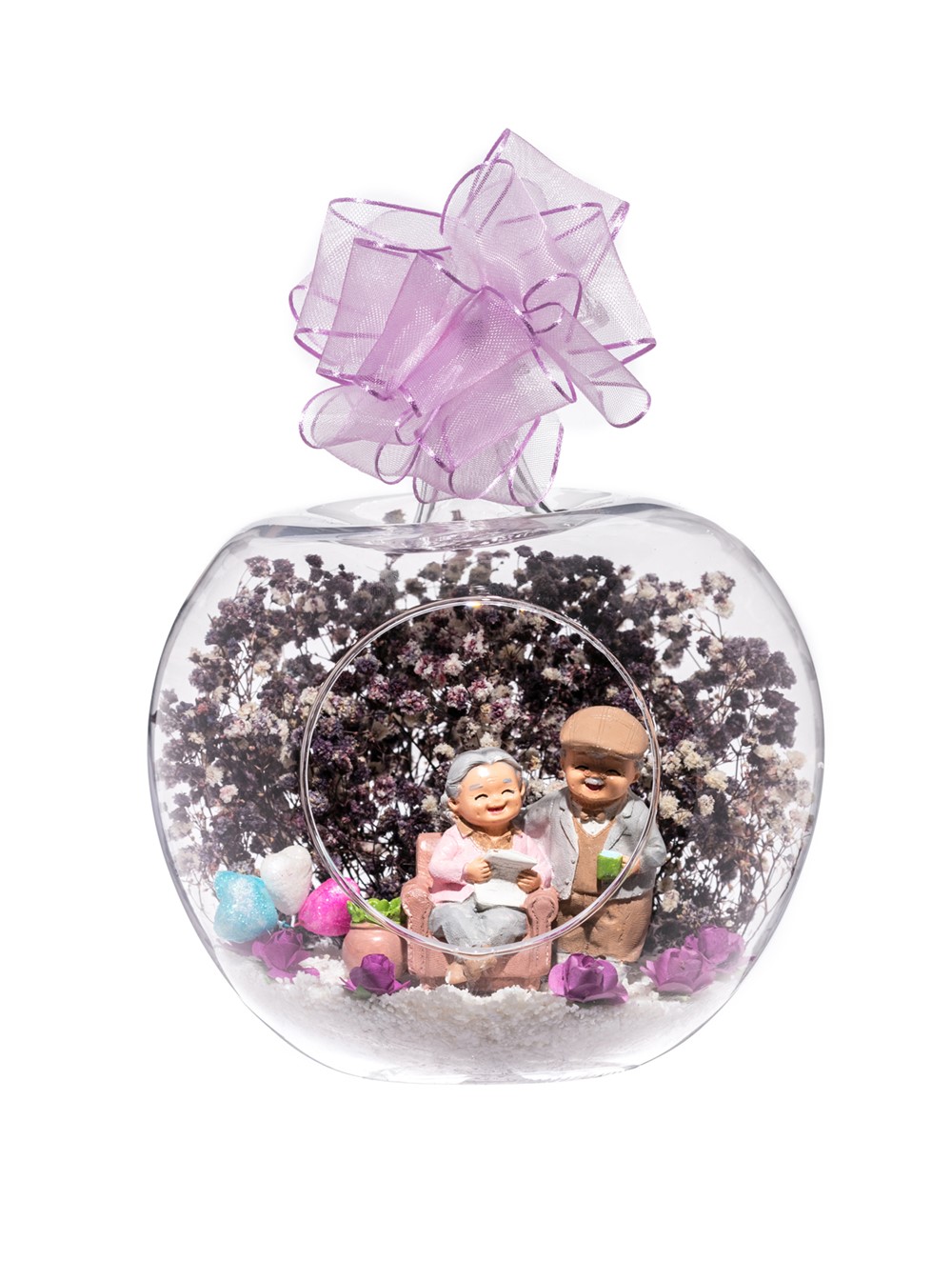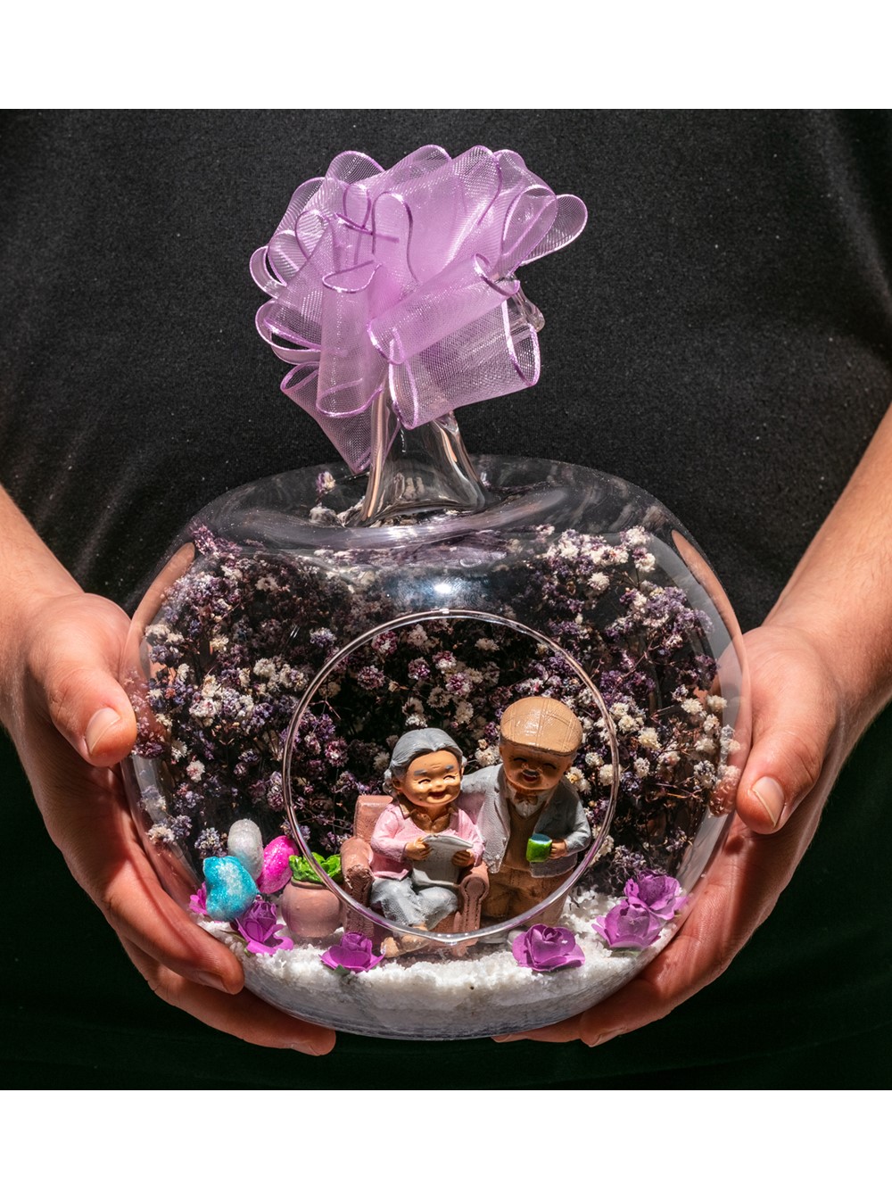 Küçük boy elma cam fanus içerisinde tasarladığımız bu kurdeleli teraryum; beyaz kum, yapay mini güller, renkli simli kalpler, kurutulmuş bitkilerle beraber bir adet yaşlı çifti simgeleyen objeyle tamamlanmıştır. Ev ve ofis ortamlarının tamamında sergilenebilir teraryumun içinde, kurutulmuş bitkiler bulunduğundan hava alması önemlidir. Açık olan kısmının kapatılmaması veya büfe vb. kapalı alanlara konulmaması gereklidir. Özellikle her ortamda, zevkle izlenebilecek çok özel bir teraryumdur. Yaklaşık Ölçüleri: 20x20cm NOT: Teraryumlarda kullanılan camlar, üfleme cam işçiliğiyle üretildiğinden bazı detaylarda farklılıklar gözlenebilir. Örneğin, sap kısmı ve ağız bitiş noktalarının her biri kendine özgüdür.