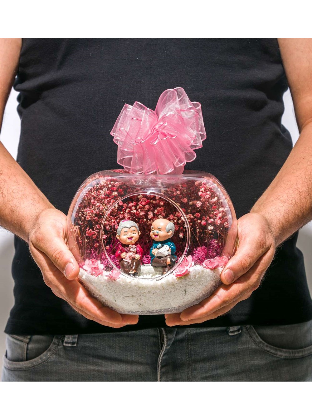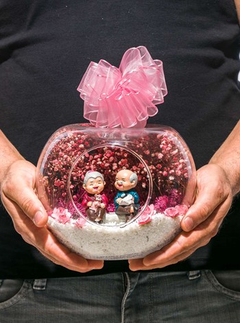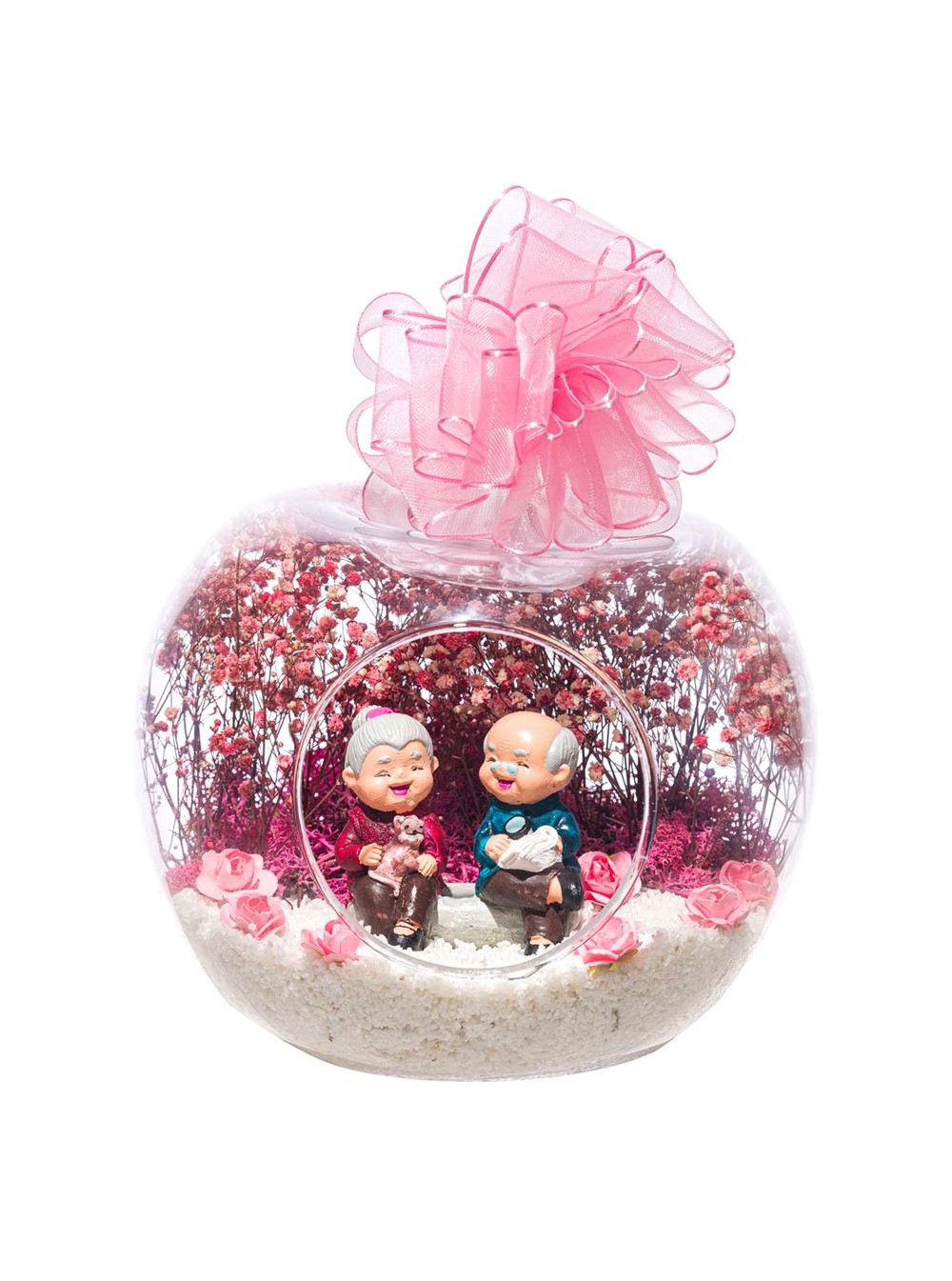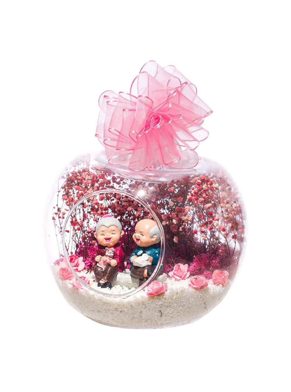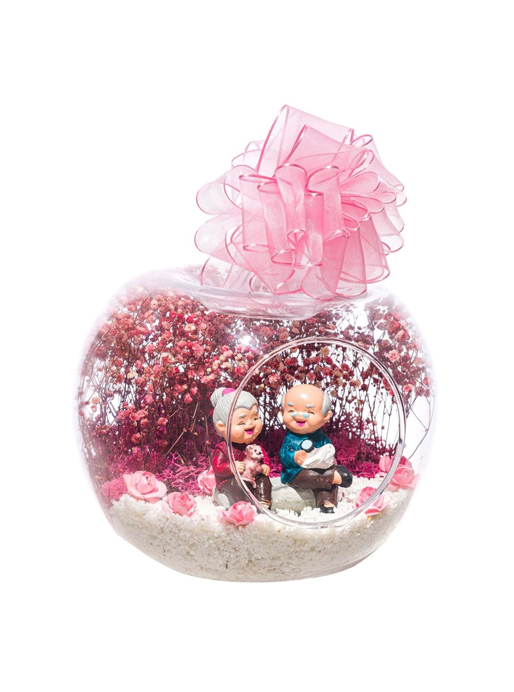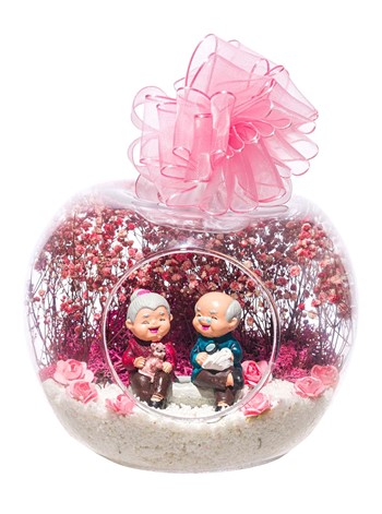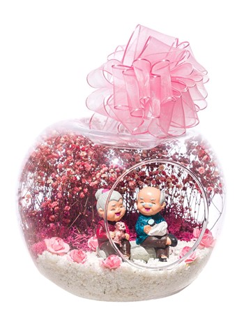 Küçük boy elma cam fanus içerisinde tasarladığımız bu anlamlı güzelteraryum; beyaz kum, şoklanmış yosunlar, kurutulmuş bitkiler, yapay çiçekler ve bir adet;mutlu anılarını hatırlayan olgun insanları simgeleyen objeyle tamamlanmıştır. Ev ve ofis ortamlarının tamamında sergilenebilir teraryumun içinde kurutulmuş ve şoklanmış bitkiler bulunduğundan hava alması önemlidir.Açık olan kısmının kapatılmaması veya büfe vb. kapalı alanlara konulmaması gereklidir. Özellikle her ortamda yıllarca, zevkle izlenebilecek özel bir teraryumdur. Yaklaşık Ölçüleri: 20x20cm NOT: Teraryumlarda kullanılan camlar, üfleme cam işçiliğiyle üretildiğinden bazı detaylarda farklılıklar gözlenebilir. Örneğin, sap kısmı ve ağız bitiş noktalarının her biri kendine özgüdür.
