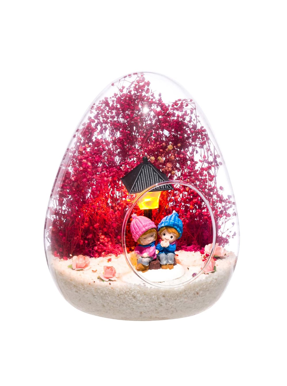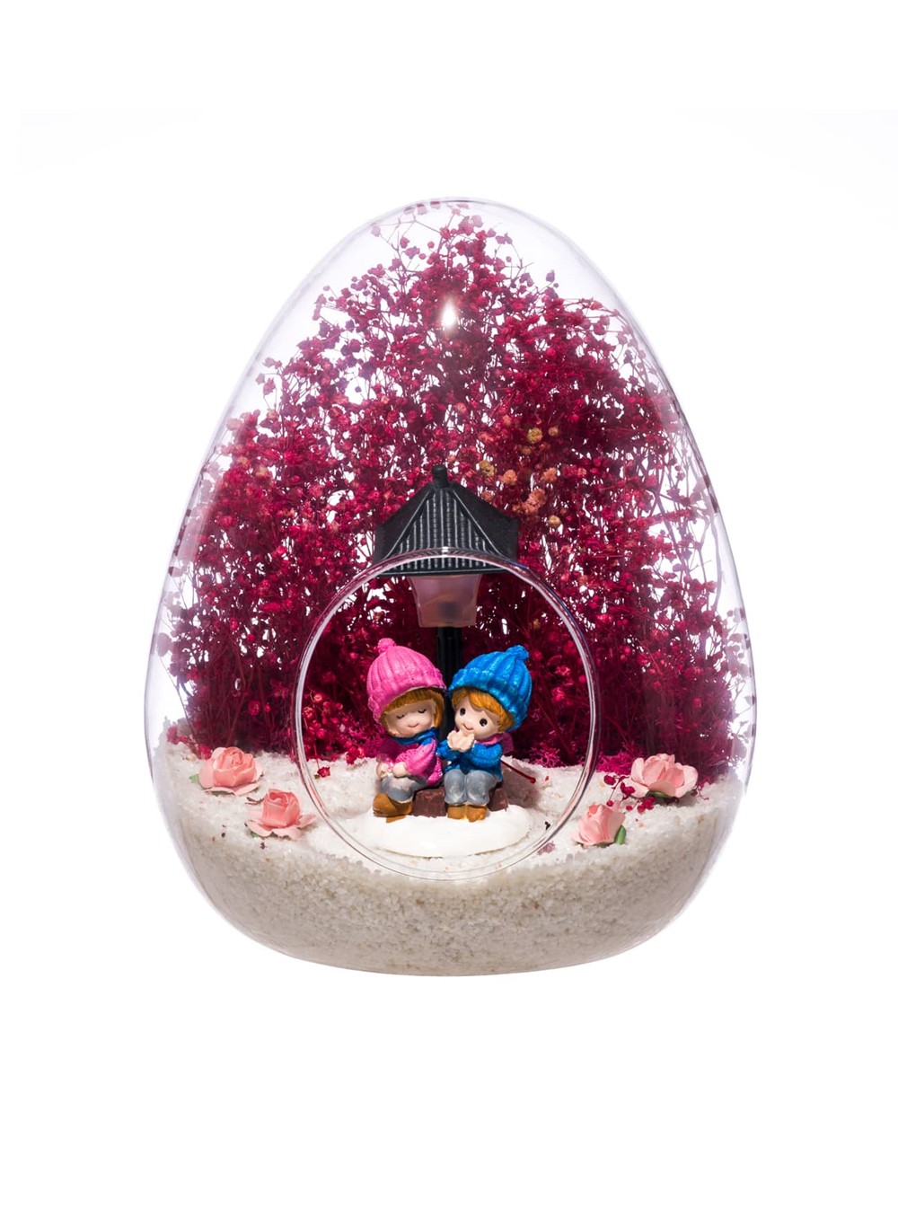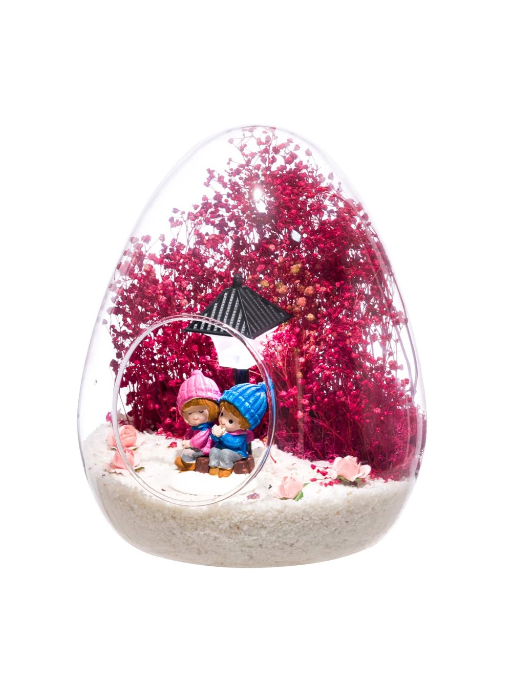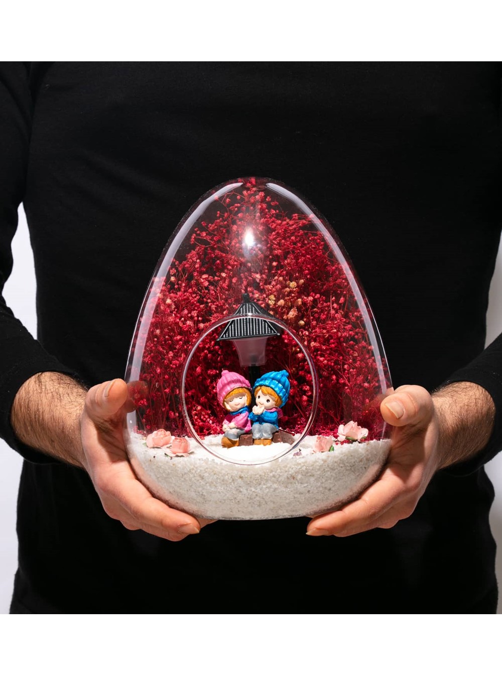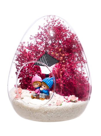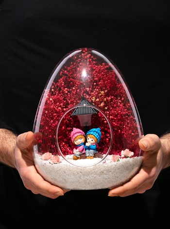 Küçük boy yumurta cam fanus içerisinde tasarladığımız bu güzel teraryum; beyaz kum, kurutulmuş bitkiler, şoklanmış yosunlar, yapay güller, bir adet ışığı iki farklı renkte yanan led sokak lambası görseli ve bir adet yan yananeşeyle sohbet eden aşıkları simgeleyen obje ile kurgulanmıştır. Ev ve ofis ortamlarının tamamında sergilenebilir teraryumun içinde, kurutulmuş ve şoklanmış bitkiler bulunduğundan hava alması önemlidir. Açık olan kısmının kapatılmaması veya büfe vb. kapalı alanlara konulmaması gereklidir. Özellikle her ortamda yıllarca, zevkle izlenebilecek özel bir teraryumdur. Yaklaşık Ölçüleri: 18x22cm NOT:Teraryumlarda kullanılan camlar, üfleme cam işçiliğiyle üretildiğinden bazı detaylarda farklılıklar gözlenebilir. Örneğin, yumurta şekli ve ağız bitiş noktalarının her biri kendine özgüdür. Teraryum Bitmeyen Aşkımız-Pembe