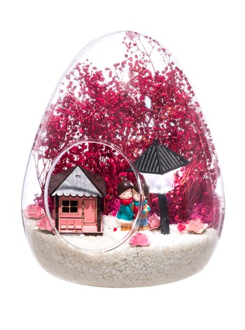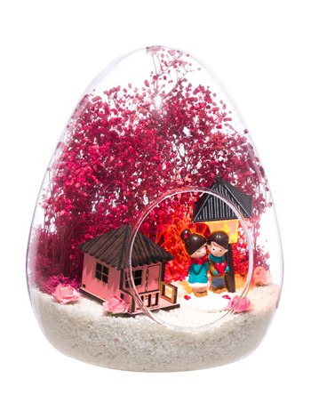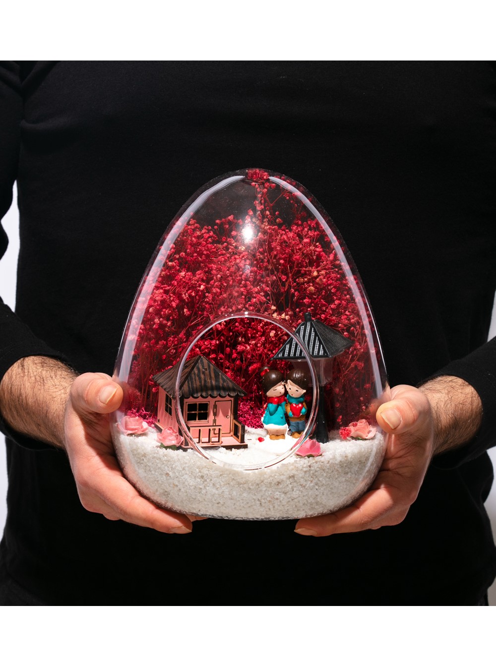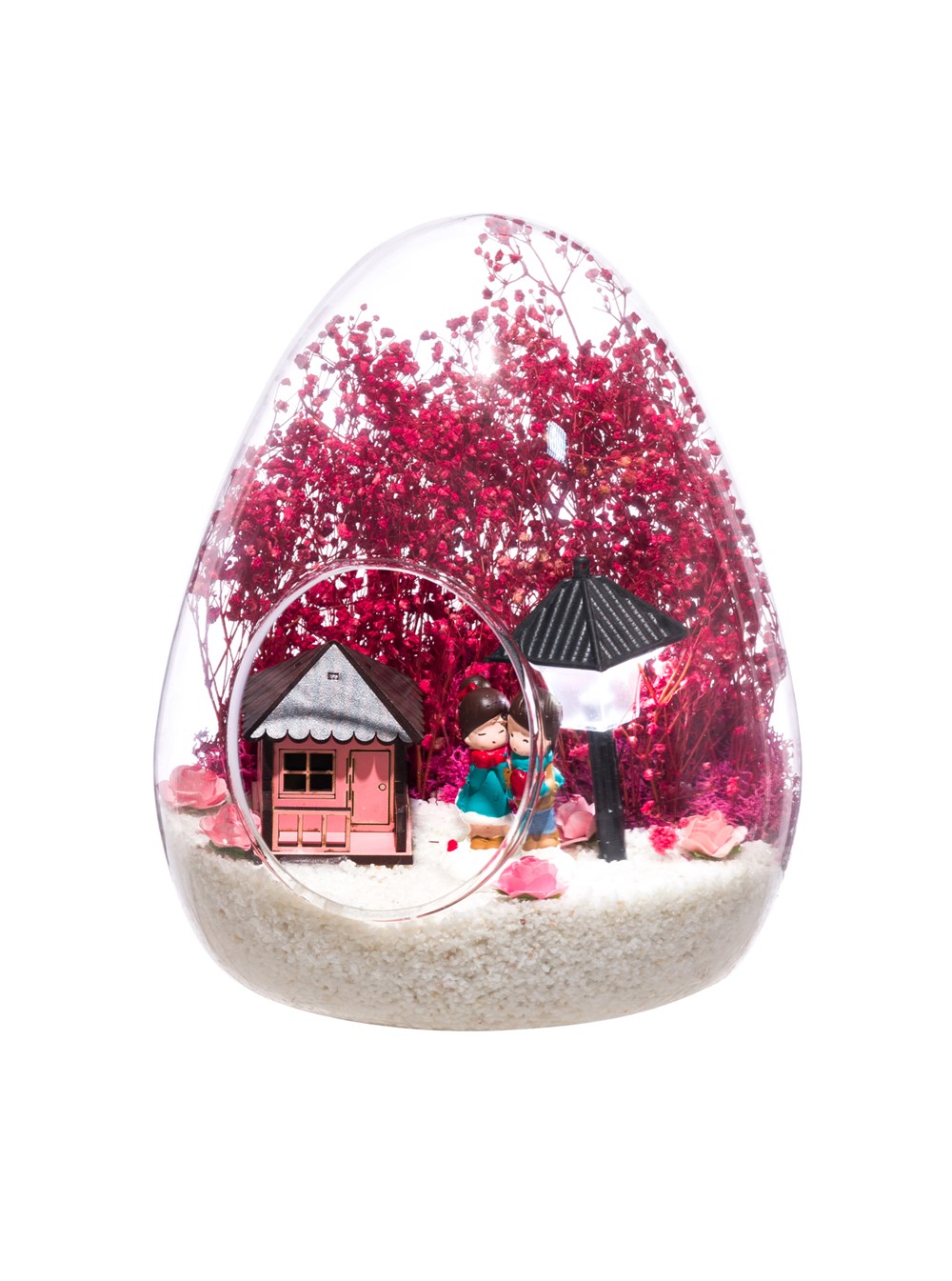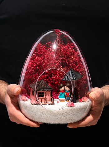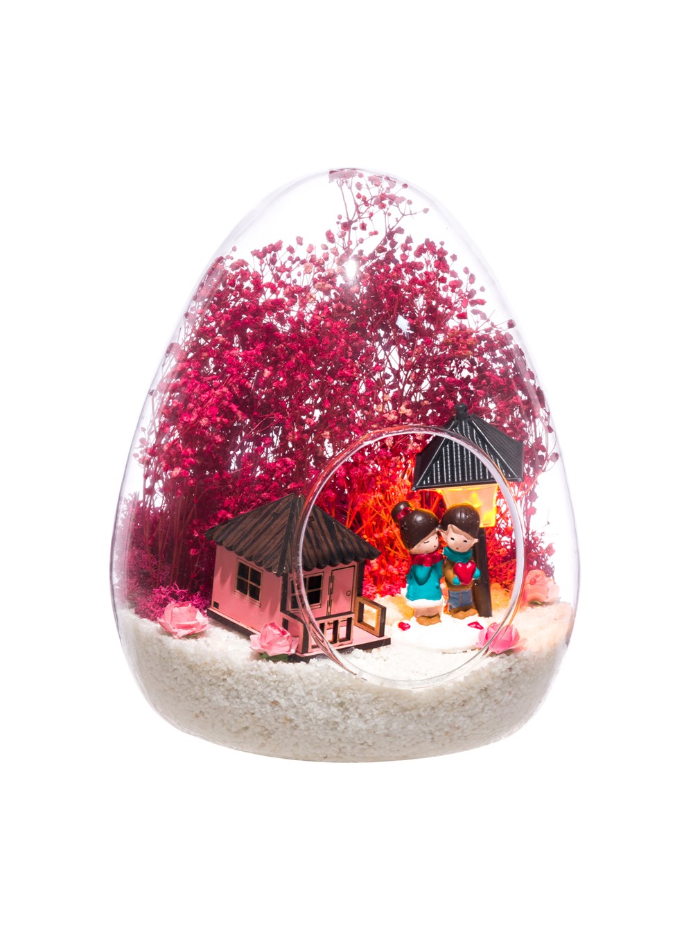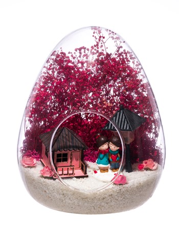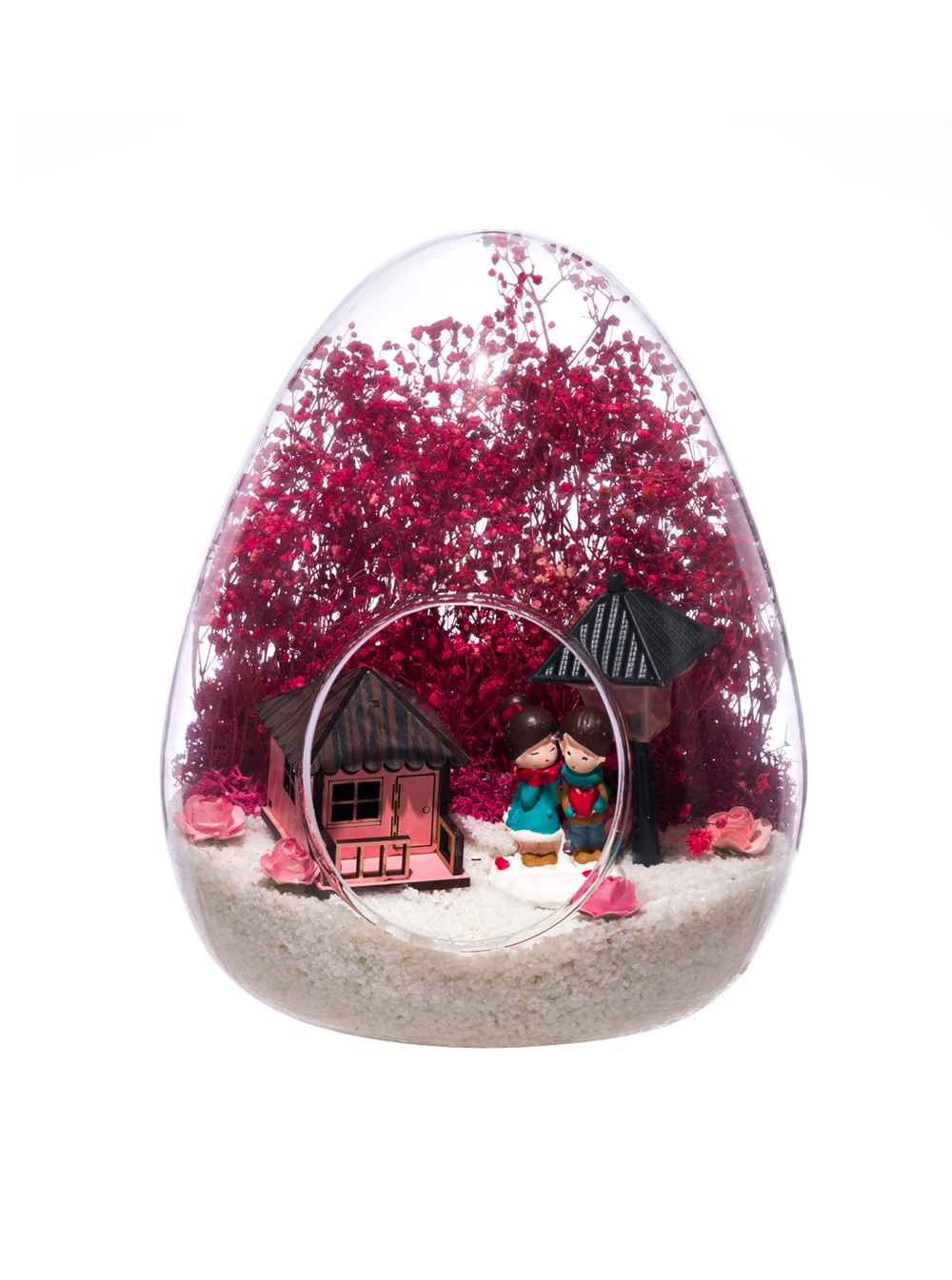 Küçük boy yumurta cam fanus içerisinde tasarladığımız bu güzel teraryum; beyaz kum, kurutulmuş bitkiler, şoklanmış yosunlar, yapay güller, bir adet pembe ahşap ev görseli, bir adet ışığı iki farklı renkte yanan led sokak lambası görseli ve bir adet yan yana sohbet eden sevgilileri simgeleyen obje kullanılarak tamamlanmıştır. Ev ve ofis ortamlarının tamamında sergilenebilir teraryumun içinde, kurutulmuş ve şoklanmış bitkiler bulunduğundan hava alması önemlidir. Açık olan kısmının kapatılmaması veya büfe vb. kapalı alanlara konulmaması gereklidir. Özellikle her ortamda yıllarca, zevkle izlenebilecek özel bir teraryumdur. Yaklaşık Ölçüleri: 18x22cm NOT: Teraryumlarda kullanılan camlar, üfleme cam işçiliğiyle üretildiğinden bazı detaylarda farklılıklar gözlenebilir. Örneğin, yumurta şekli ve ağız bitiş noktalarının her biri kendine özgüdür.