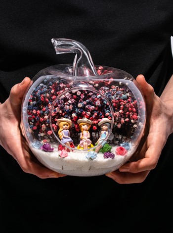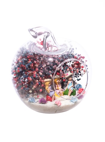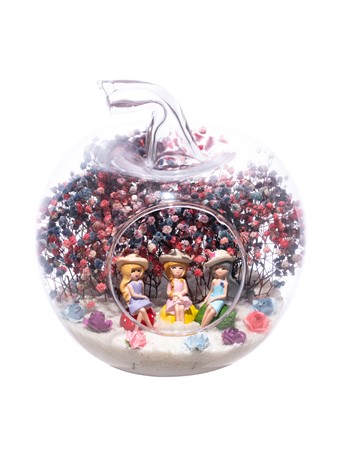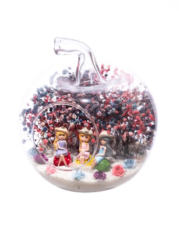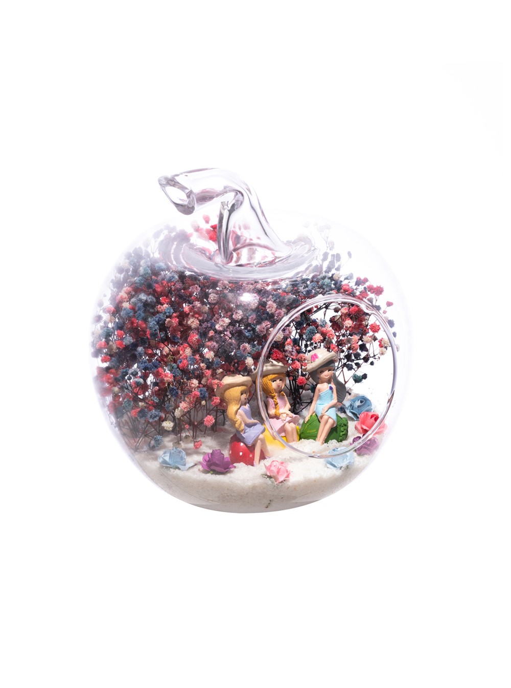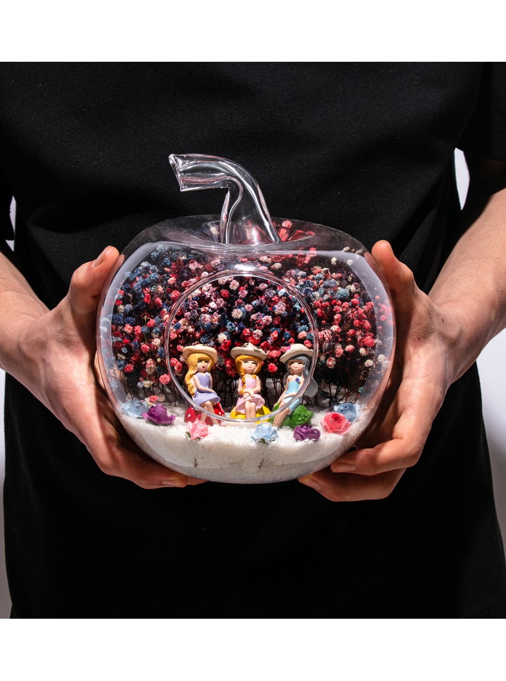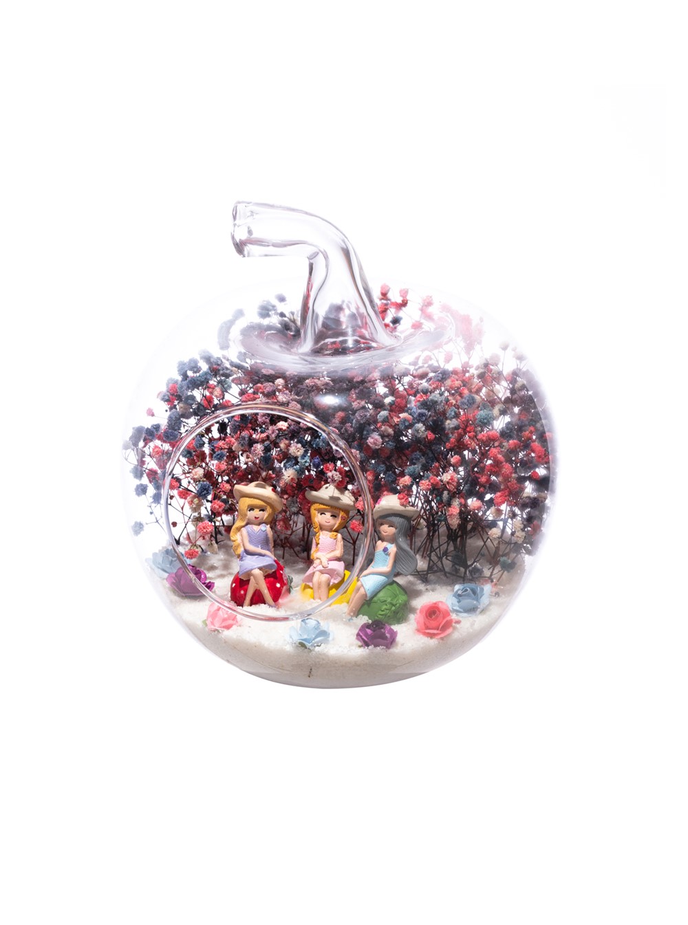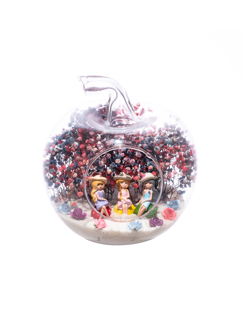 Küçük boy elma cam fanus içerisinde tasarladığımız bu çok güzel teraryum; beyaz kum, karışık renkli kurutulmuş bitkiler, renkli mini yapay güller ve beraber oturmuş sohbet eden üç adet genç kızı simgeleyen objeler kullanılarak tamamlanmıştır. Ev ve ofis ortamlarının tamamında sergilenebilir teraryumun içinde, kurutulmuş bitkiler bulunduğundan hava alması önemlidir. Açık olan kısmının kapatılmaması veya büfe vb. kapalı alanlara konulmaması gereklidir. Özellikle her ortamda yıllarca, zevkle izlenebilecek özel bir teraryumdur. Yaklaşık Ölçüleri: 20x20cm NOT: Teraryumlarda kullanılan camlar, üfleme cam işçiliğiyle üretildiğinden bazı detaylarda farklılıklar gözlenebilir. Örneğin, sap kısmı ve ağız bitiş noktalarının her biri kendine özgüdür.