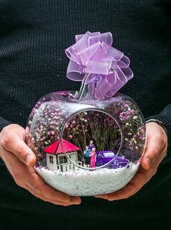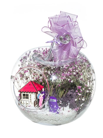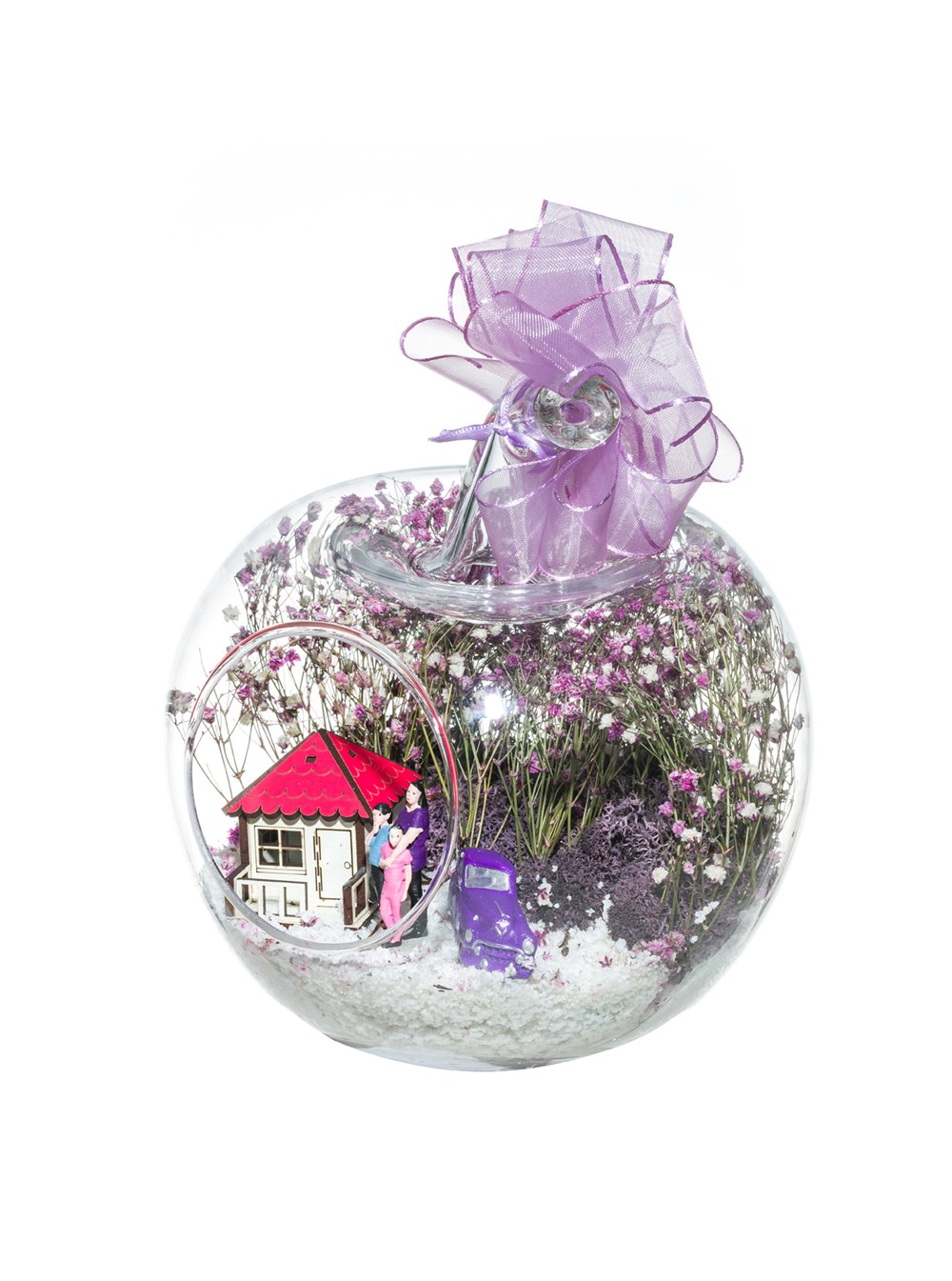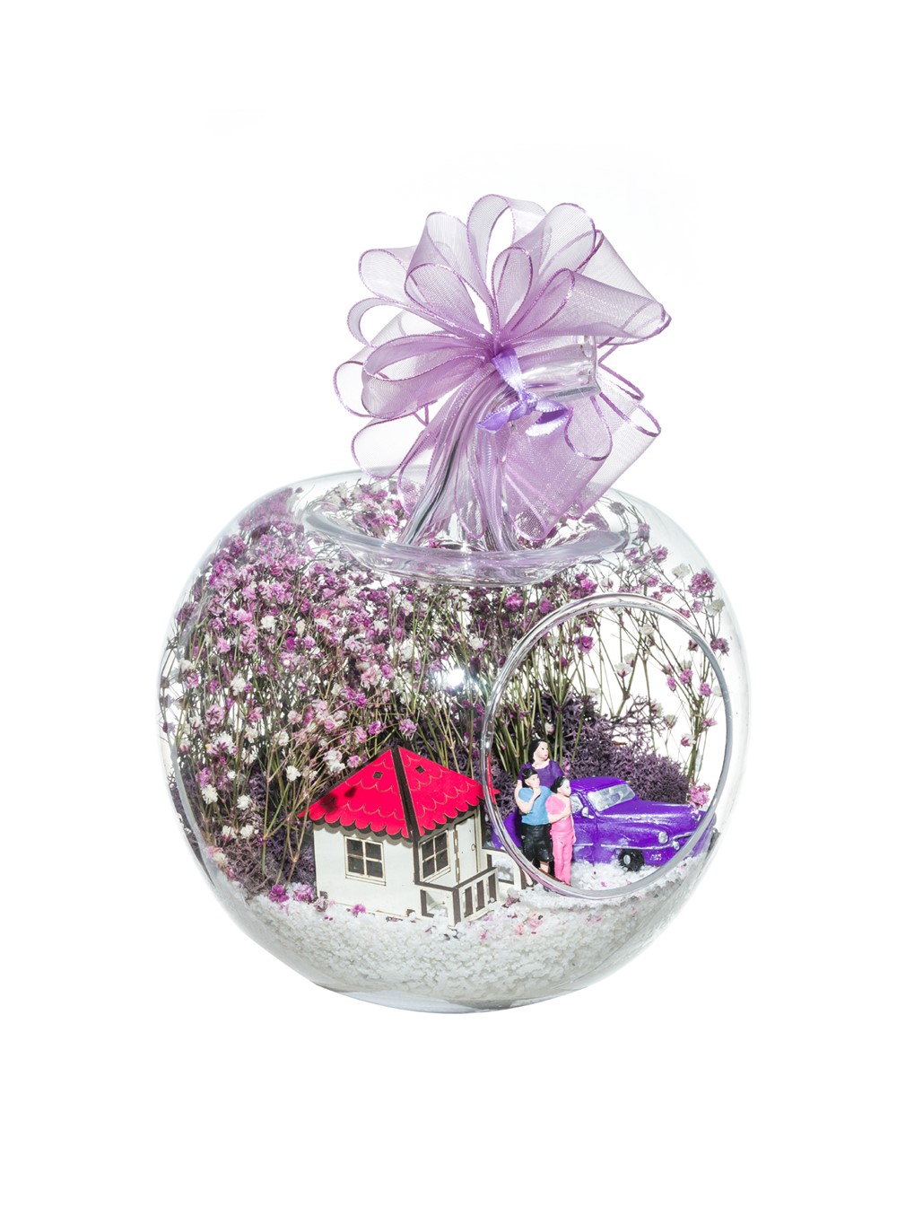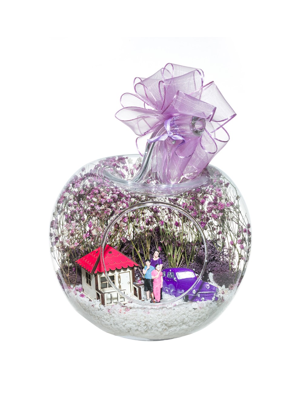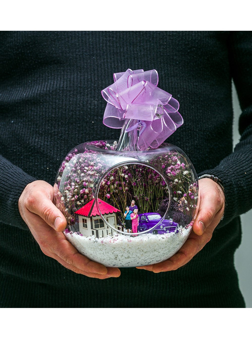 Kurdele takılmış küçük boy elma cam fanus içerisinde tasarladığımız bu çok anlamlı teraryum; beyaz kum, şoklanmış yosunlar, kurutulmuş bitkiler, bir adet antika otomobil görseli, bir adet ahşap beyaz ev ve bahçesinde çocuklarını sevgiyle sarmalamış bir anne görseli kullanılarak tamamlanmıştır. Ev ve ofis ortamlarının tamamında sergilenebilir teraryumun içinde, kurutulmuş ve şoklanmış bitkiler bulunduğundan hava alması önemlidir. Açık olan kısmının kapatılmaması veya büfe vb. kapalı alanlara konulmaması gereklidir. Özellikle her ortamda yıllarca, zevkle izlenebilecek özel bir teraryumdur. Yaklaşık Ölçüleri: 20x20cm NOT: Teraryumlarda kullanılan camlar, üfleme cam işçiliğiyle üretildiğinden bazı detaylarda farklılıklar gözlenebilir. Örneğin, sap kısmı ve ağız bitiş noktalarının her biri kendine özgüdür.