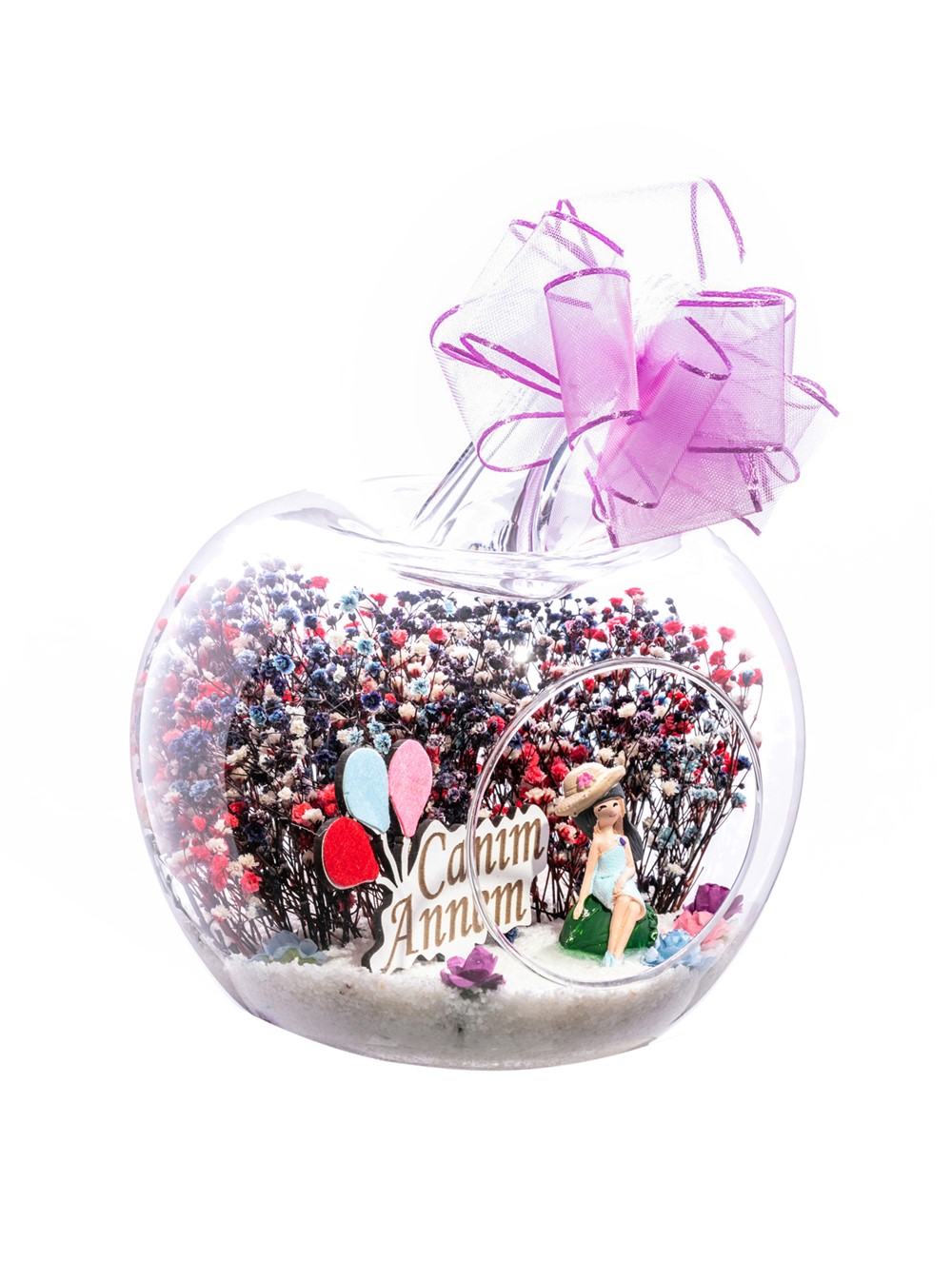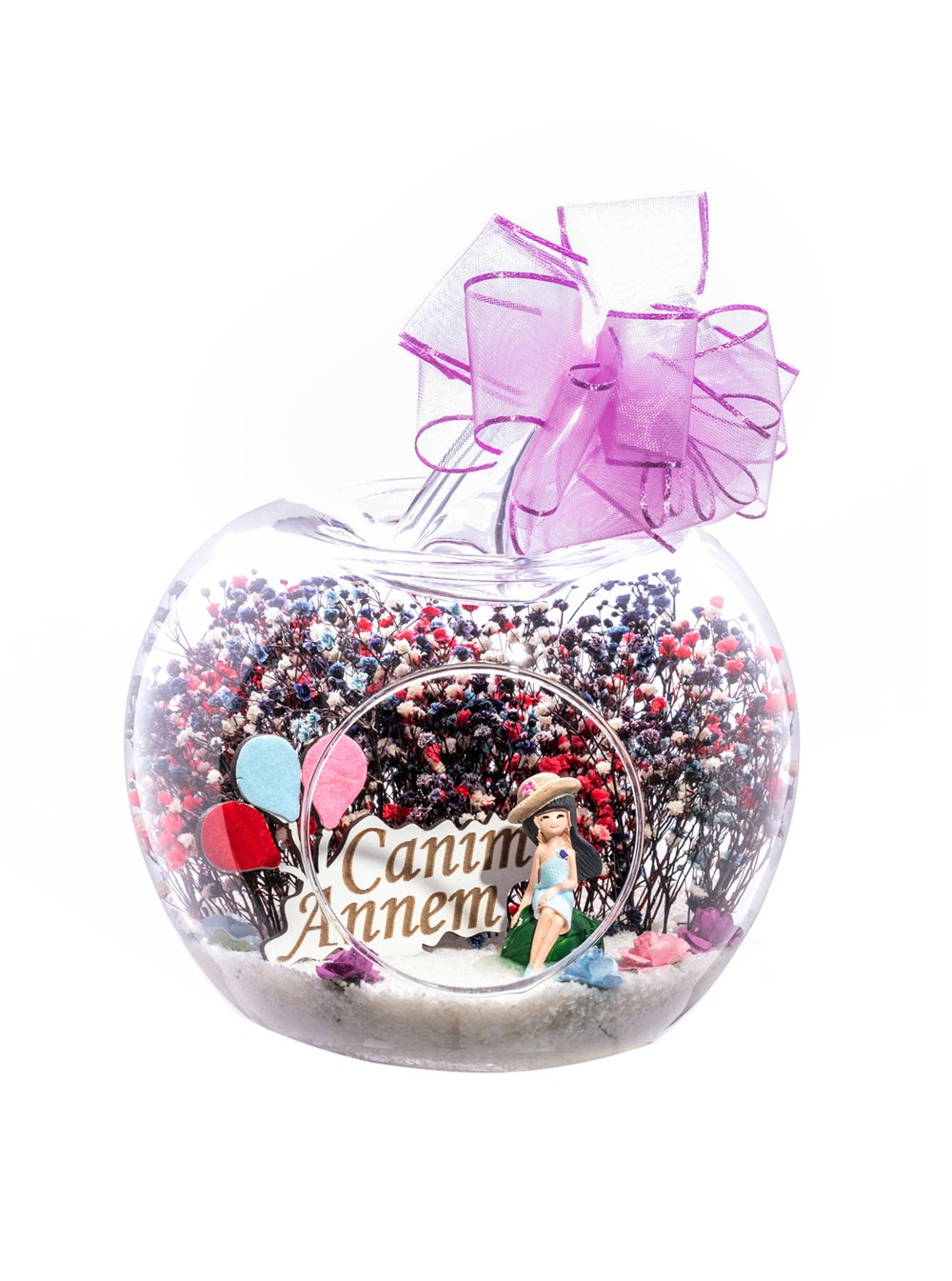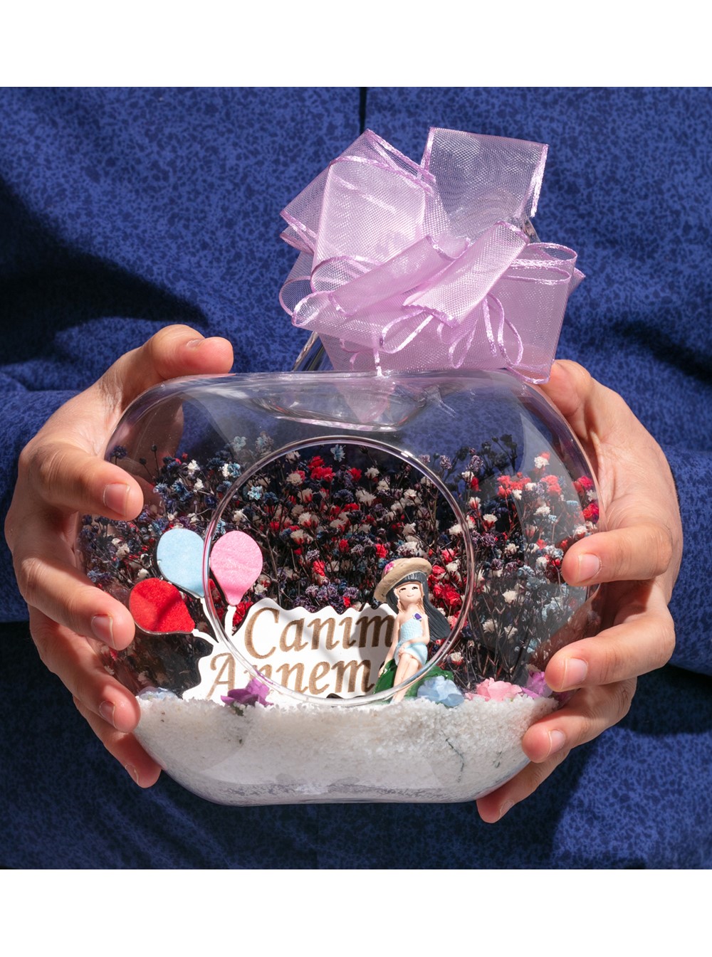 Küçük boy elma cam fanus içerisinde tasarladığımız bu kurdeleli güzel teraryum; beyaz kum, karışık renkli kurutulmuş bitkiler, renkli yapay mini güller, bir adet ahşap canım annem yazılı balonlu tabela ve bir adet mavi elbiseli genç kadını simgeleyen objeler kullanılarak tamamlanmıştır. Ev ve ofis ortamlarının tamamında sergilenebilir teraryumun içinde, kurutulmuş bitkiler bulunduğundan hava alması önemlidir. Açık olan kısmının kapatılmaması veya büfe vb. kapalı alanlara konulmaması gereklidir. Özellikle her ortamda yıllarca, zevkle izlenebilecek özel bir teraryumdur. Yaklaşık Ölçüleri: 20x20cm NOT: Teraryumlarda kullanılan camlar, üfleme cam işçiliğiyle üretildiğinden bazı detaylarda farklılıklar gözlenebilir. Örneğin, sap kısmı ve ağız bitiş noktalarının her biri kendine özgüdür.