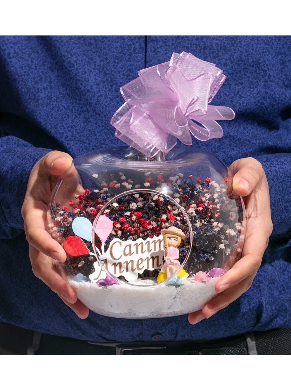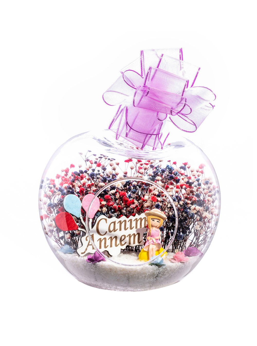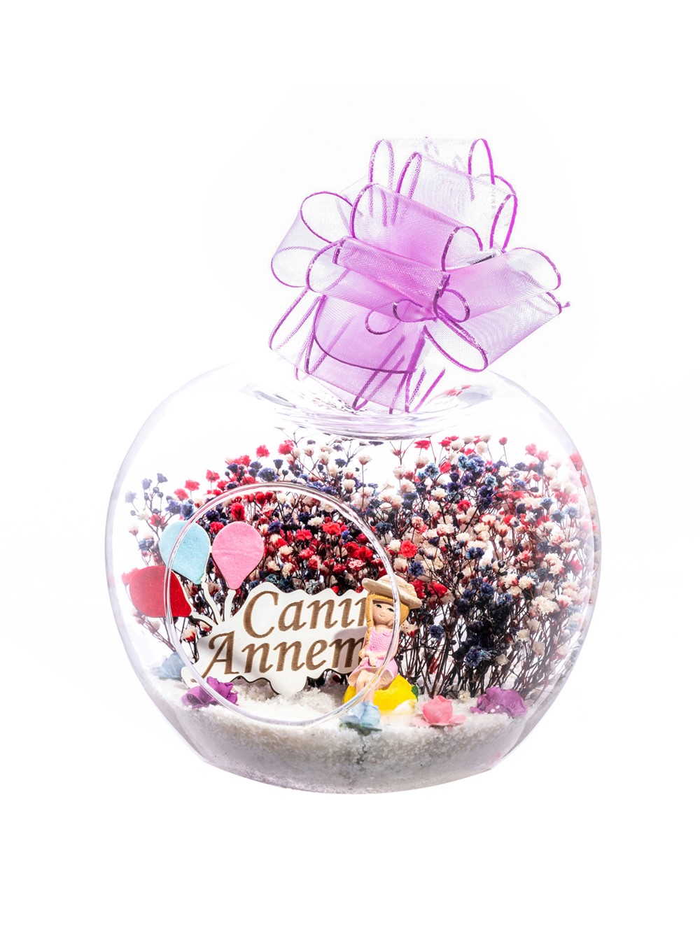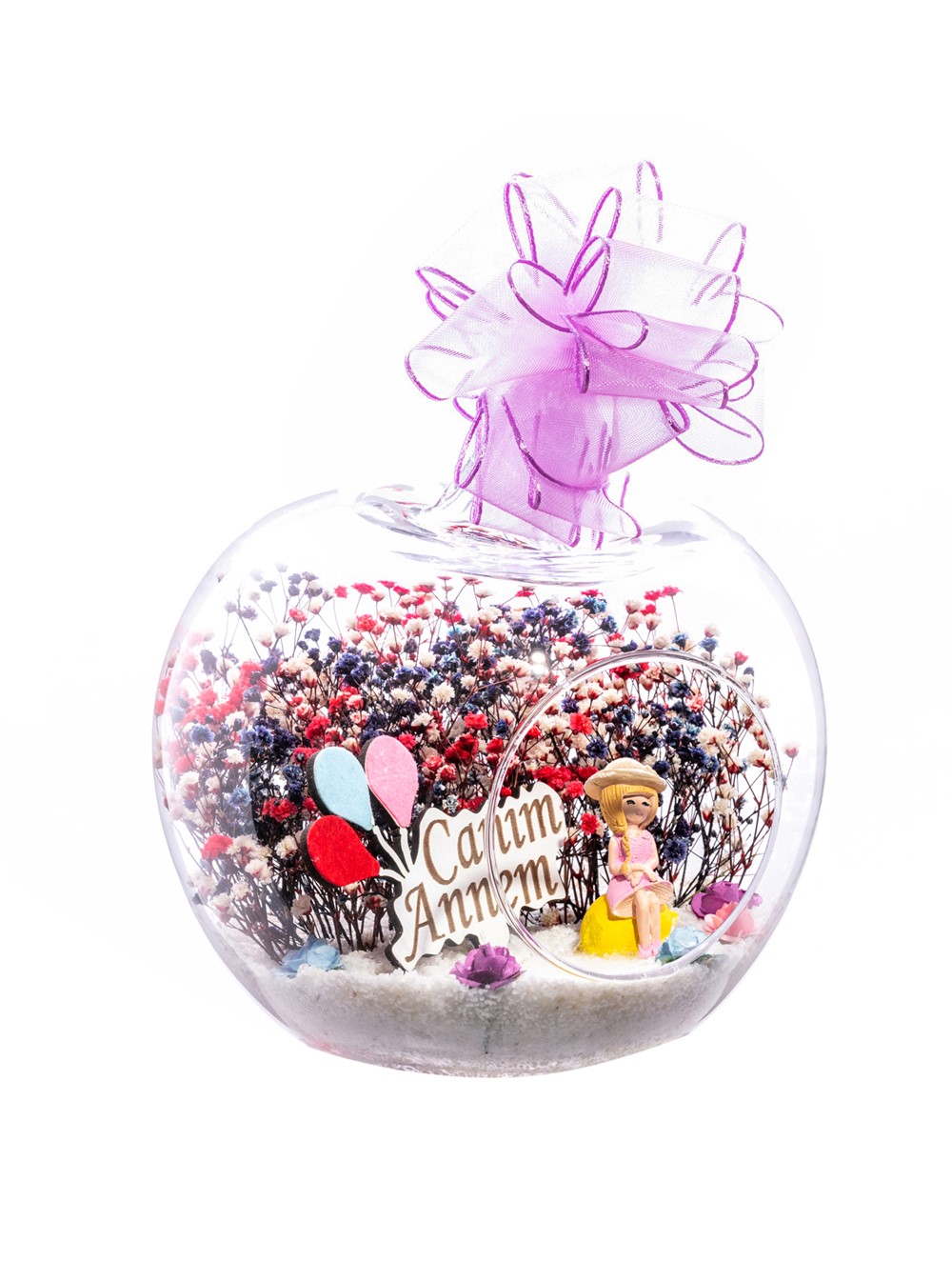 Küçük boy elma cam fanus içerisinde tasarladığımız bu kurdeleli güzel teraryum; beyaz kum, karışık renkli kurutulmuş bitkiler, renkli yapay mini güller, bir adet ahşap canım annem yazılı balonlu tabela ve bir adet lila elbiseli genç kadını simgeleyen objeler kullanılarak tamamlanmıştır. Ev ve ofis ortamlarının tamamında sergilenebilir teraryumun içinde, kurutulmuş bitkiler bulunduğundan hava alması önemlidir. Açık olan kısmının kapatılmaması veya büfe vb. kapalı alanlara konulmaması gereklidir. Özellikle her ortamda yıllarca, zevkle izlenebilecek özel bir teraryumdur. Yaklaşık Ölçüleri: 20x20cm NOT: Teraryumlarda kullanılan camlar, üfleme cam işçiliğiyle üretildiğinden bazı detaylarda farklılıklar gözlenebilir. Örneğin, sap kısmı ve ağız bitiş noktalarının her biri kendine özgüdür.